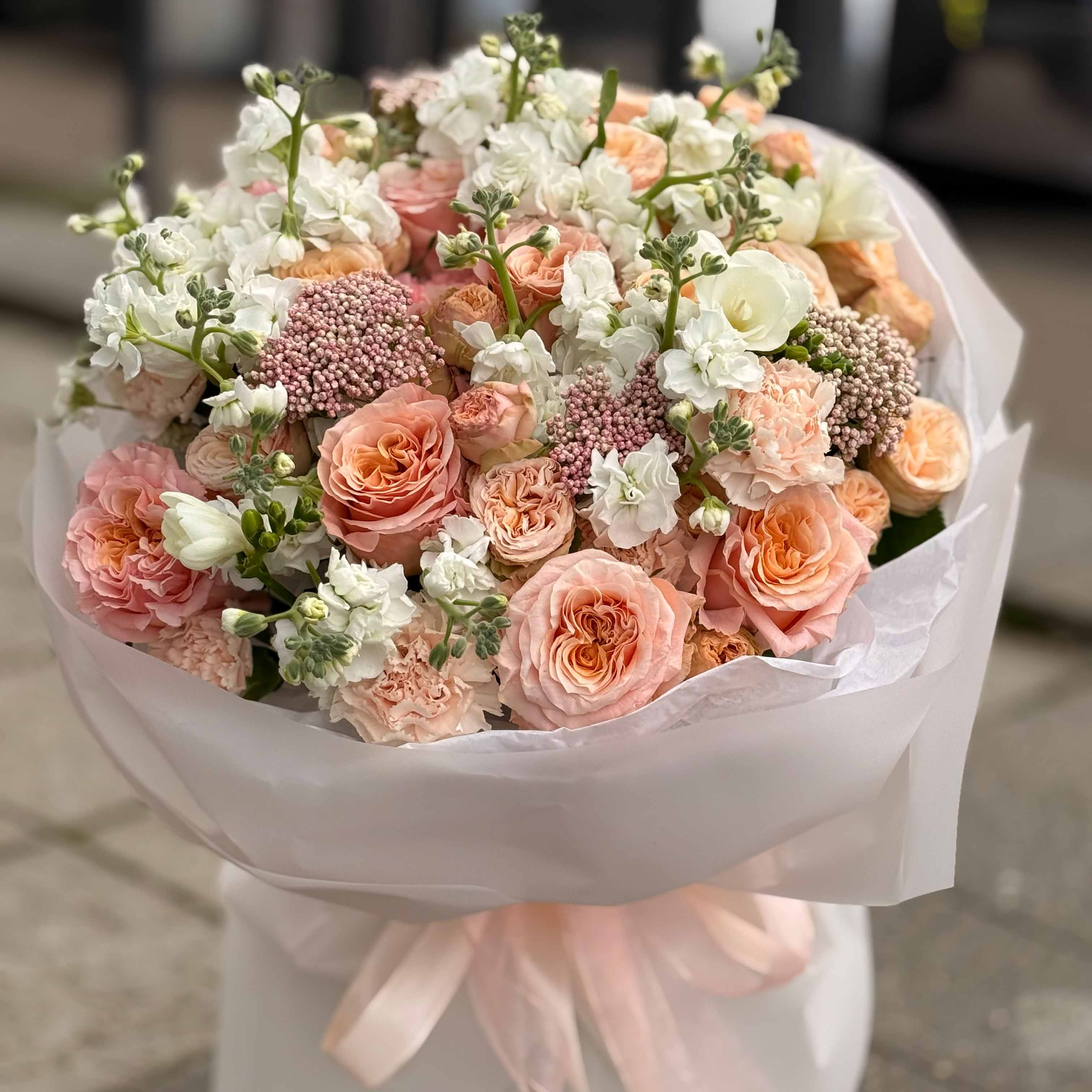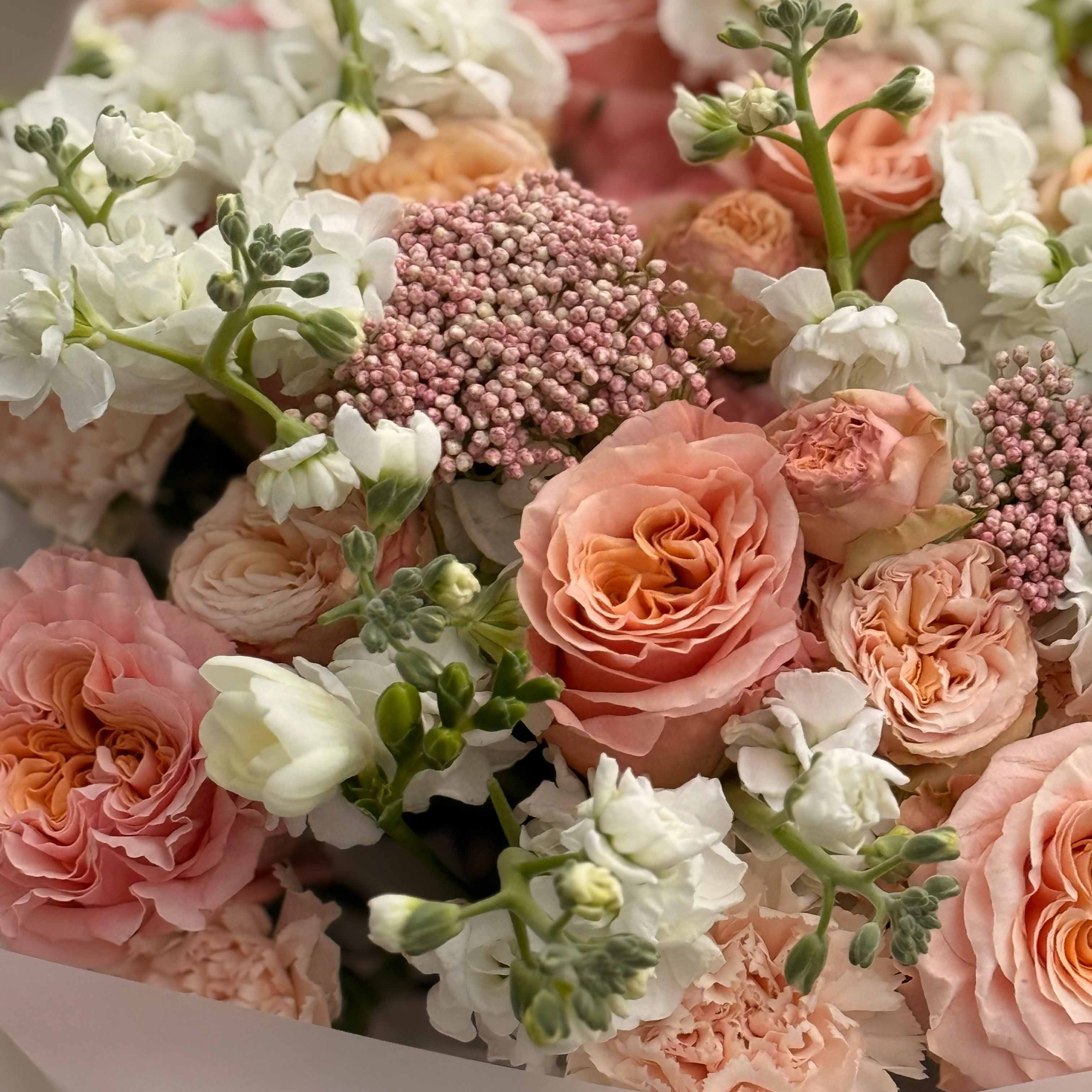 Состав: 10 розовых гвоздик, 7 роз Шиммер, 6 персиковых гвоздик, 6 кустовых пионовидных роз, 5 озотамнуса, 4 фрезии, 4 маттиолы и упаковка
