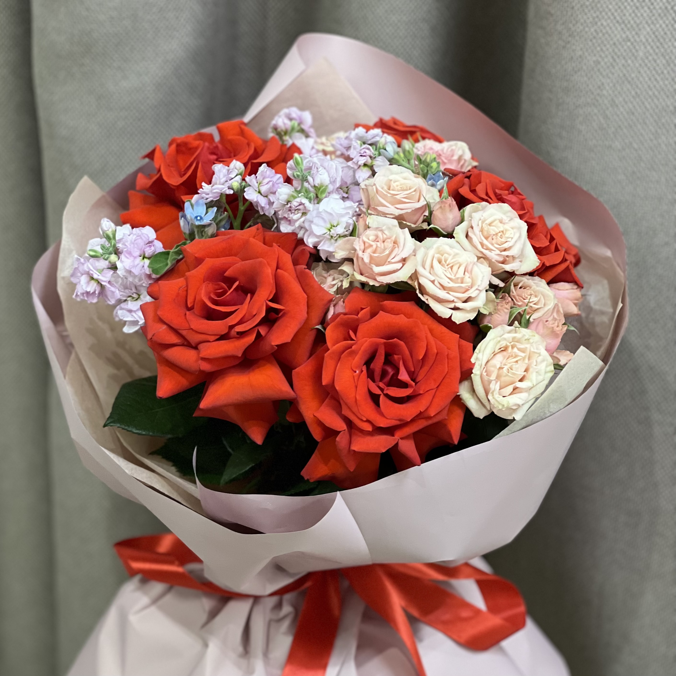 Состав: 5 французских роз, 2 маттиолы, 2 оксипеталума, 2 кустовые розы и упаковка.