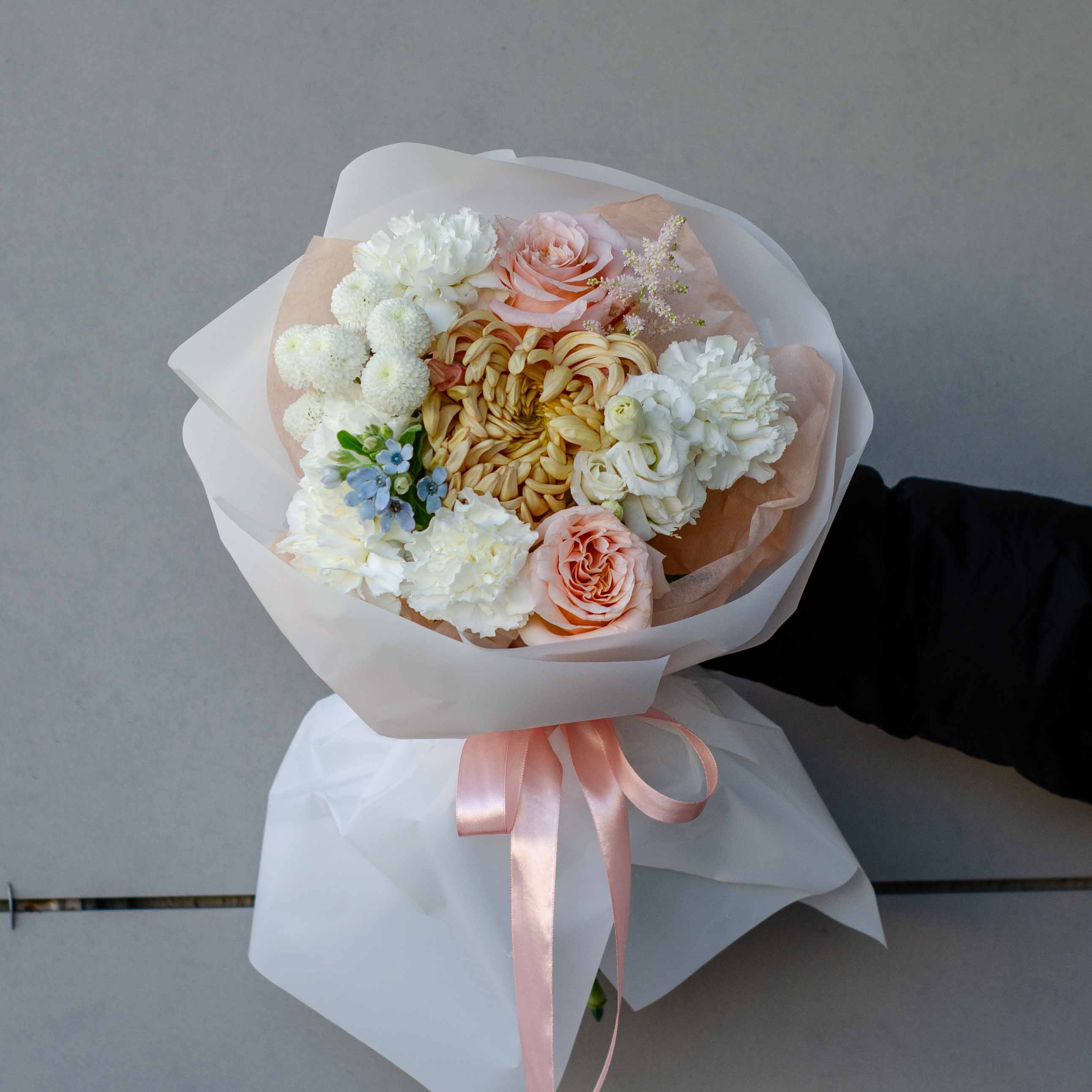 Состав: 2 розы Шиммер, 1 хризантема ньютон, 5 гвоздик, 1 оксипеталум , 1 астильба, 1 хризантема Виена Купер,1 белая эустома и упаковка