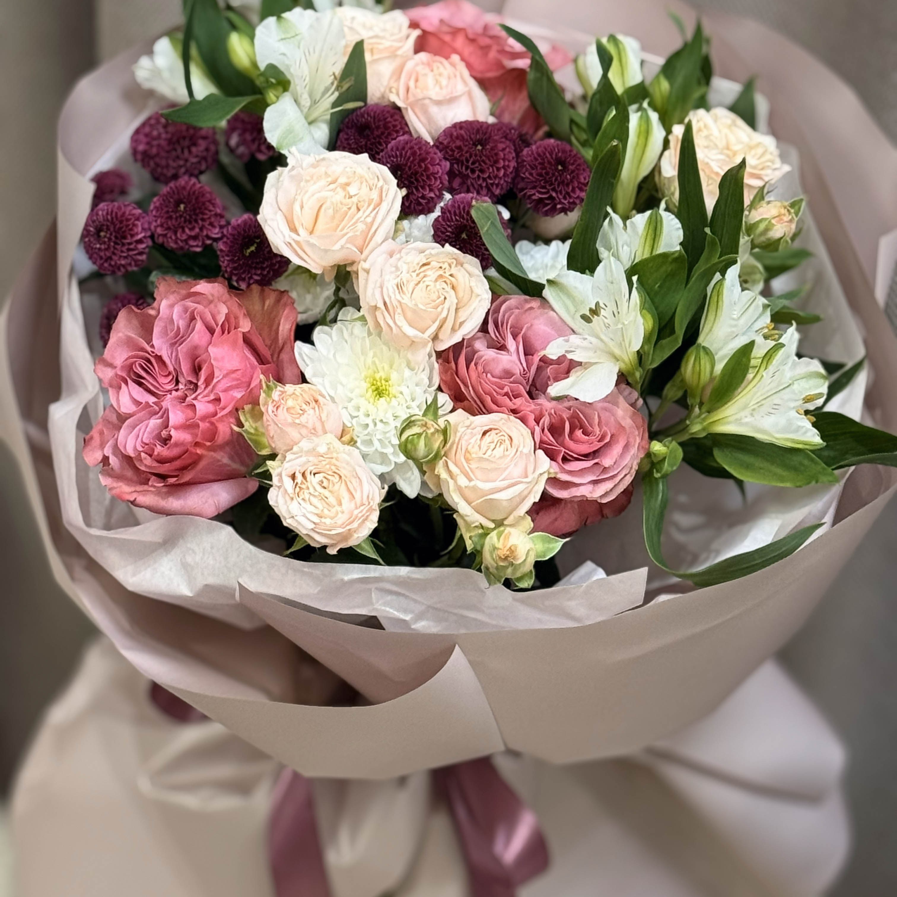Состав:3 Кантри Блюз, 3 альстромерии, 2 кустовые розы Бомбастик, 2 хризантемы сантини, 1 Алтай и упаковка