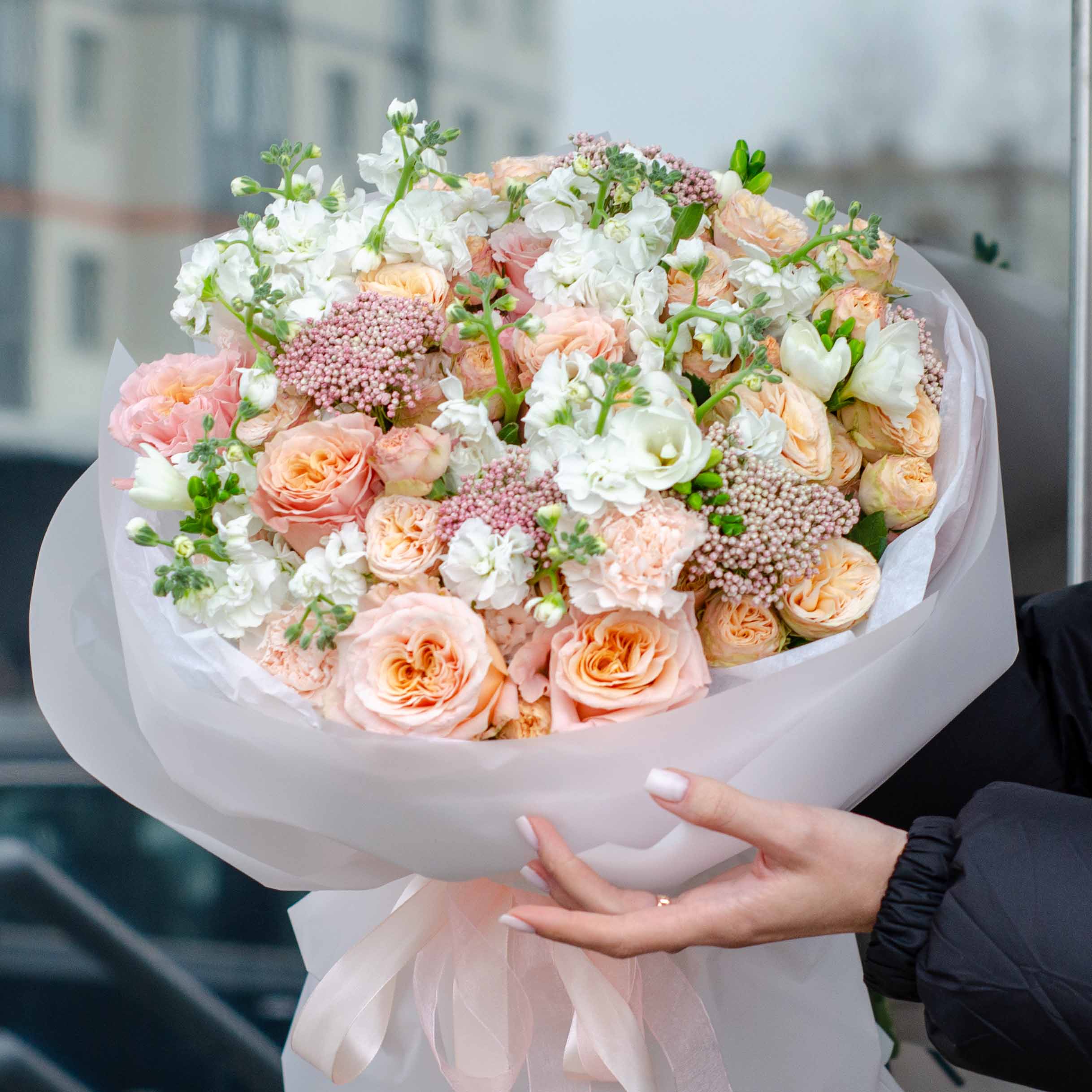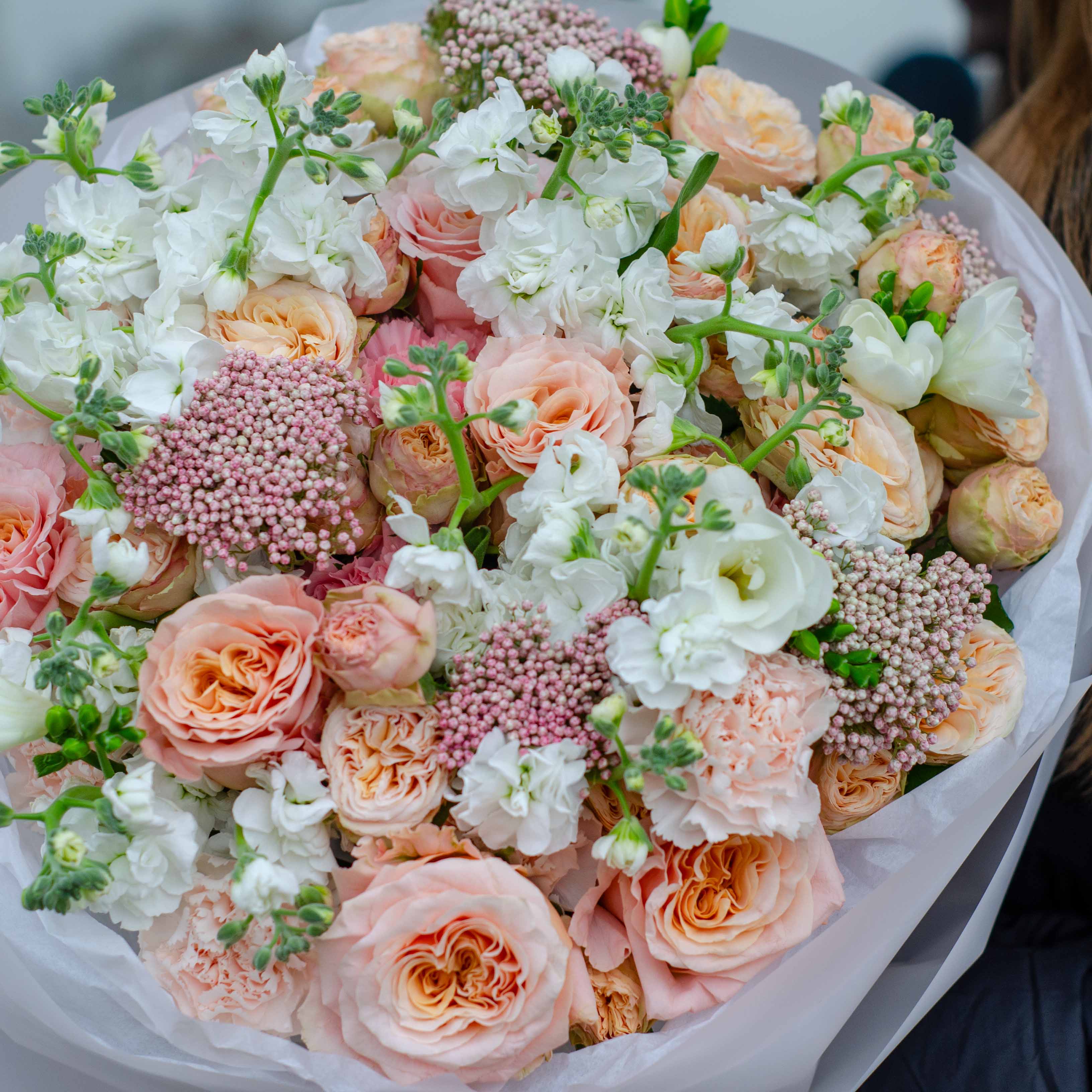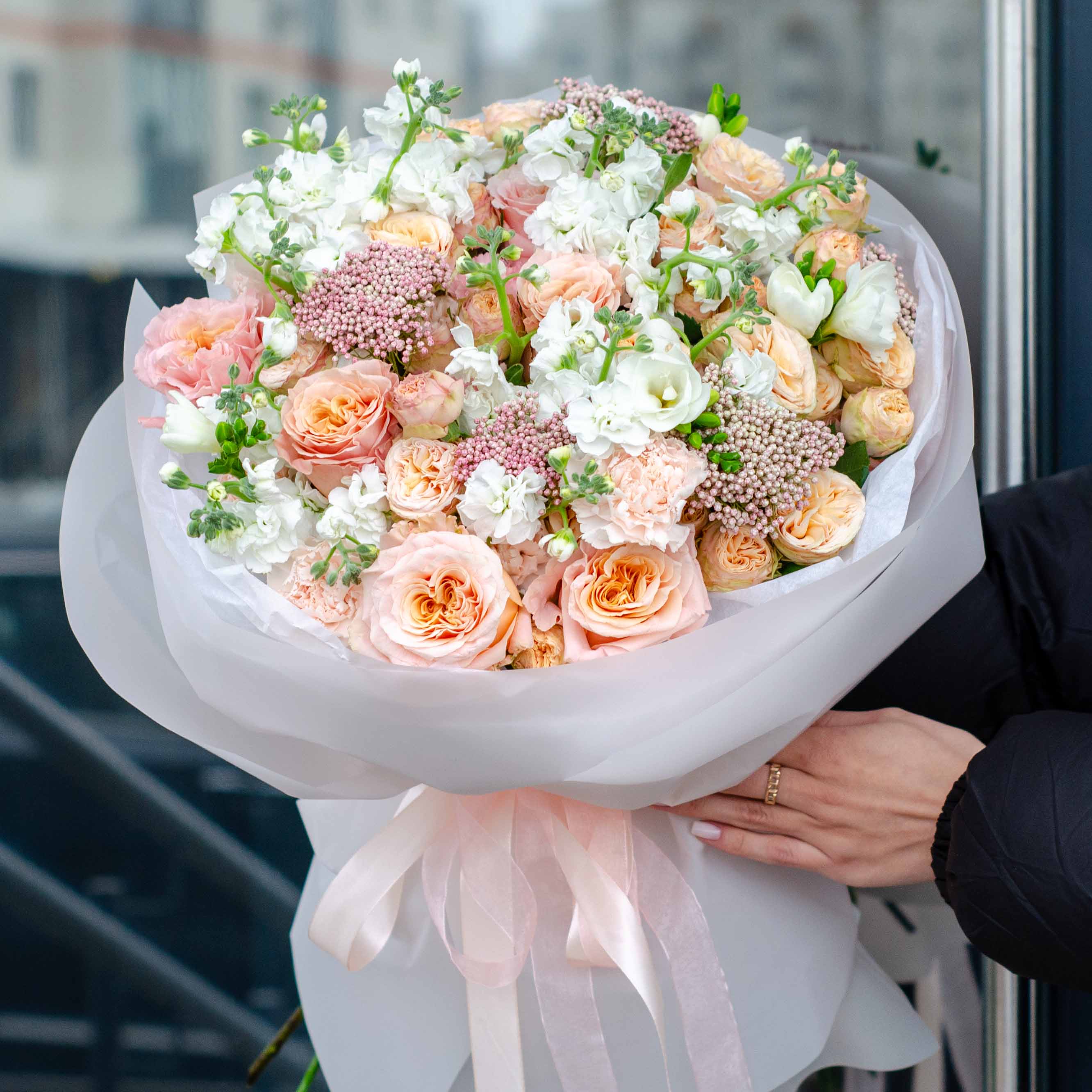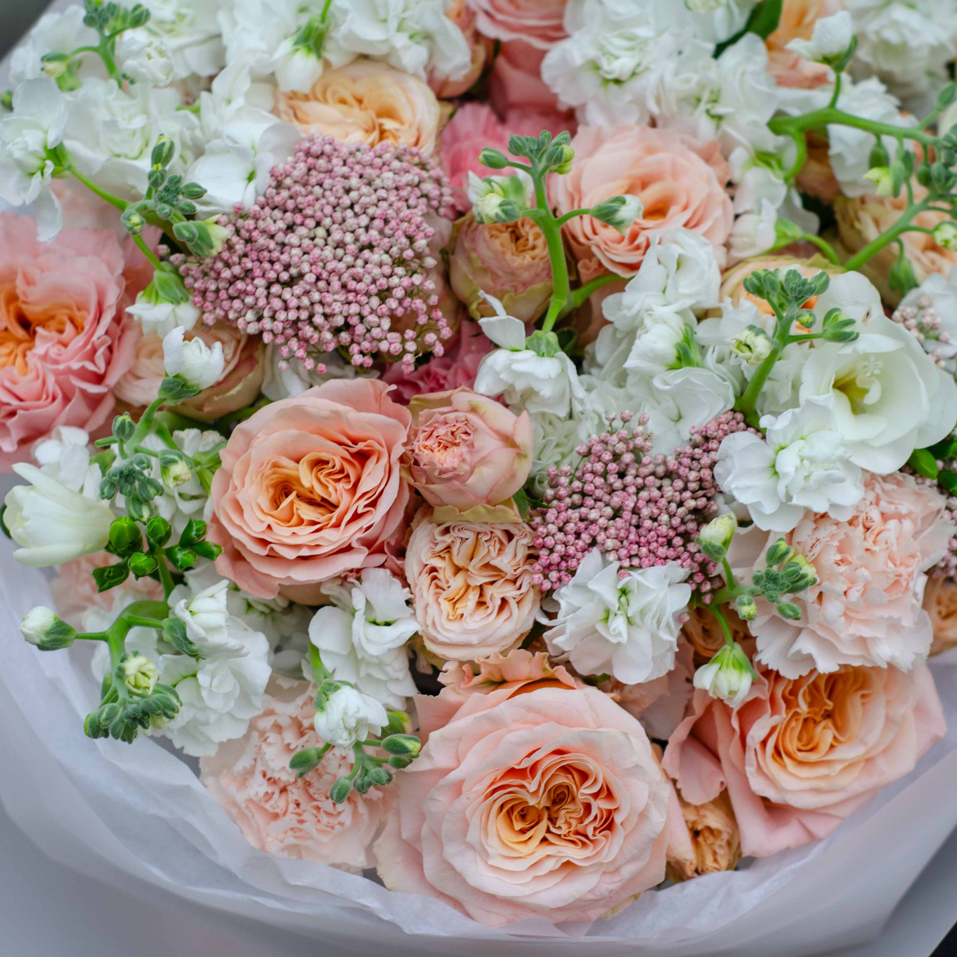 Состав: 10 розовых гвоздик, 7 роз Шиммер, 6 персиковых гвоздик, 6 кустовых пионовидных роз, 5 озотамнуса, 4 фрезии, 4 маттиолы и упаковка