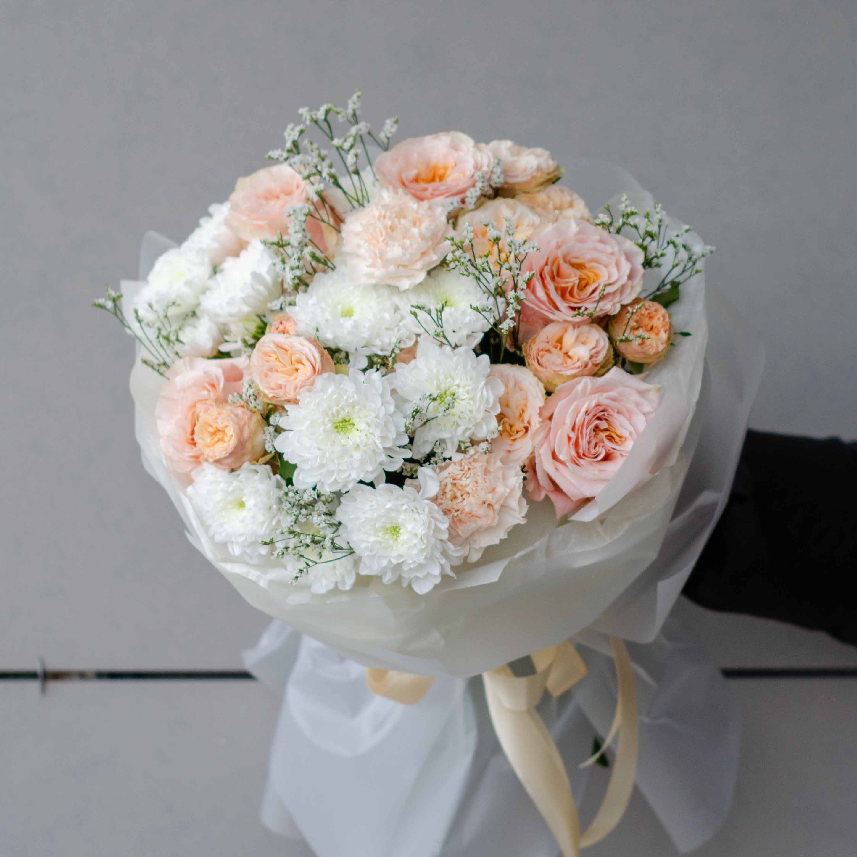 Состав: хризантема Алтай 3, 5 роз Шиммер, 4 гвоздики, 3 кустовые розы Джентл, Лимониум и упаковка.