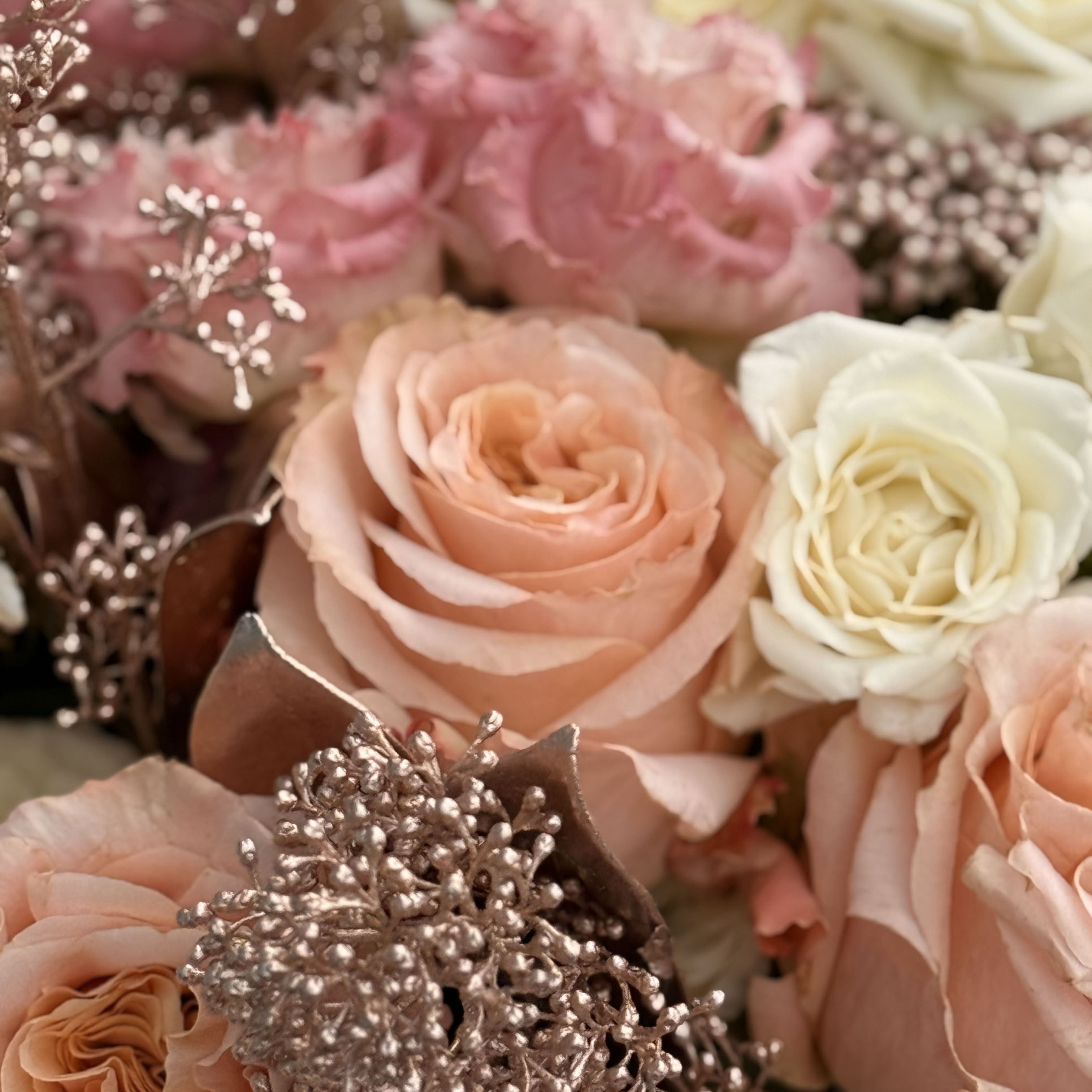 Состав: 1 скиммия, 5 роз Шиммер, 3 кустовые розы, 2 эустомы, 2 озотамнуса и упаковка