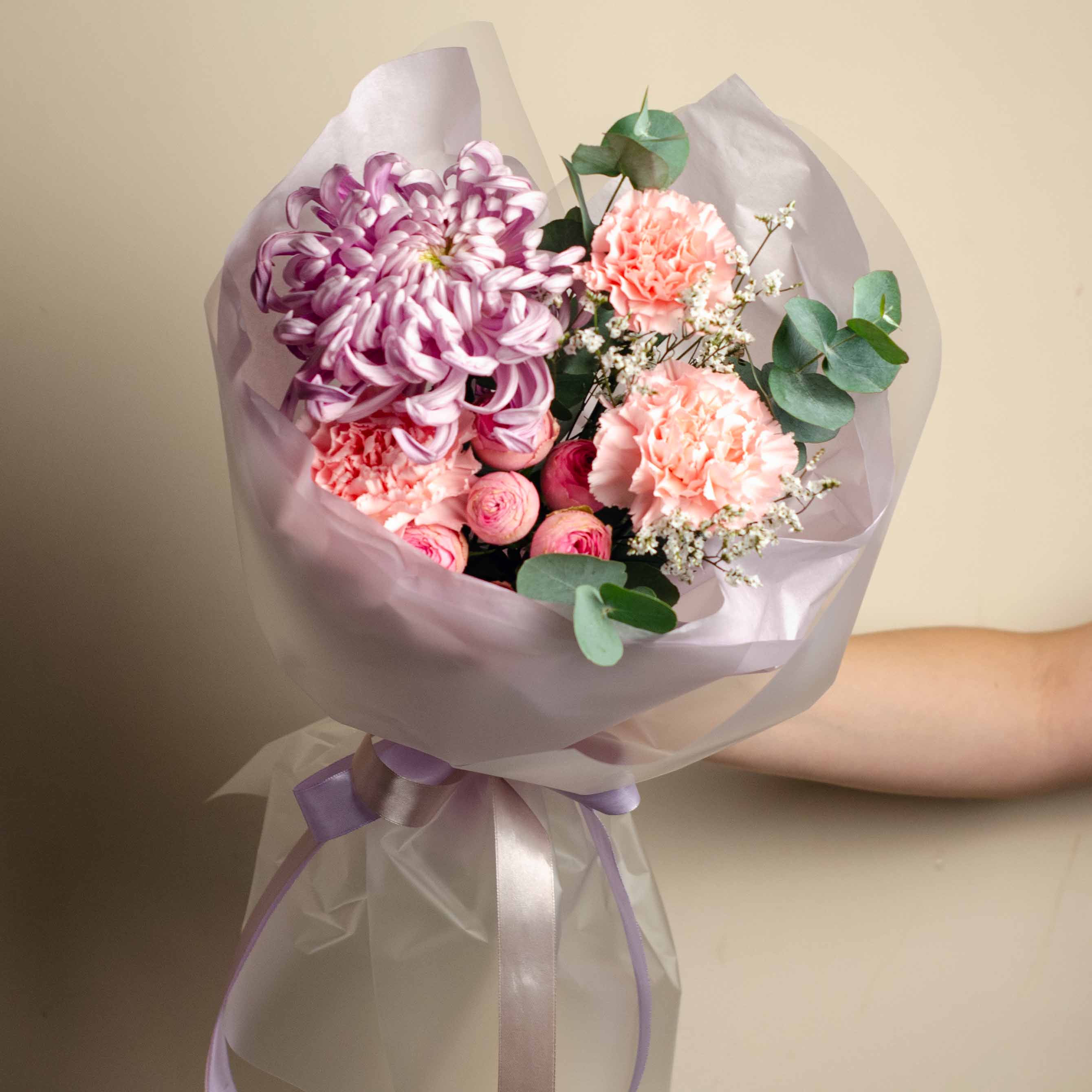 Состав: 1 хризантема Виена Пинк, 3 гвоздики, 1 кустовая роза Жизель, 1 лимониум, эвкалипт и упаковка