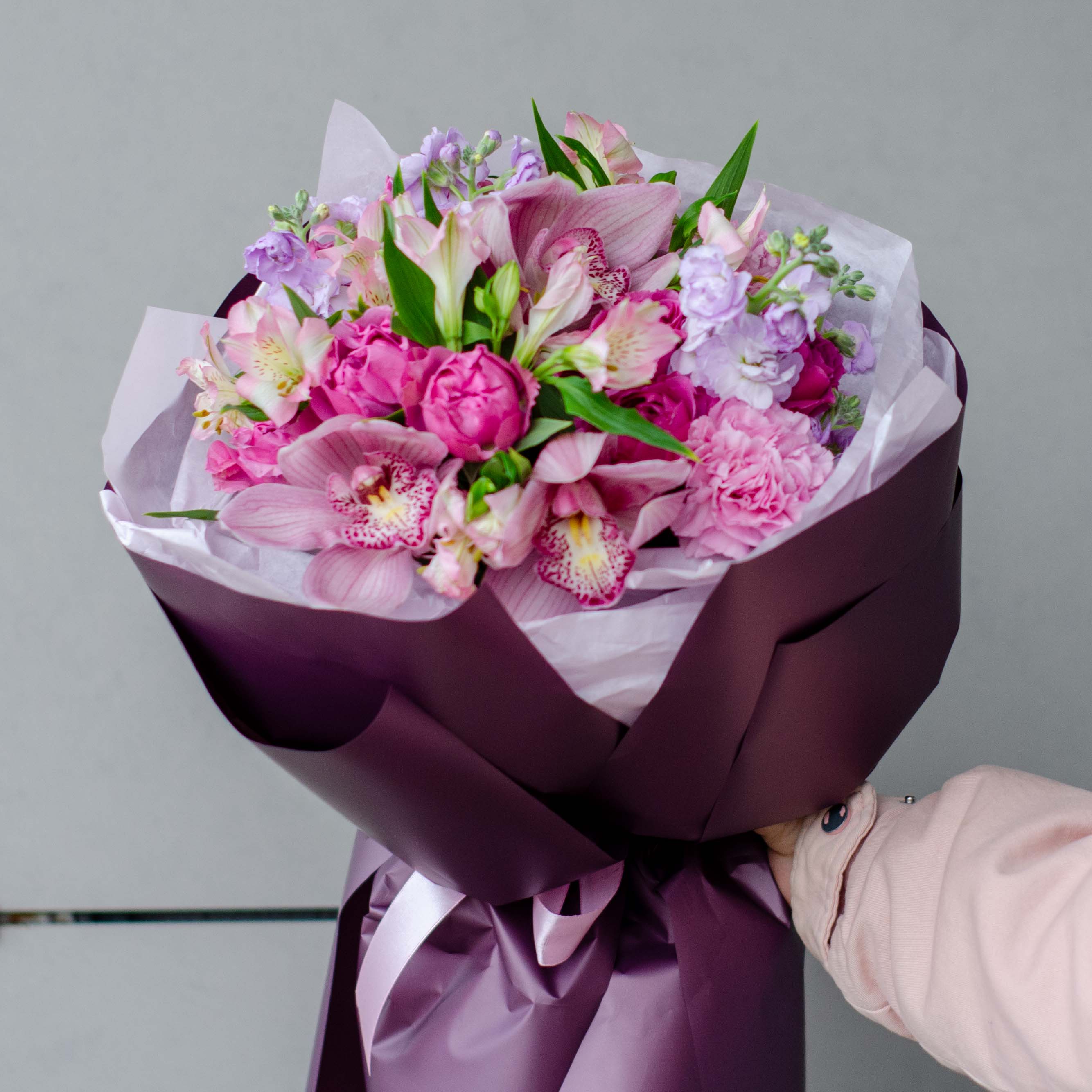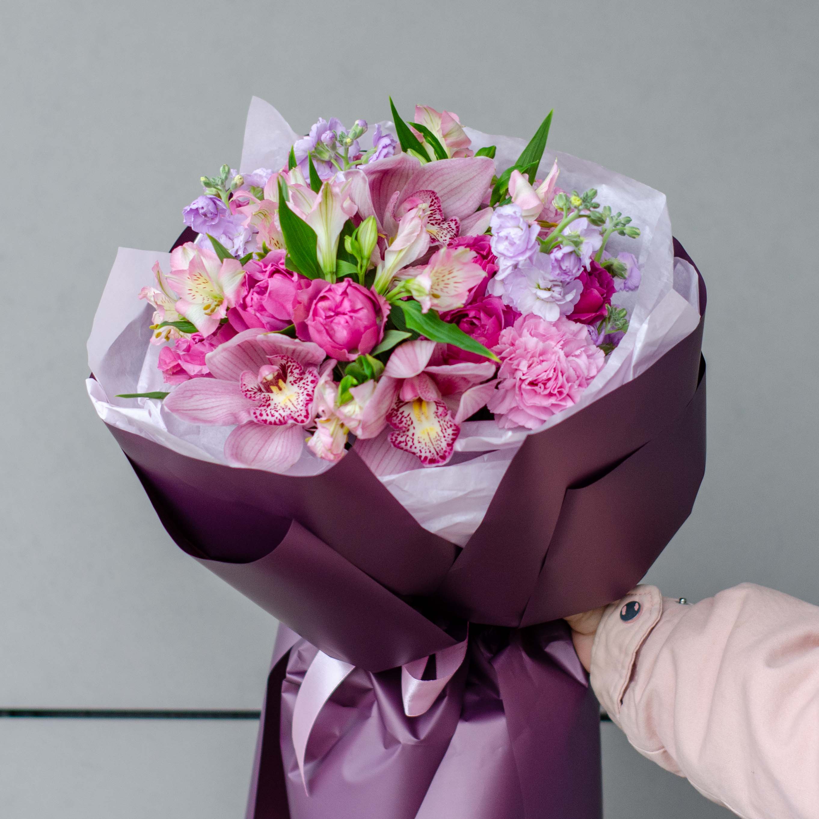 Состав: 3 альстромерии розовые, 2 мисти баблс кустовые розы, 2 маттиолы сиреневые, 3 цимбидиума, 4 розовые гвоздики, упаковка