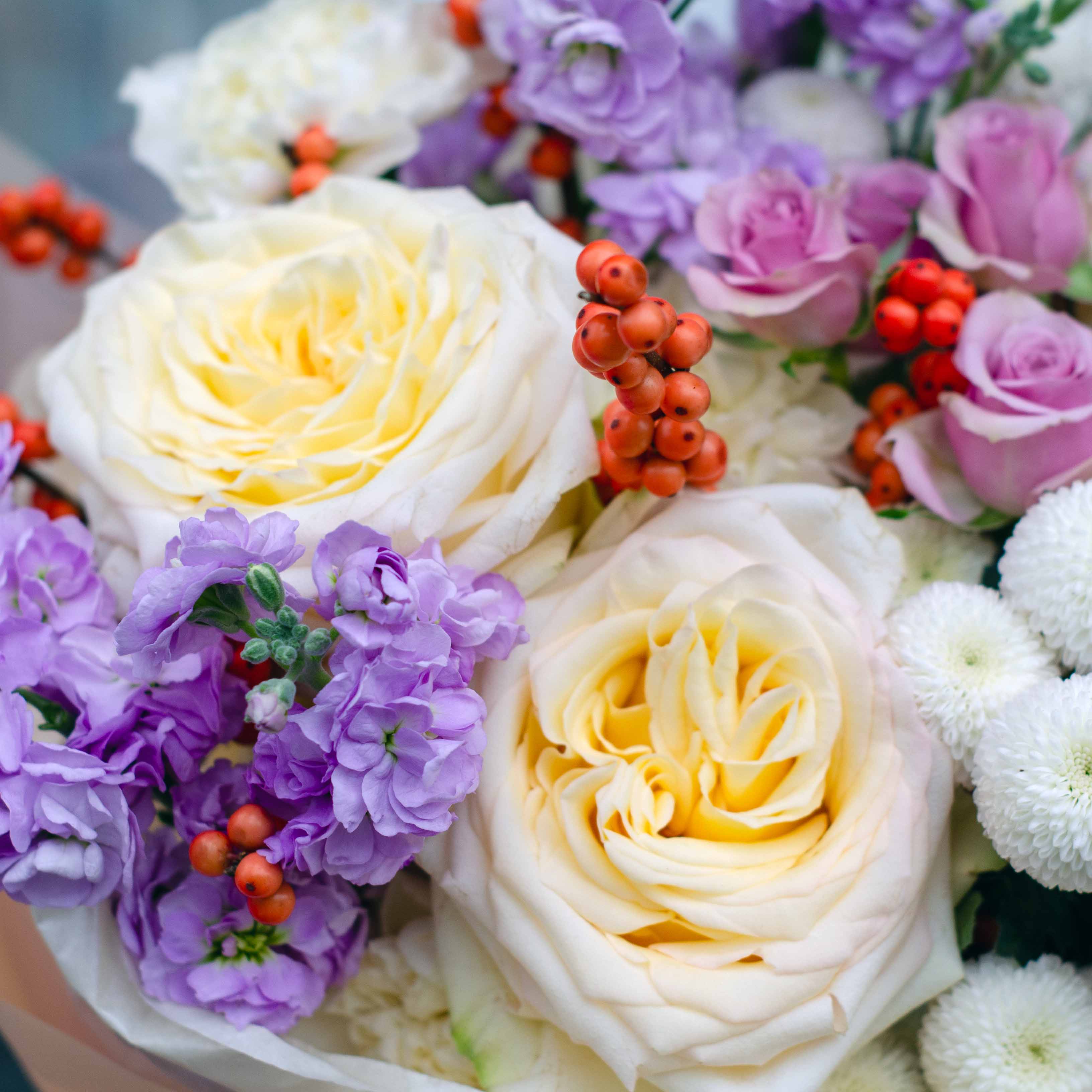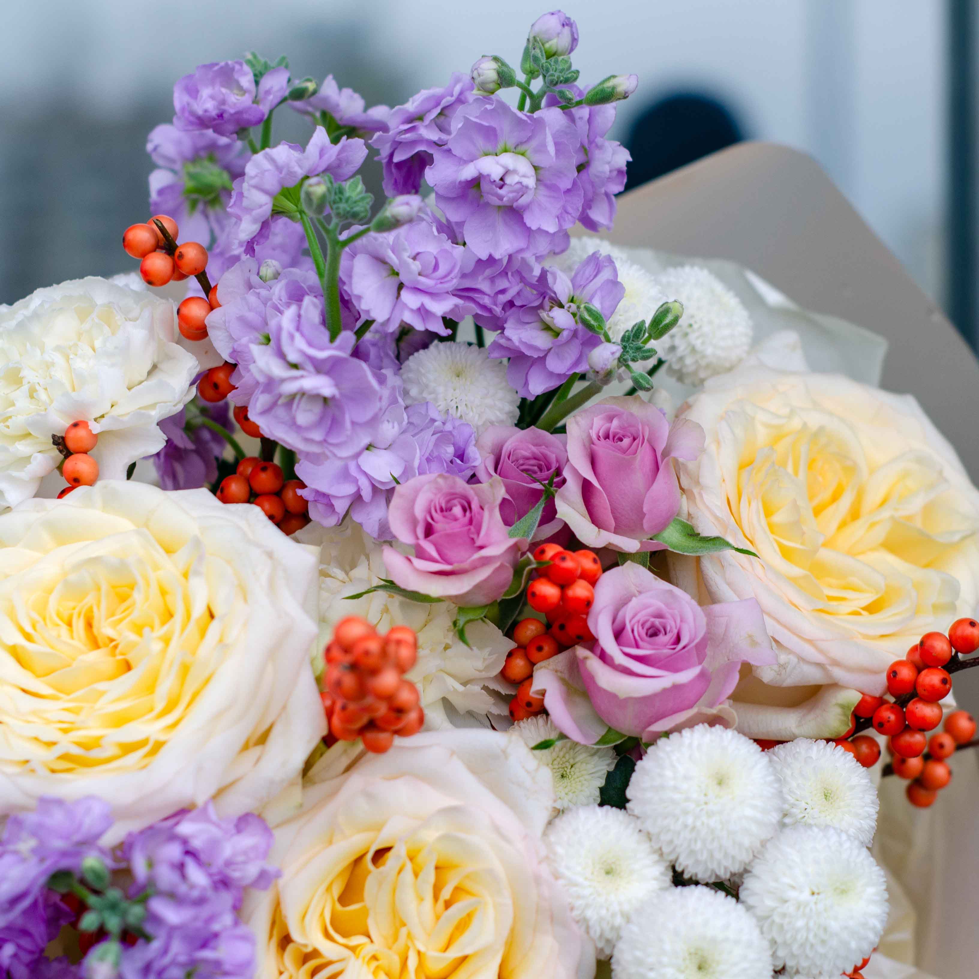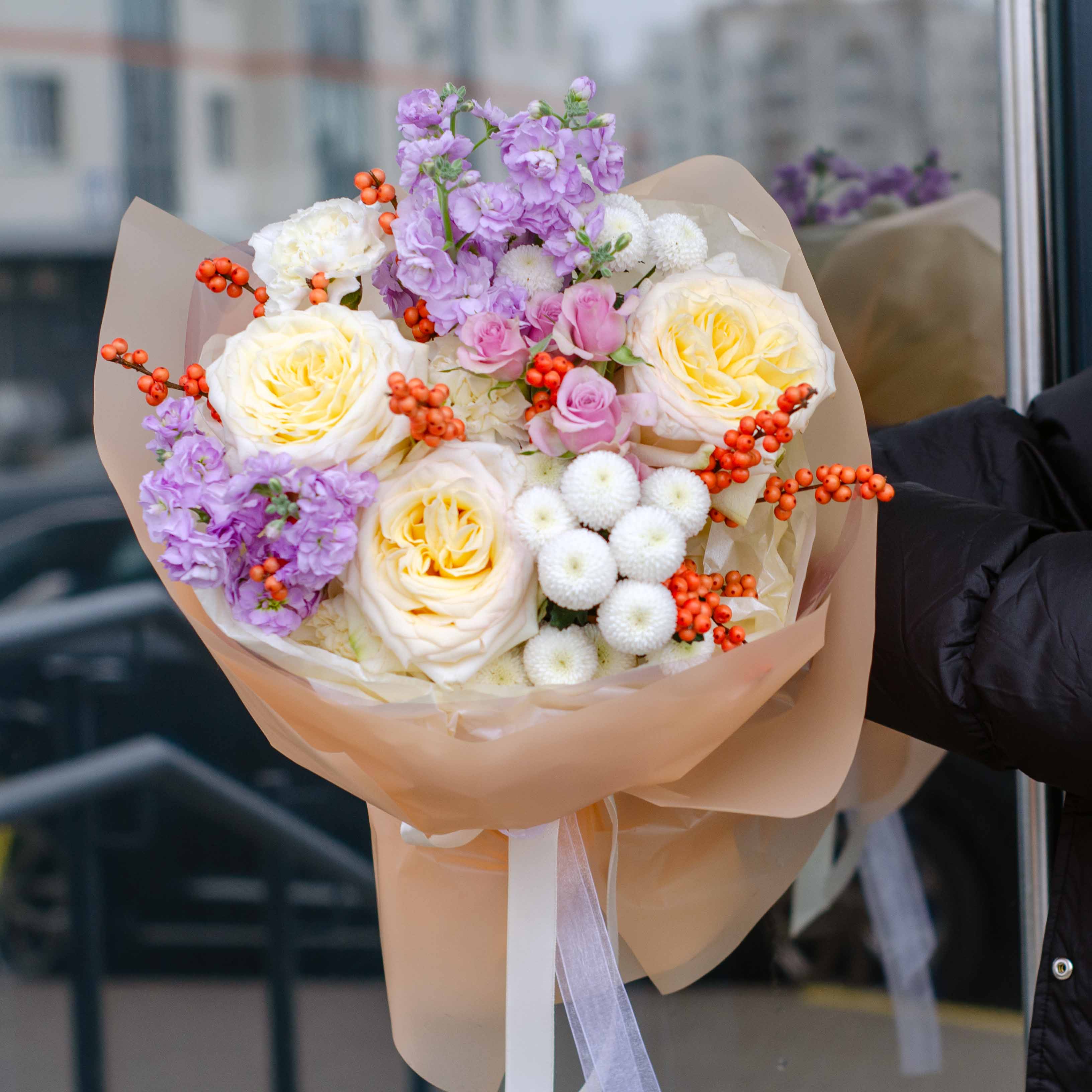 Состав: 2 маттиолы кустовые, 3 гвоздики, 1 кустовая Лейла, 3 пионовидные розы, 2 илекса и упаковка