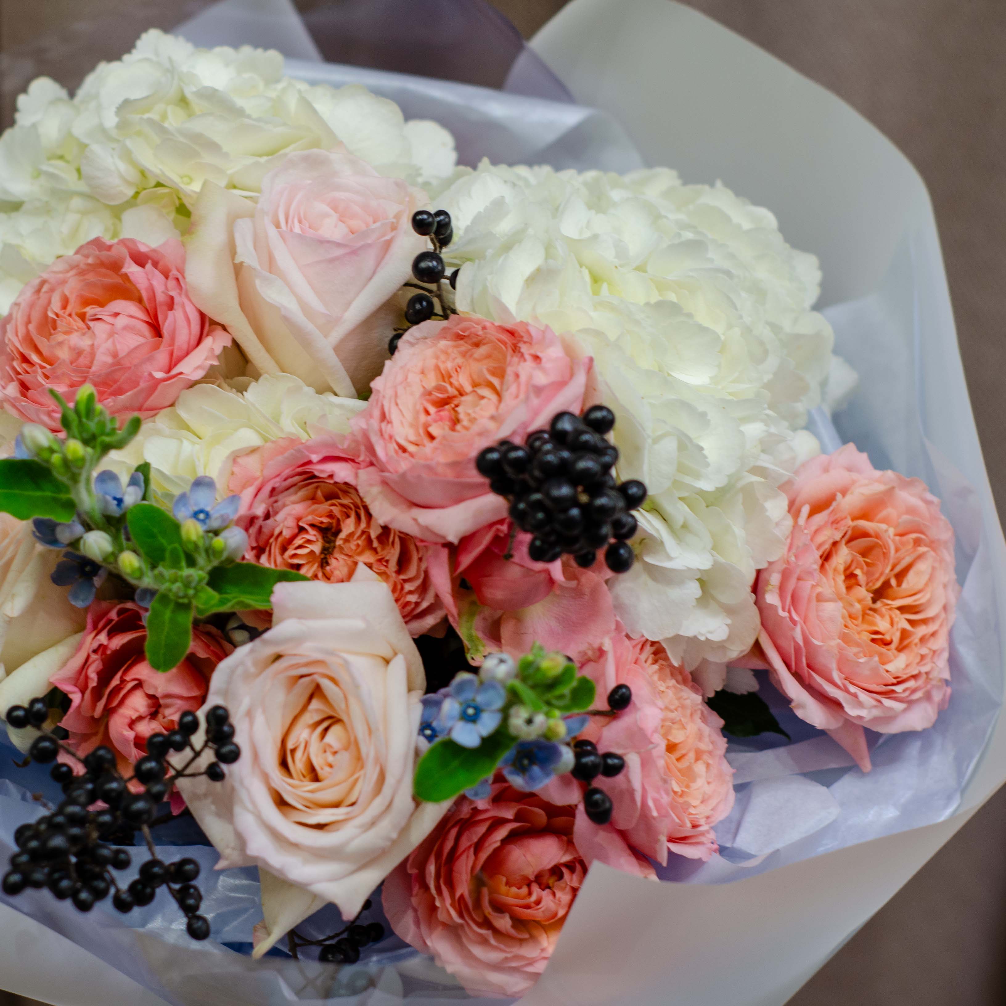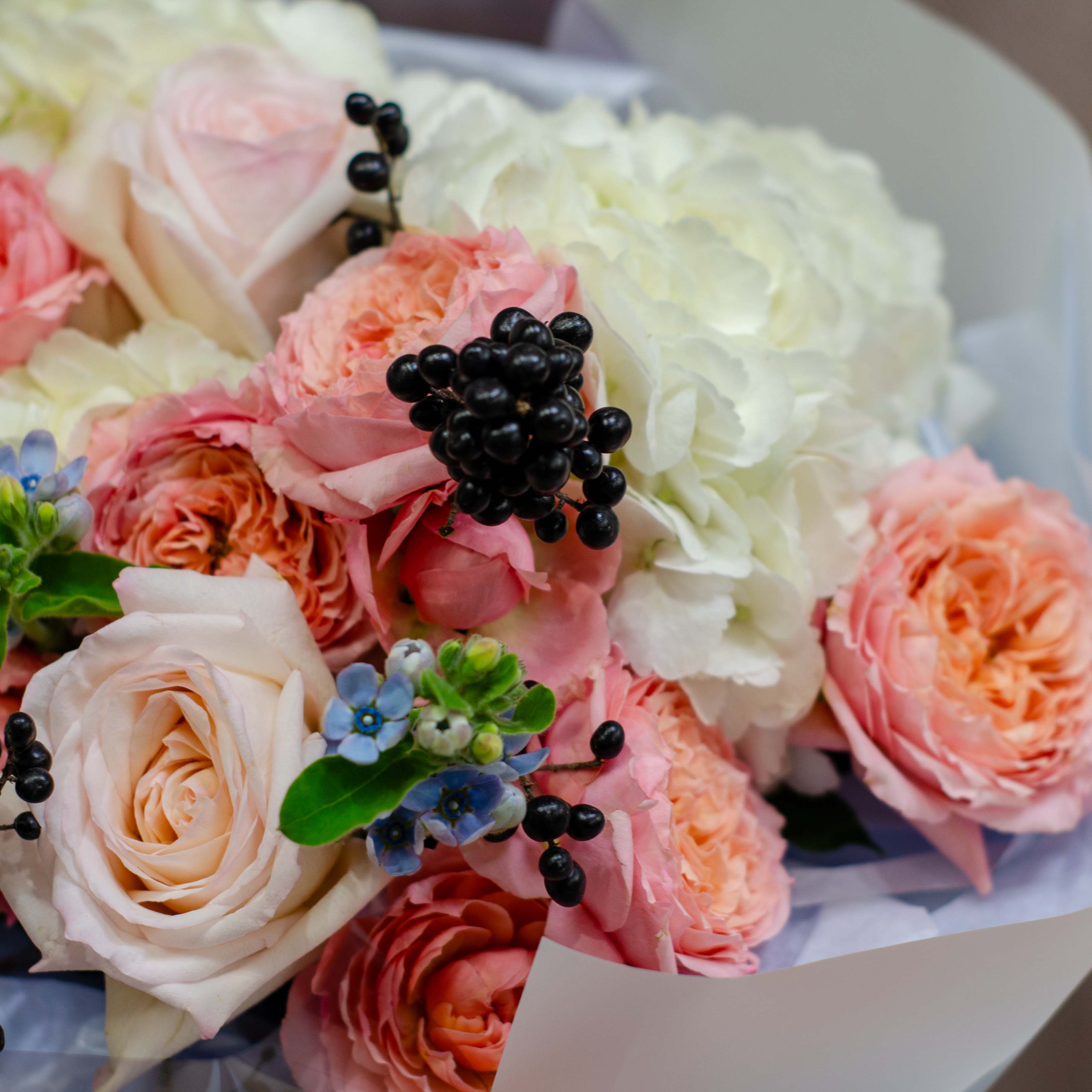 Состав: 3 гортензии, 3 оксипеталума, джульетта кустовая роза, 3 Вайт Охары, ягоды и упаковка