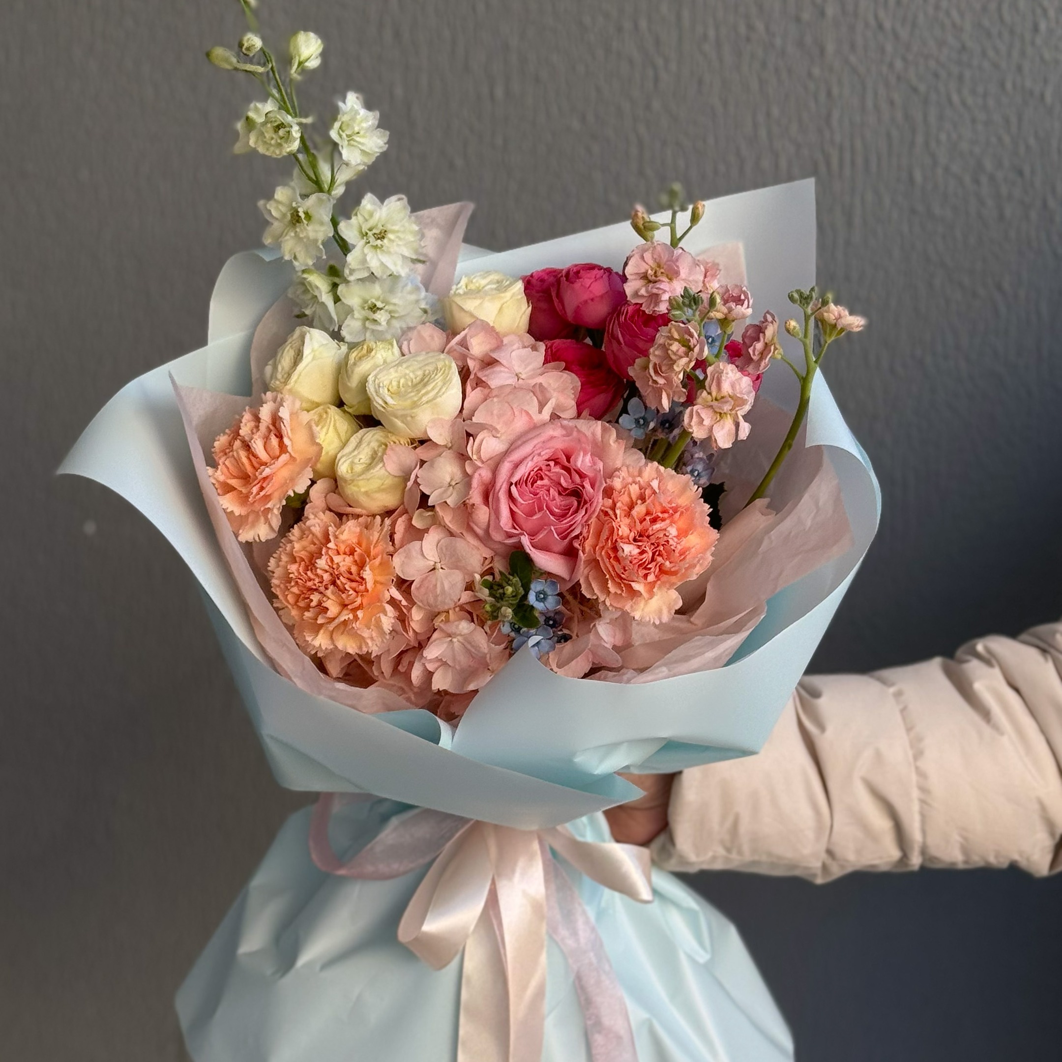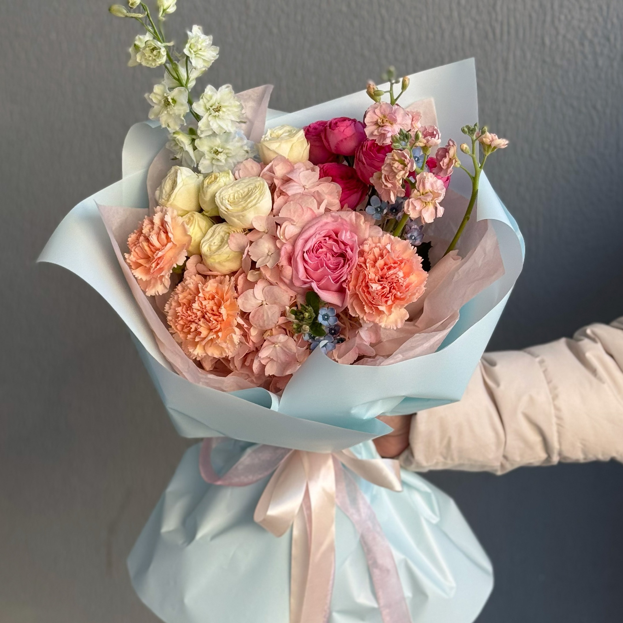 Состав: гортензия, Пинк Охара, Жизель, Маттиола розовая, 2 оксипеталума, 1 дельфиниум, 3 гвоздики, Сноу Баблс и упаковка