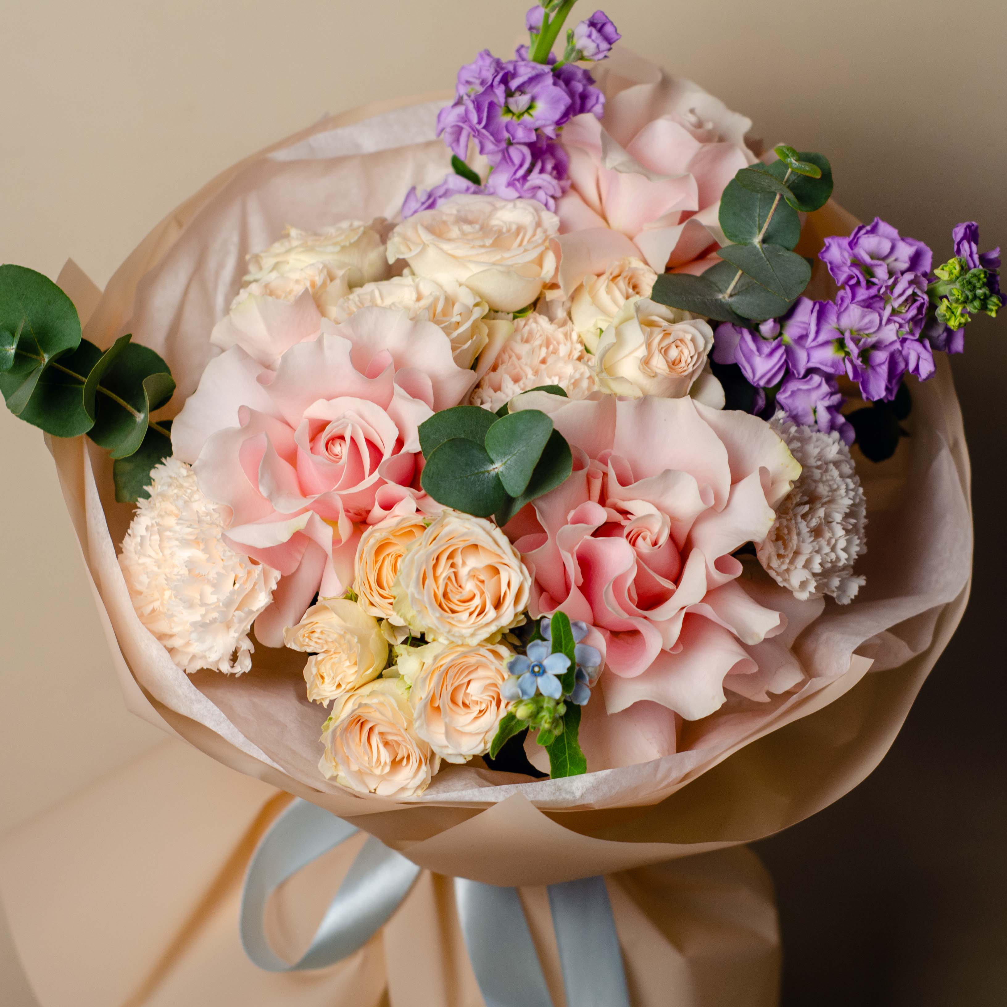 Состав: 3 французские розы, 3 гвоздики, 3 кустовые розы, 2 маттиолы, 1 оксипеталум, эвкалипт и упаковка