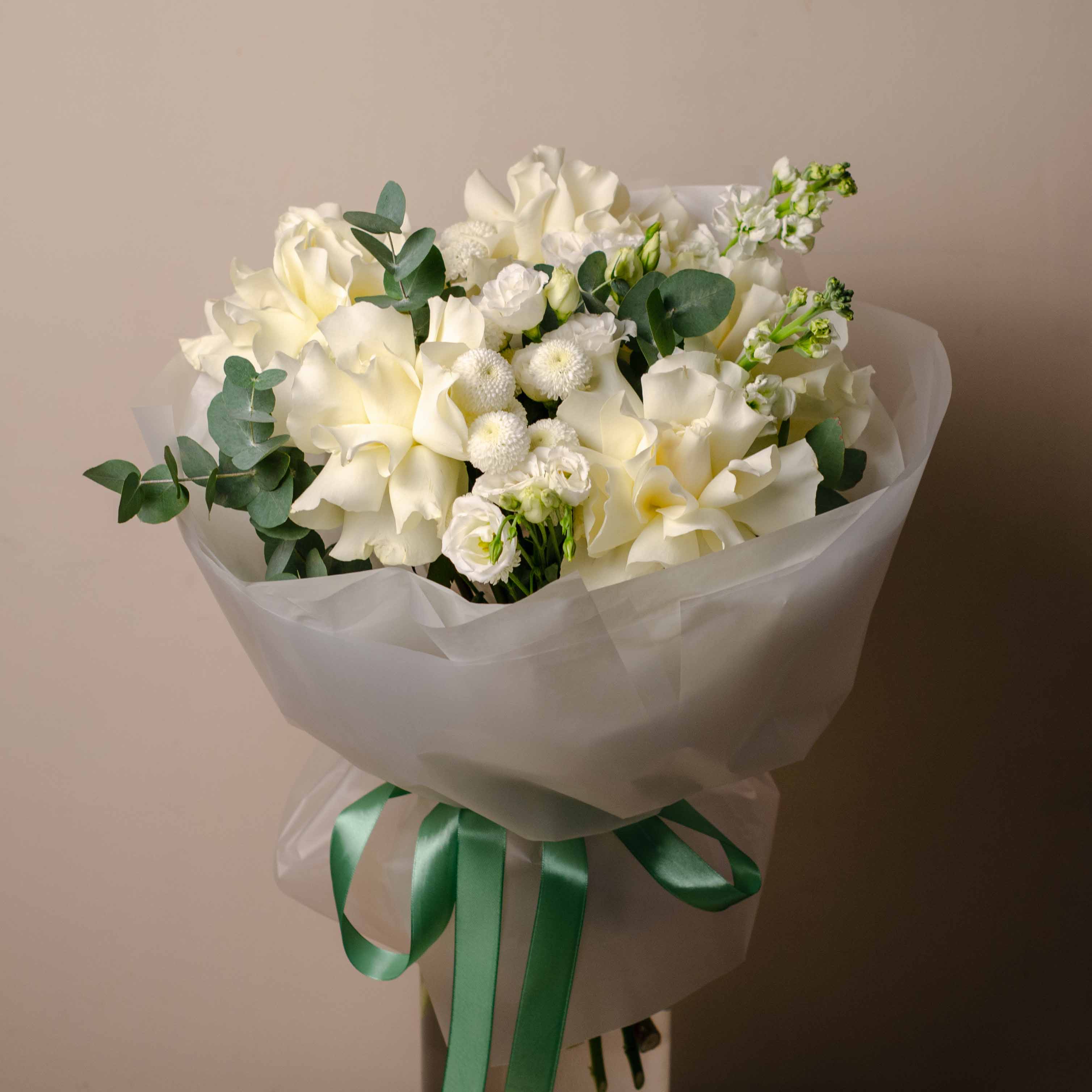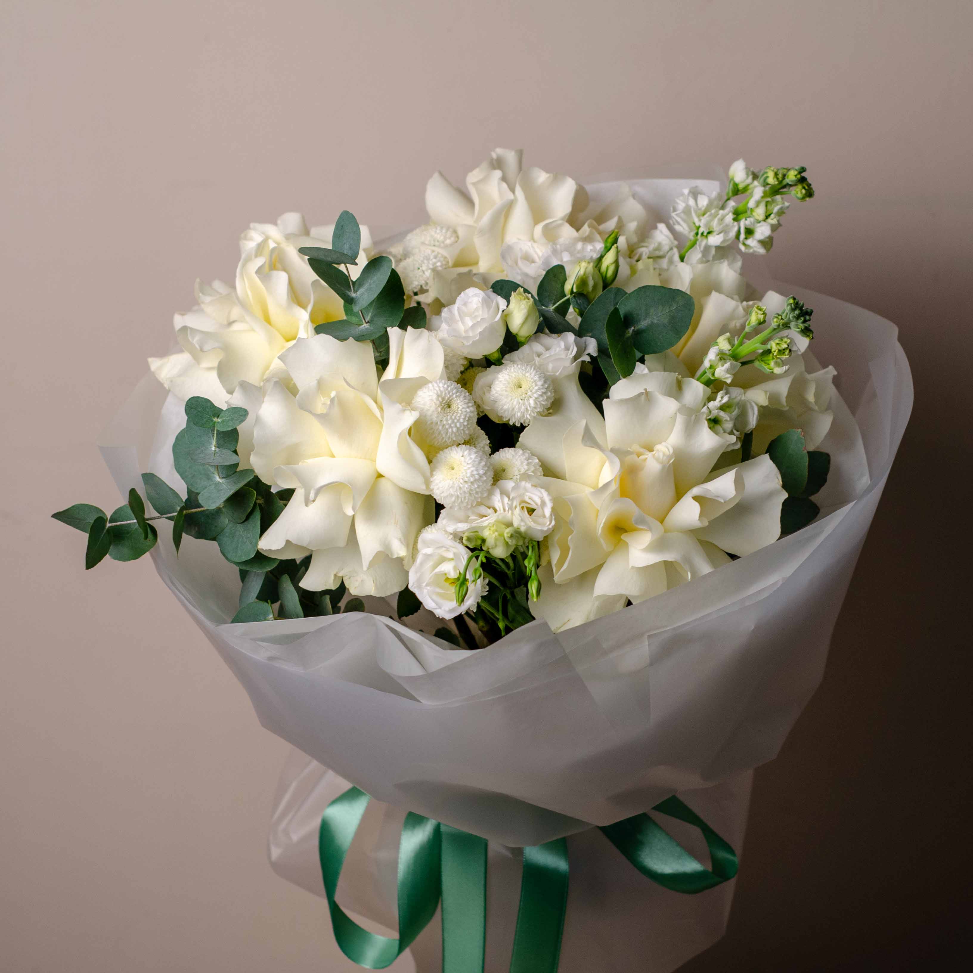 Состав: 3 французские розы, 2 хризантемы, 2 эустомы, 2 маттиолы, эвкалипт и упаковка