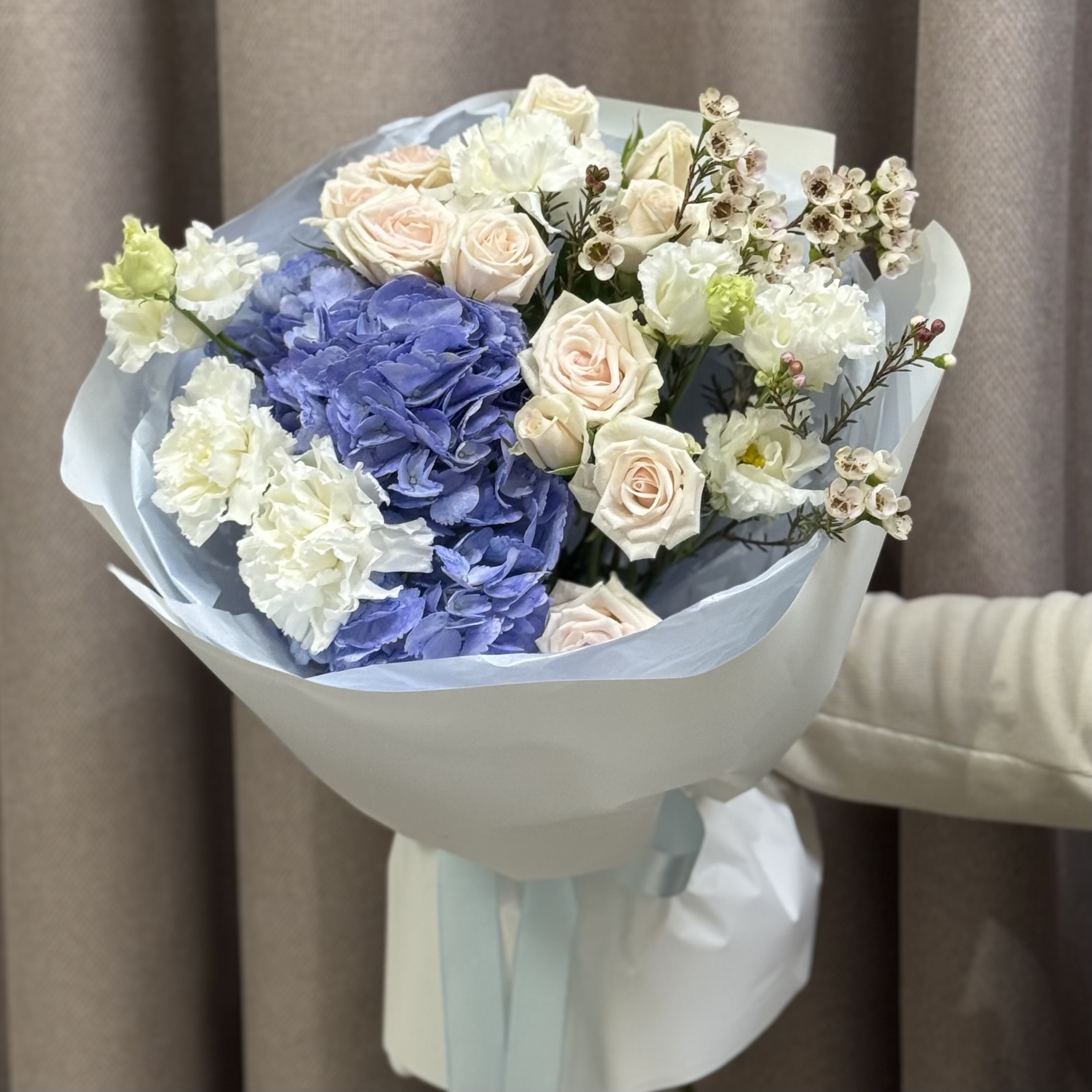 Состав: 1 гортензия, 4 гвоздики, 3 кустовые розы, 2 эустомы, 1 хамелациум и упаковка.