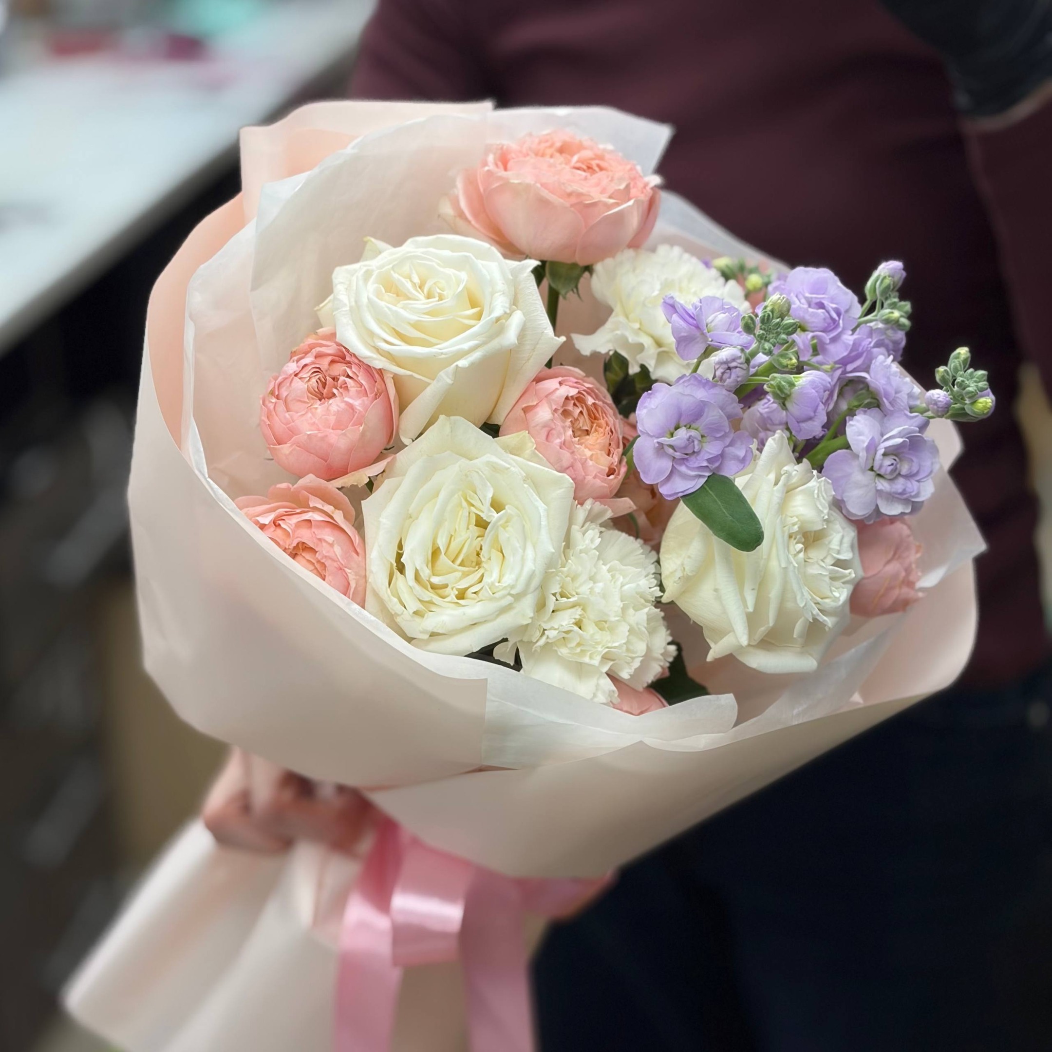 3 Плаи Бланка, 2 кустовые розы Джульетта, 1 кустовая маттиола, 2 гвоздики и упаковка