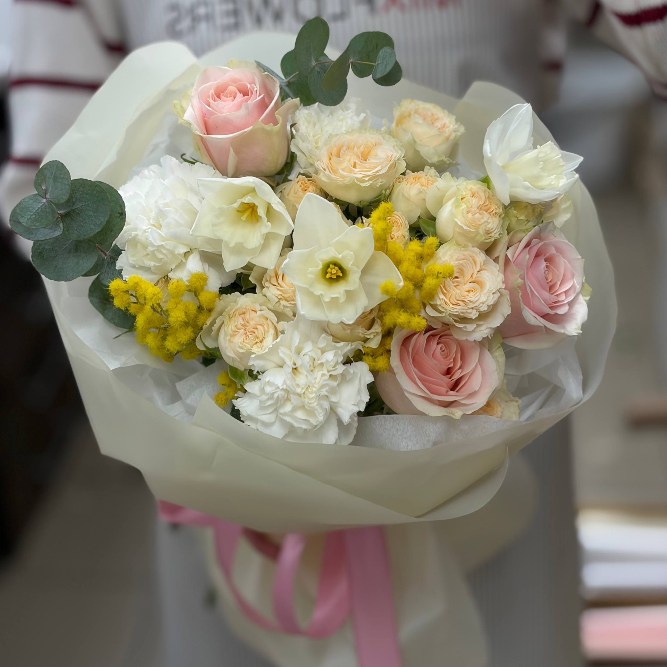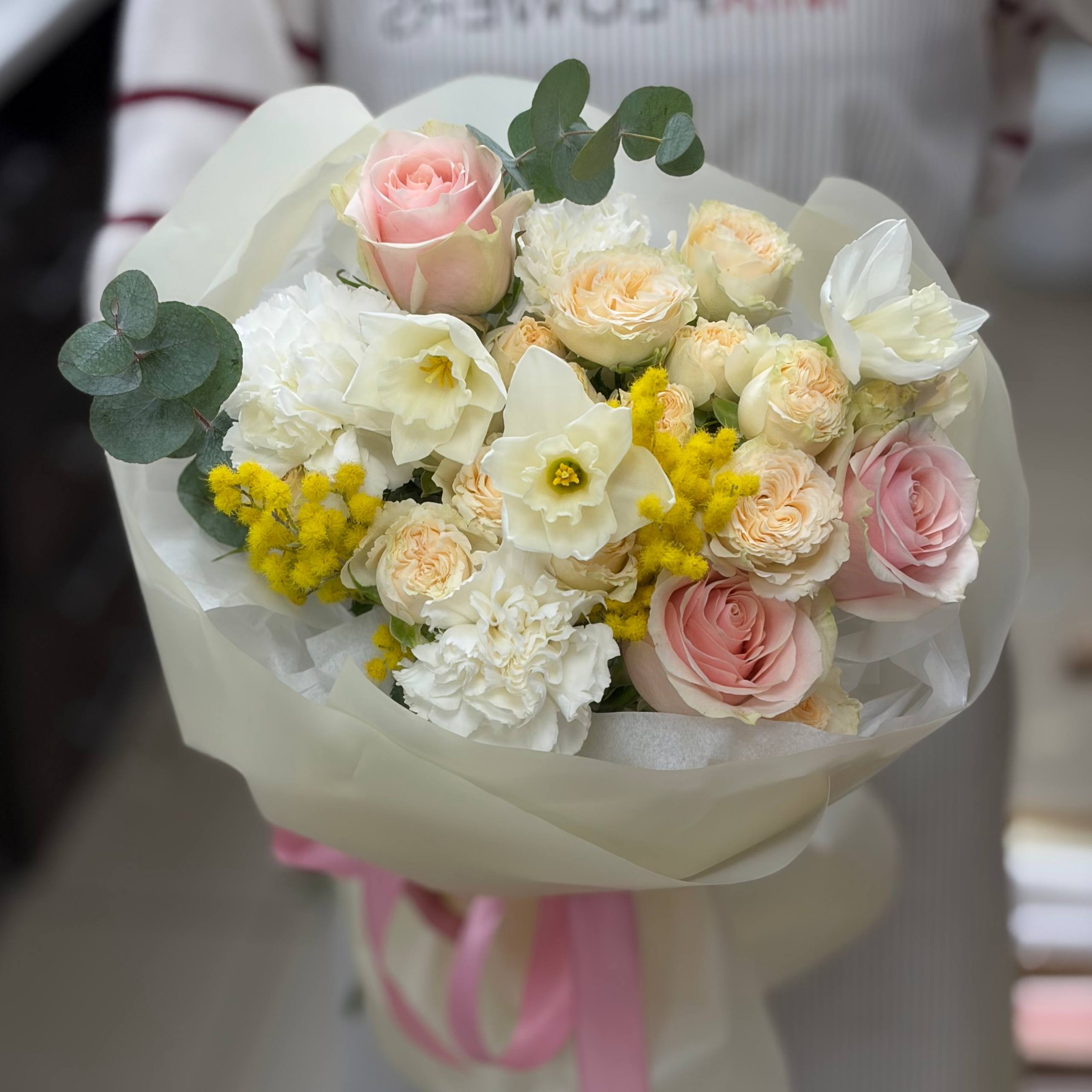 Состав: 3 нарцисса, 2 кустовые розы, 3 розы, 3 гвоздики, 1 эвкалипт, мимоза и упаковка