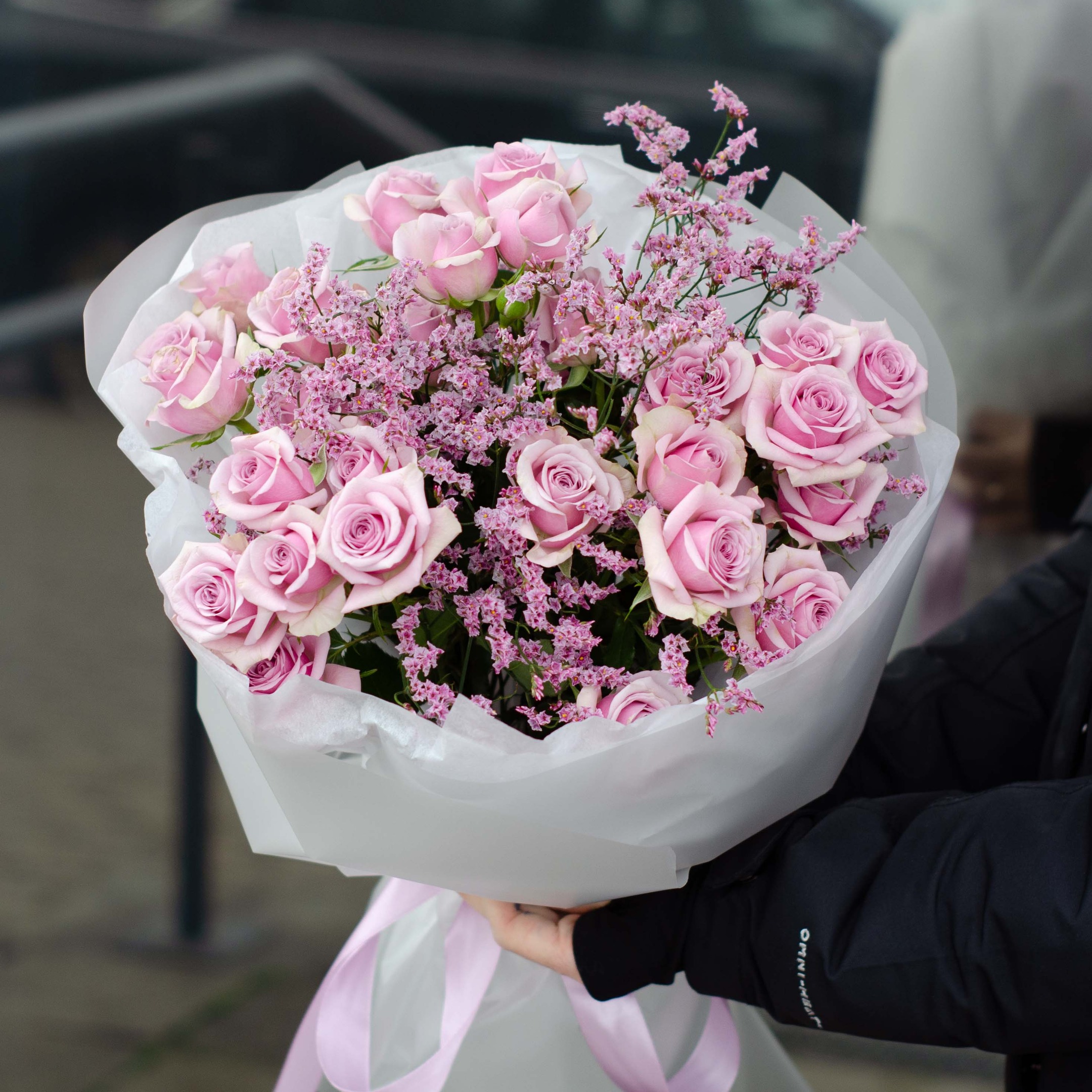 Состав: 5 веток кустовой розы и 2 лимониума в упаковке