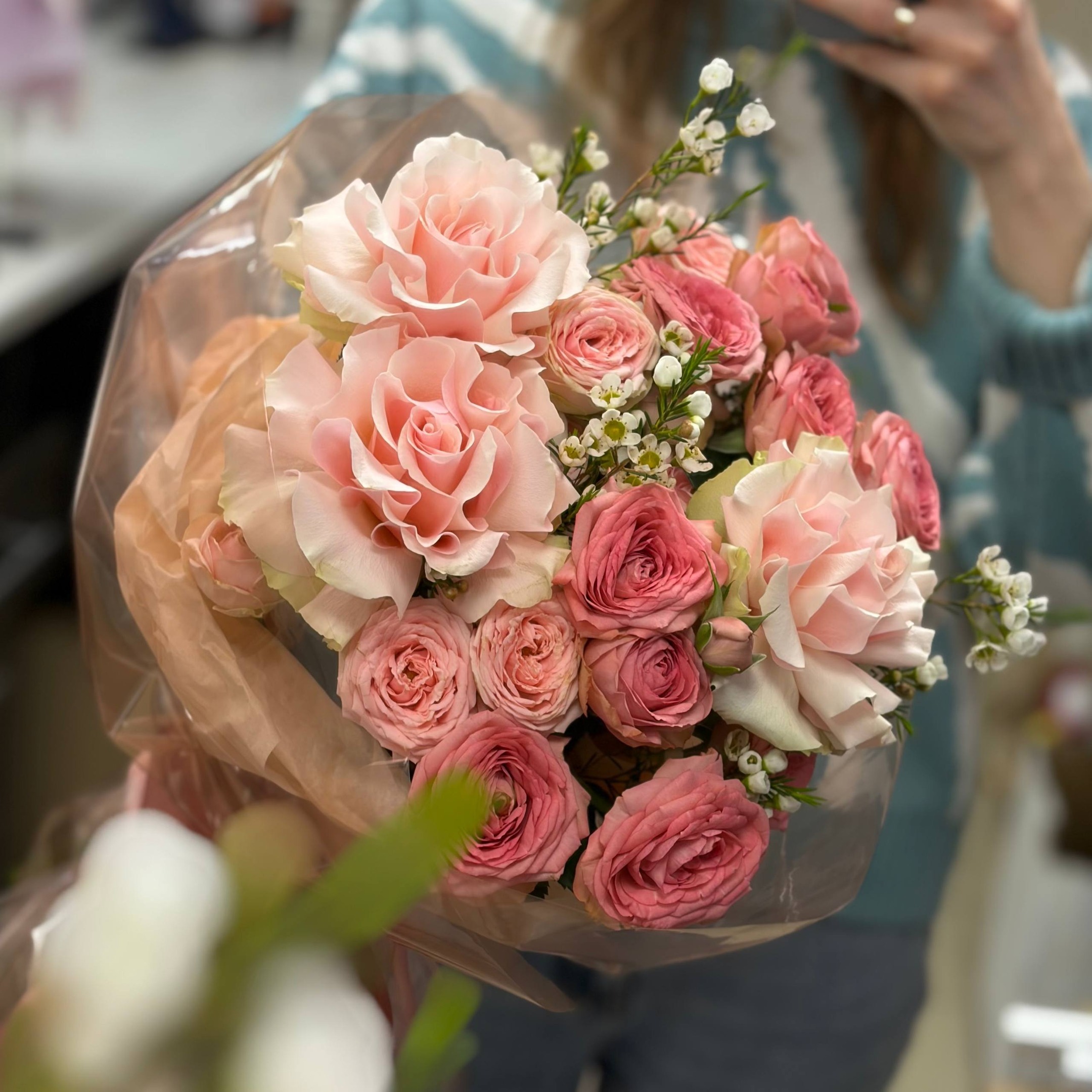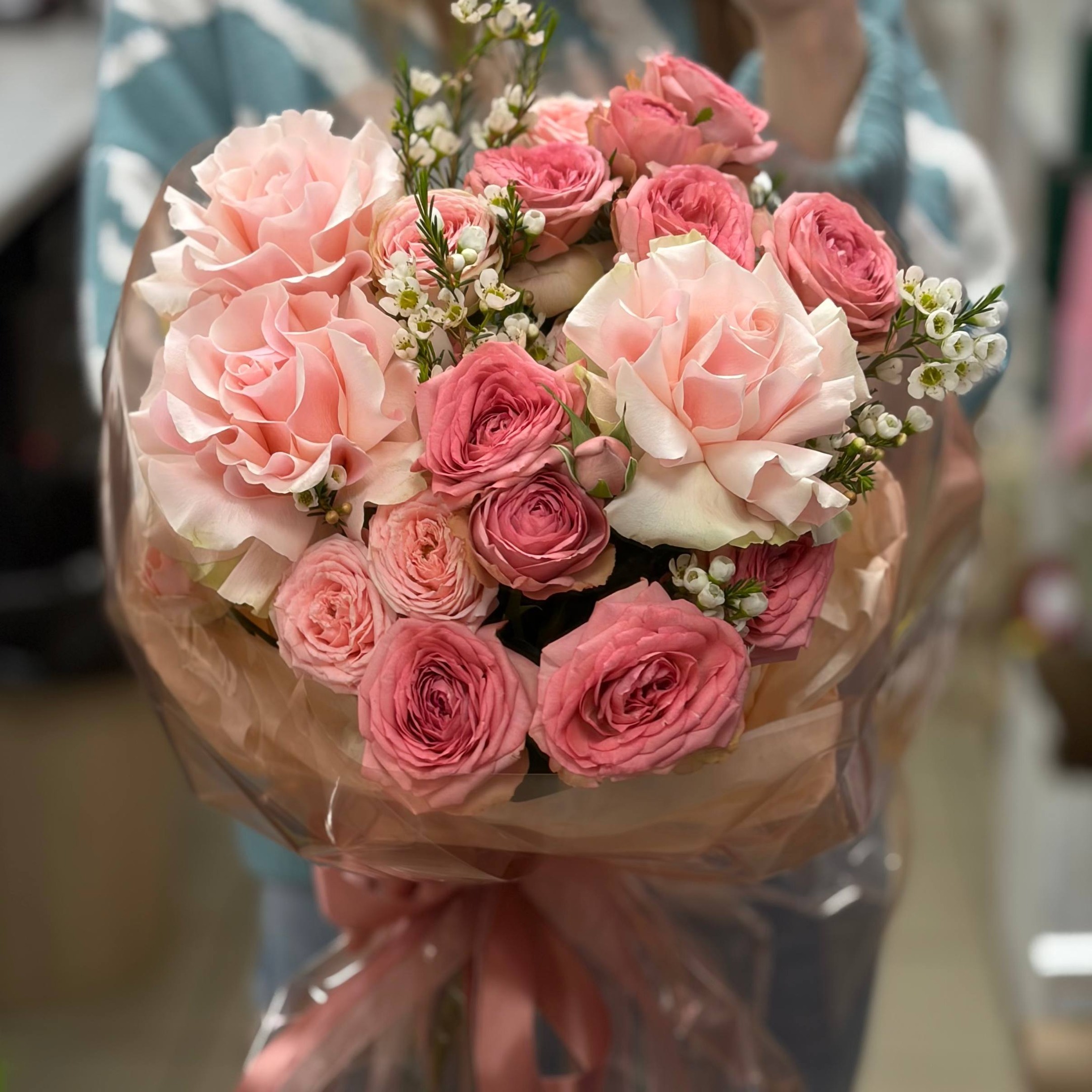 Состав: 3 французские розы, 4 кустовые пионовидные розы, 2 хамелациума и упаковка