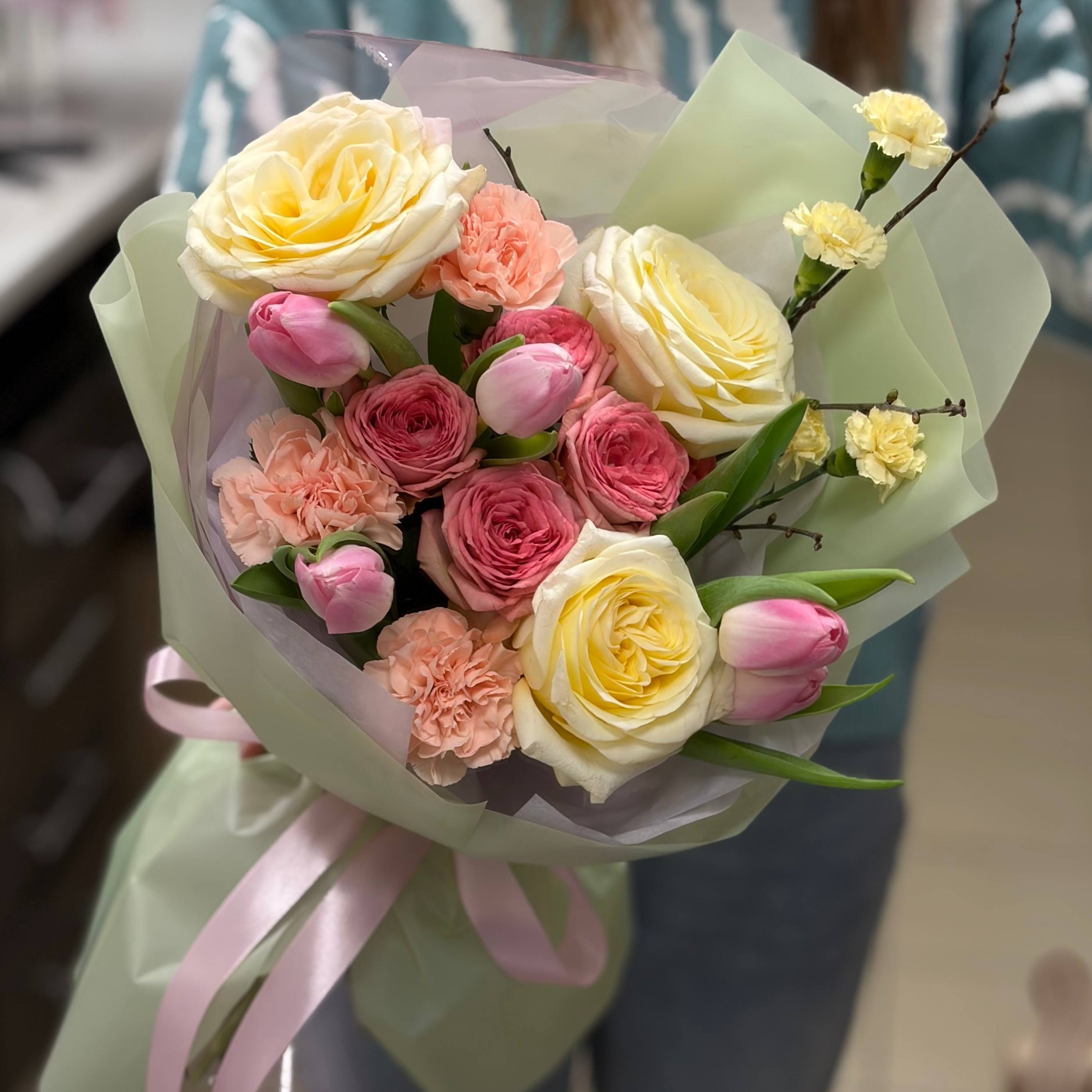 Состав: кустовая гвоздика, 3 пионовидные розы, 5 тюльпанов, 3 гвоздики, 1 кустовая роза, веточки и упаковка