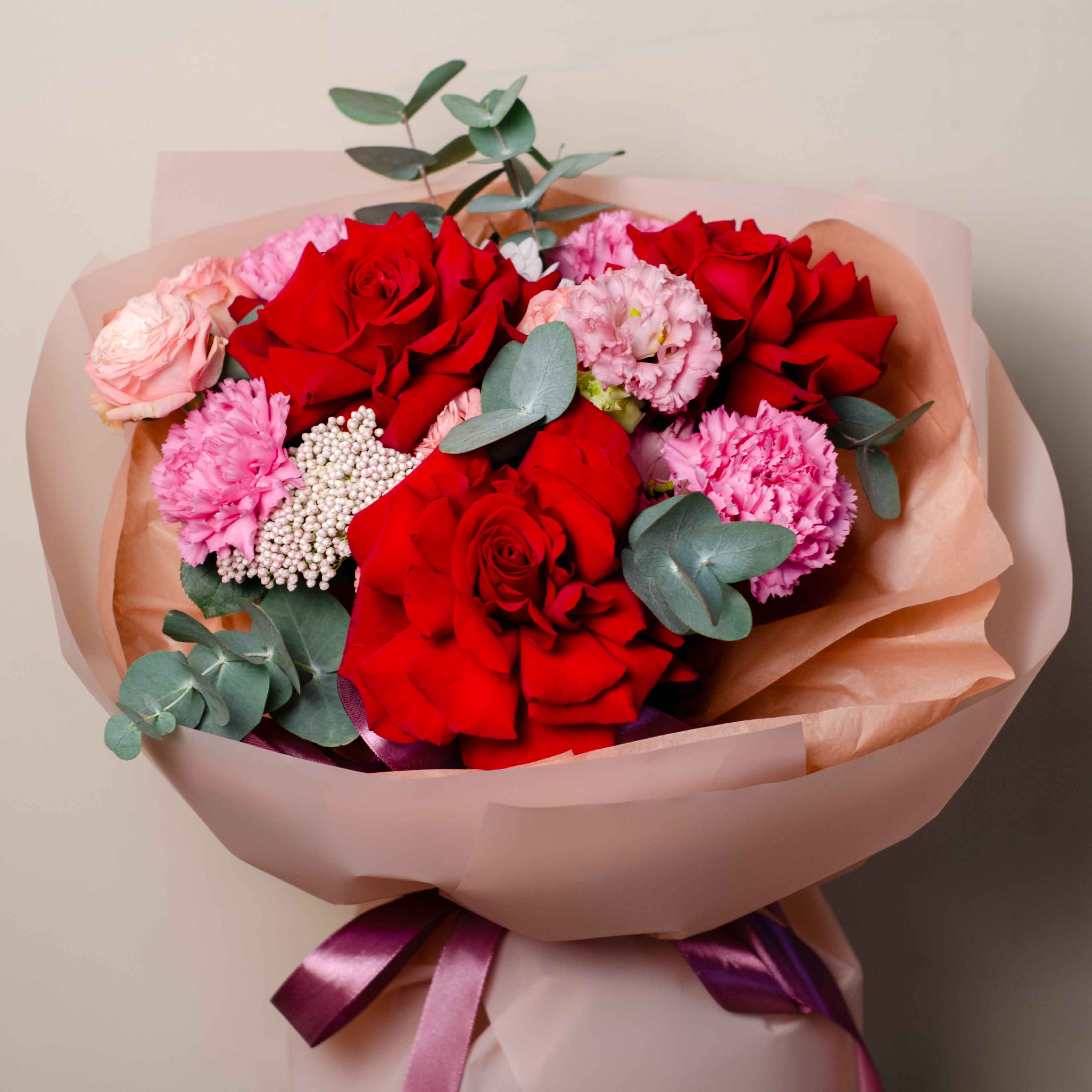 Состав: 3 французские розы, 1 эустома, 2 кустовые розы, 1 эустома, 1 озотамнус 4 гвоздики, 2 эвкалипта и упаковка