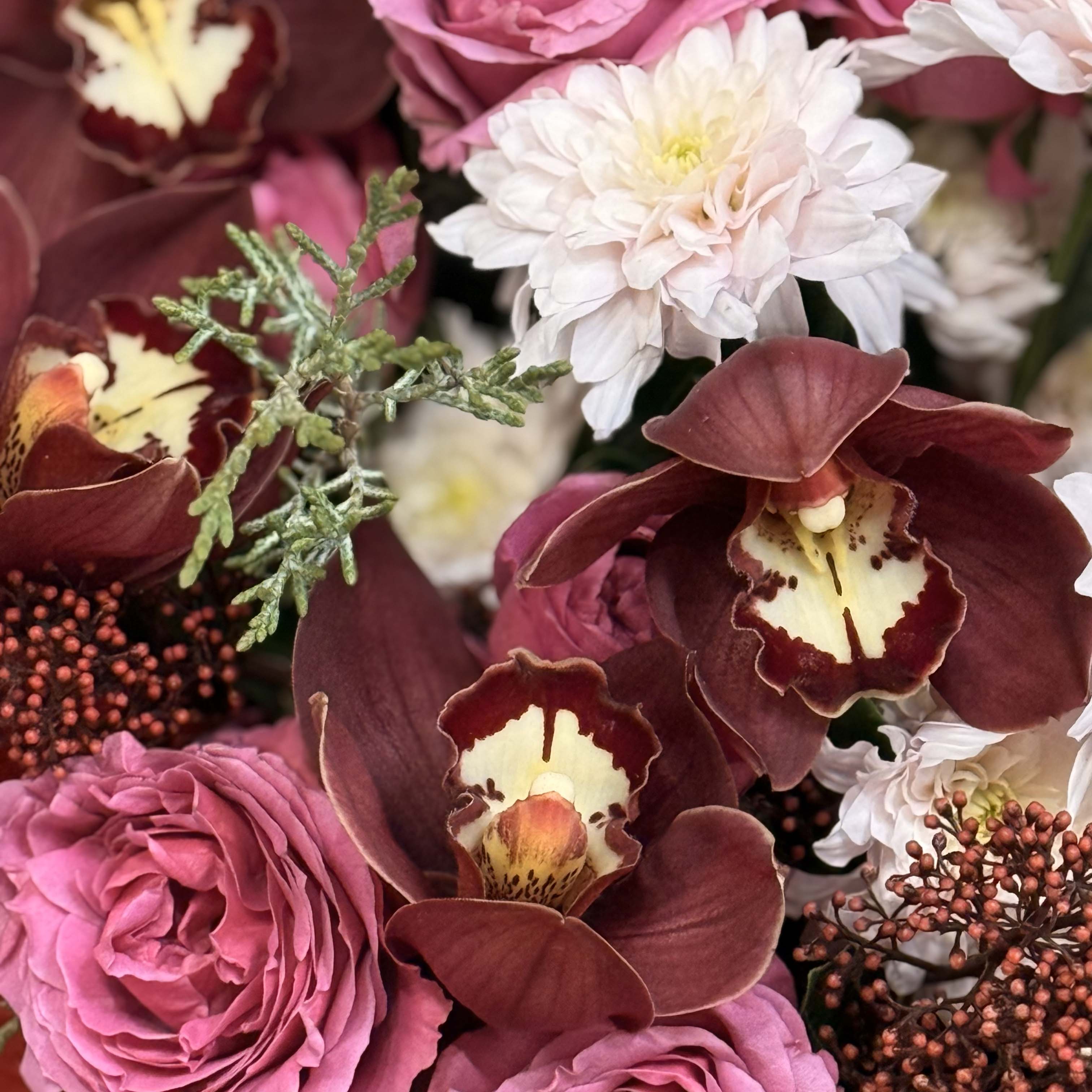 Состав: 5 цимбидиумов, 2 кустовые розымисти баблс, 1 скиммия, 1 хризантема пастелла роуз, эвкалипт и упаковка