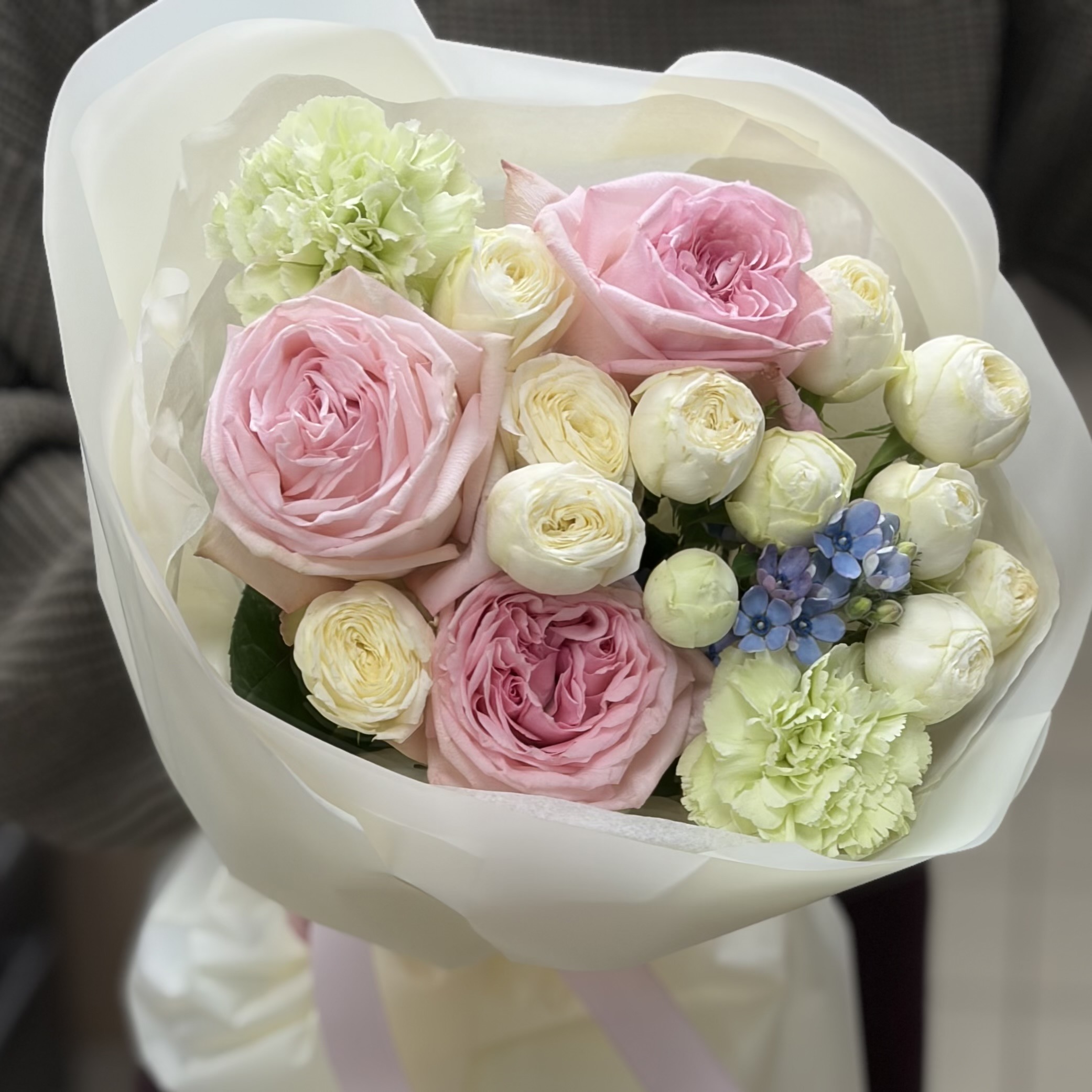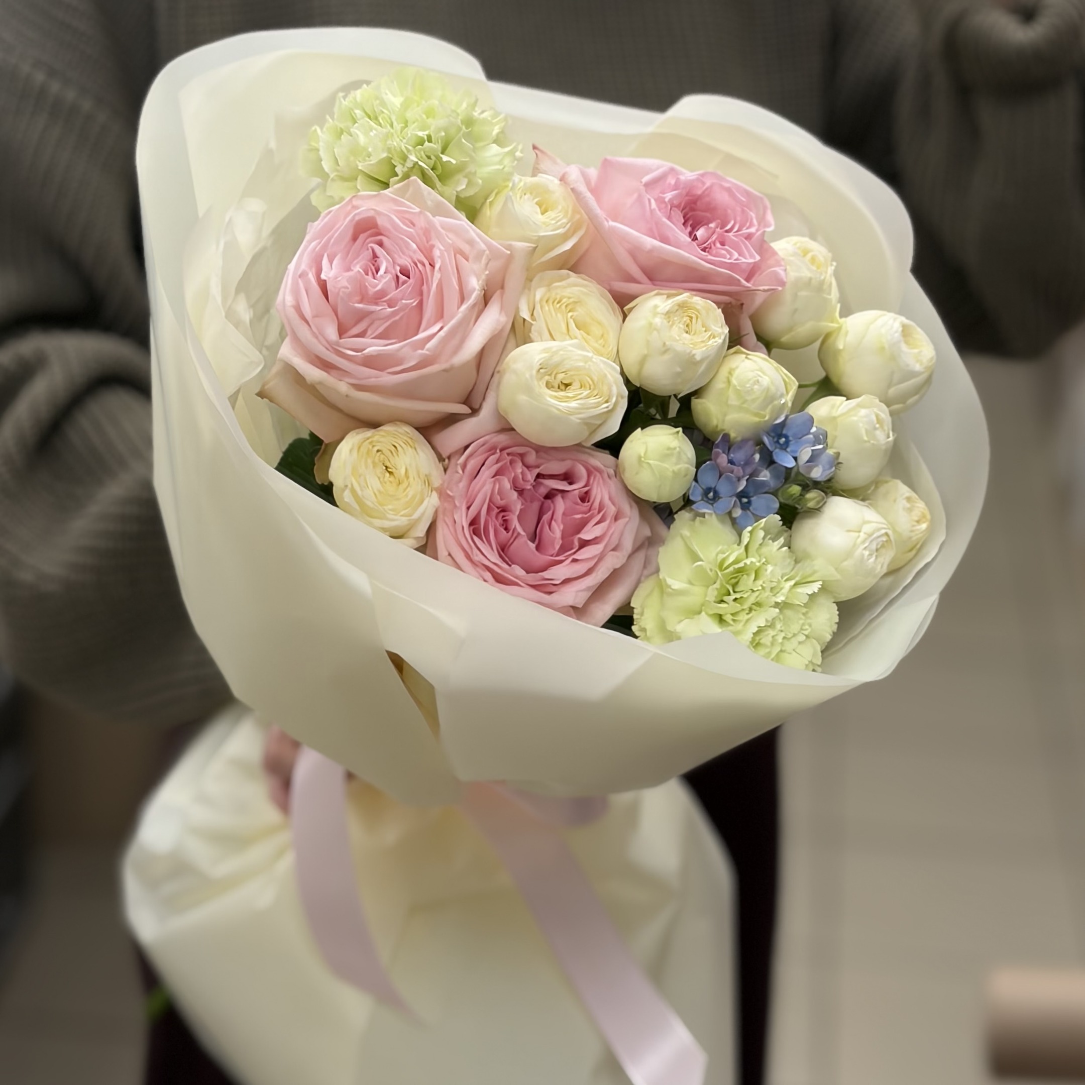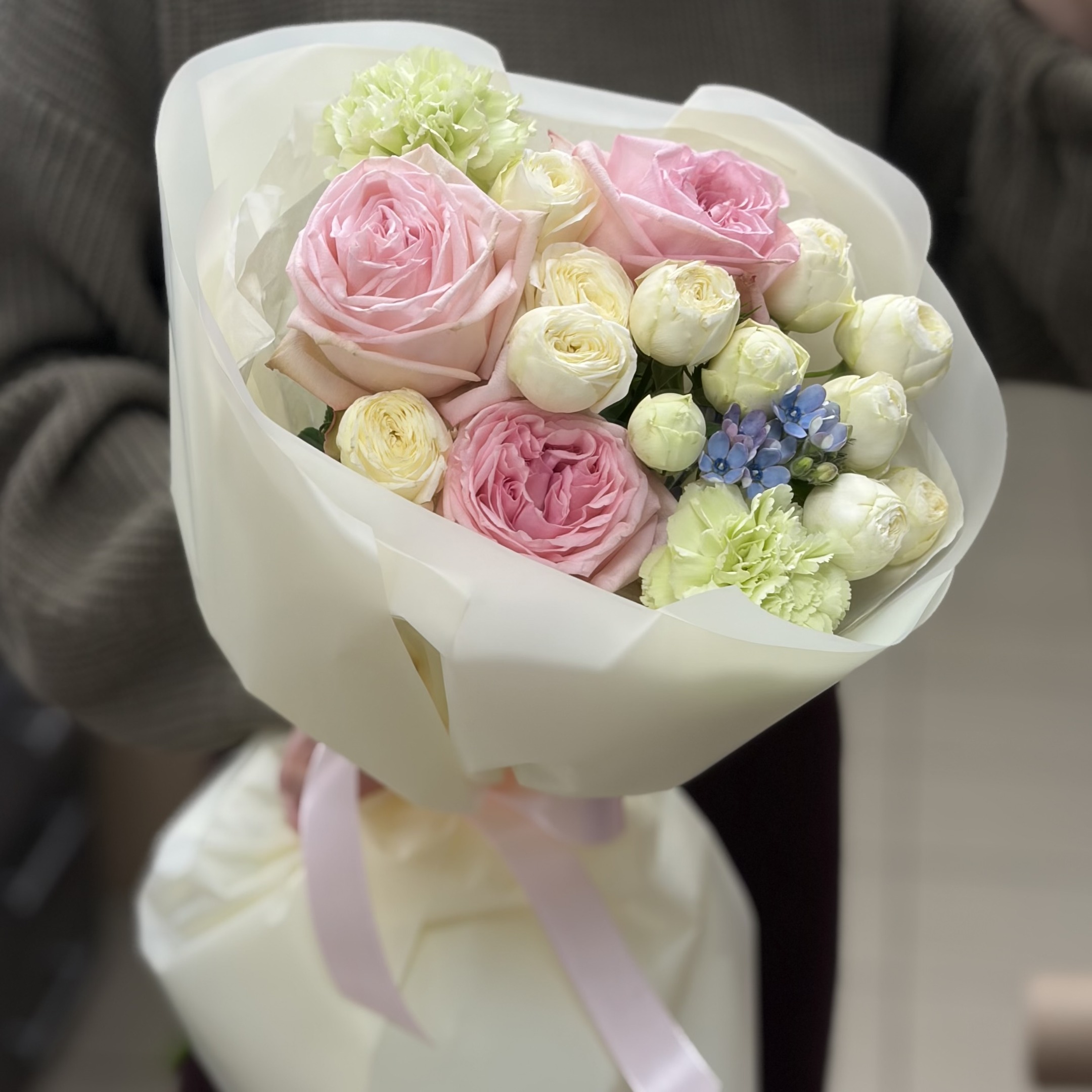 Состав: Пинк Охары, 2 кустовые розы, 1 оксипеталум, 2 гвоздики и упаковка