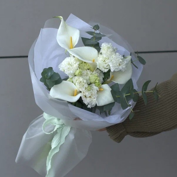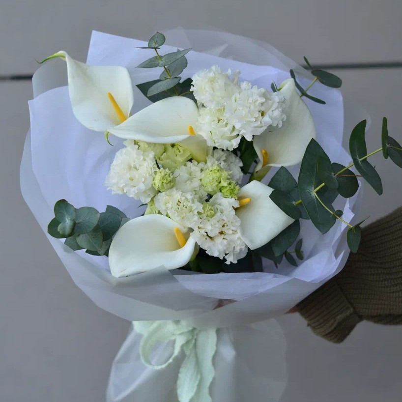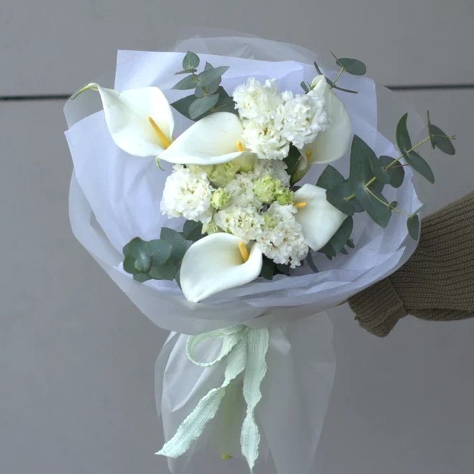 Состав: 5 калл, 2 эустомы, 1 эвкалипт, упаковка