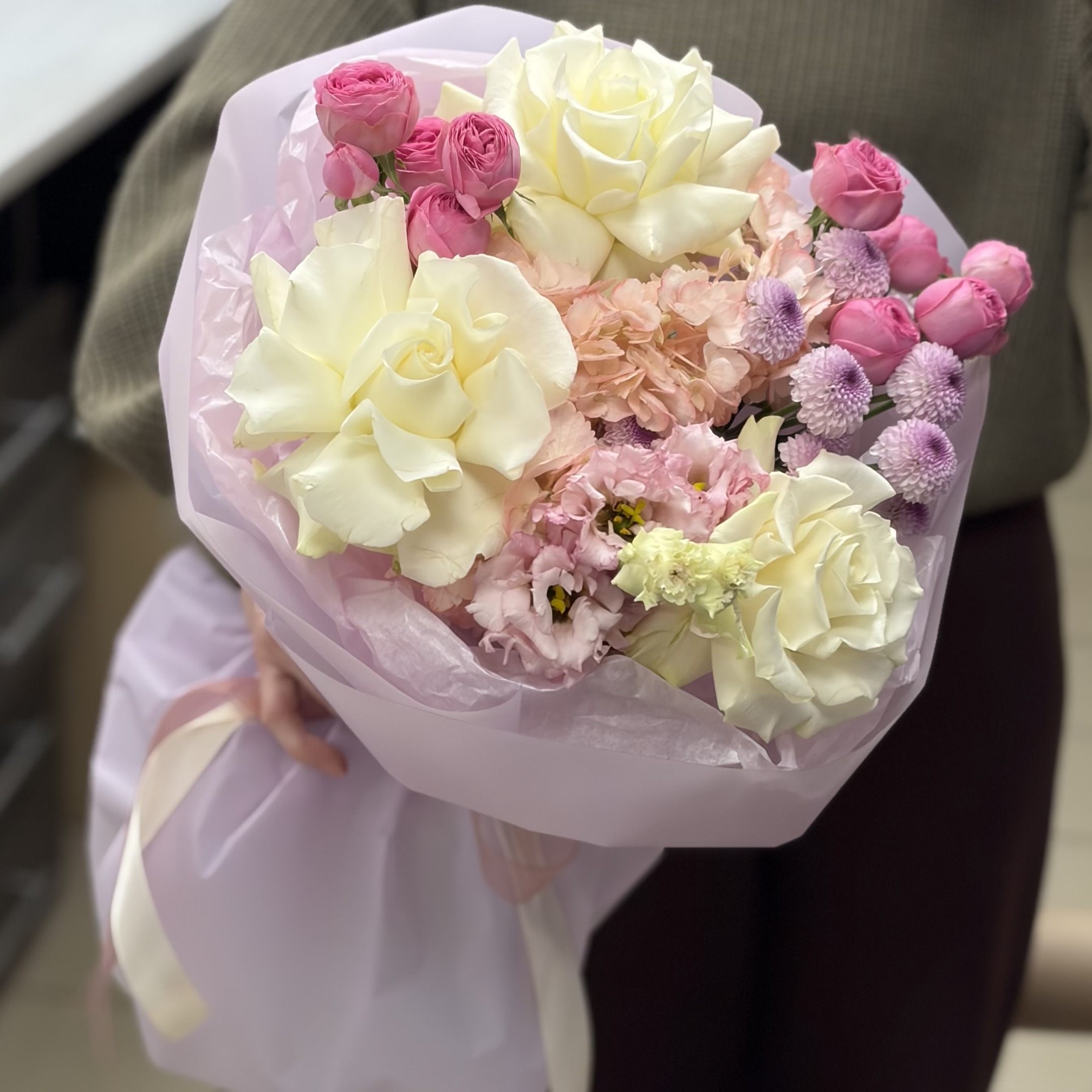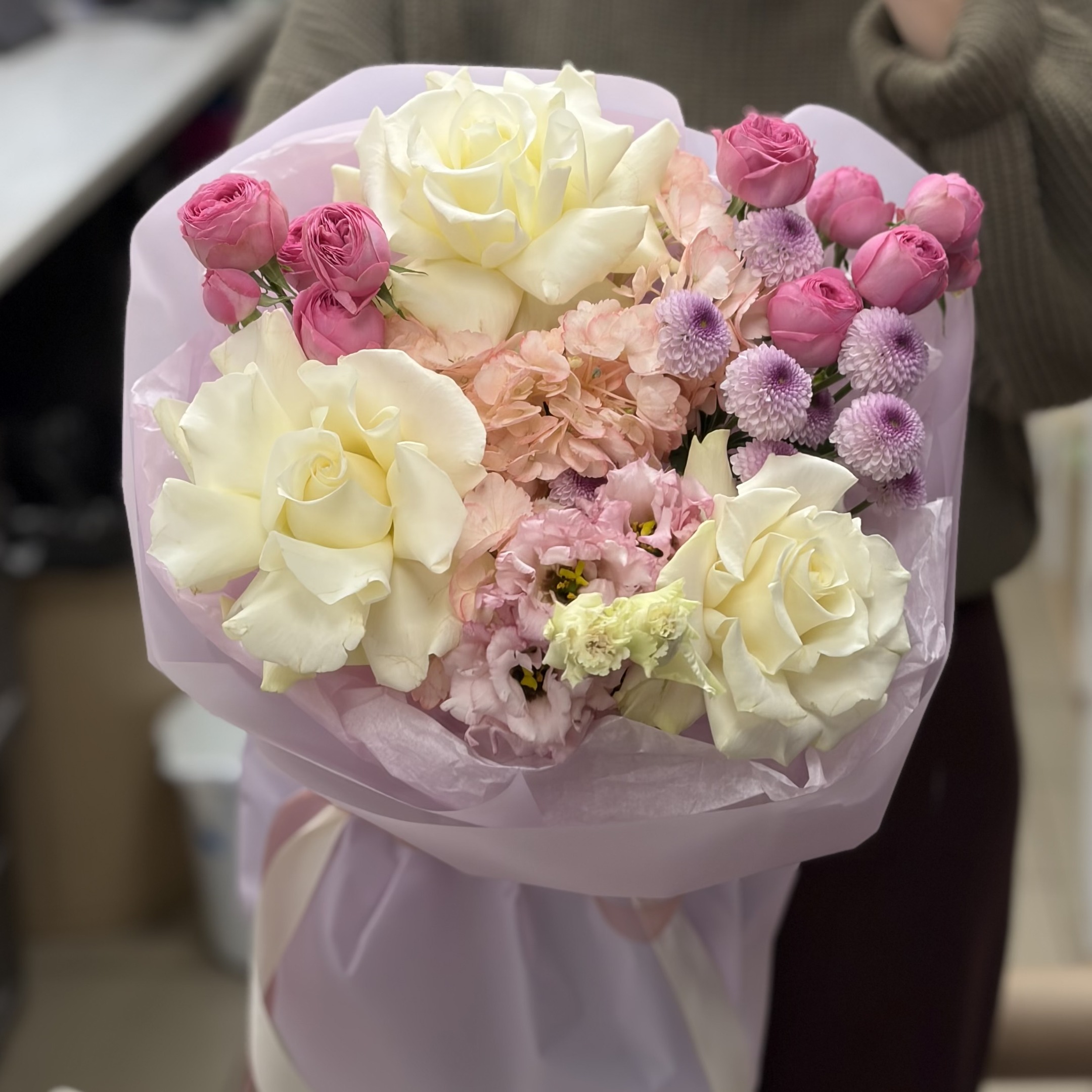 Состав: 1 эустома, 2 кустовые розы, 1 хризантема, 1 гортензия, французские розы и упаковка