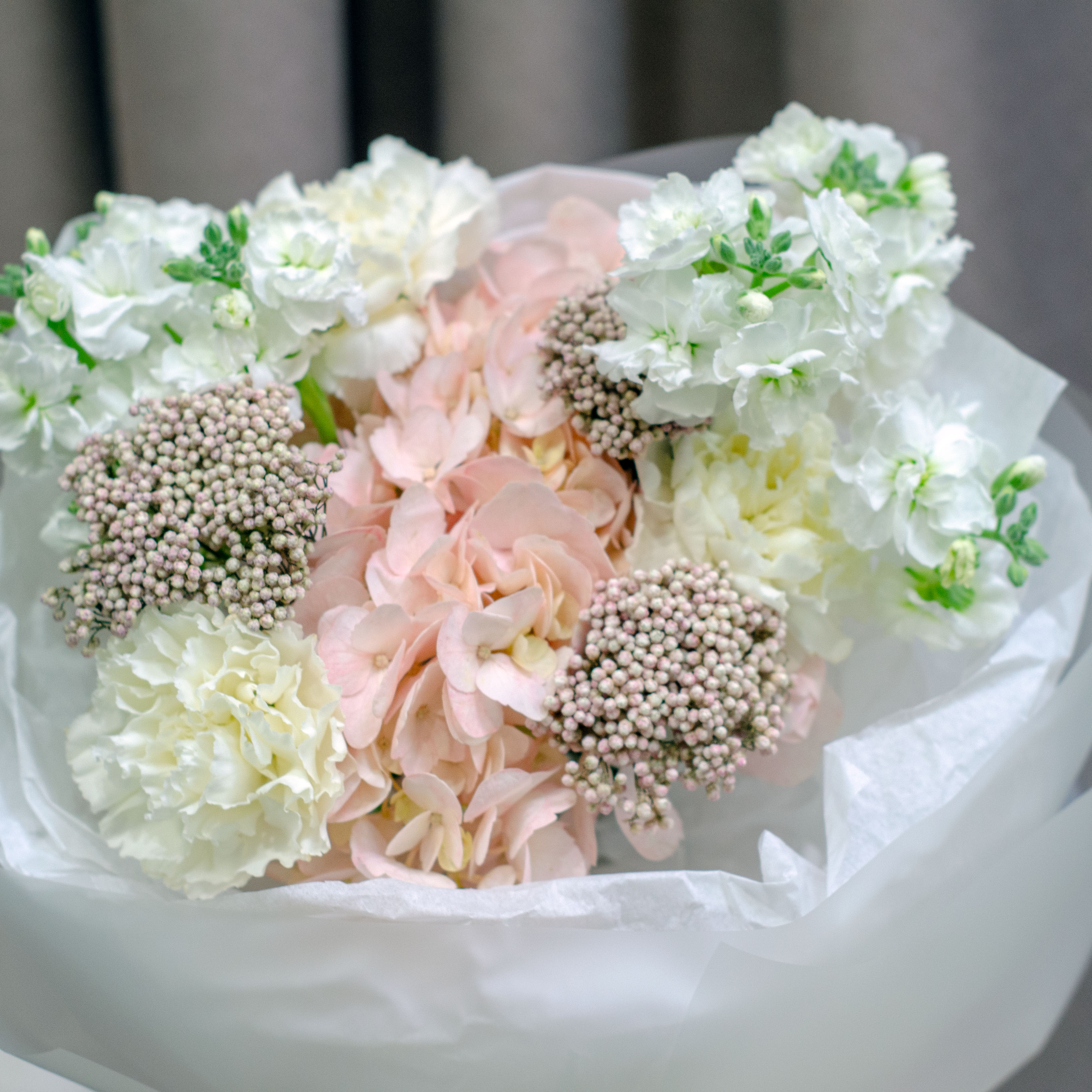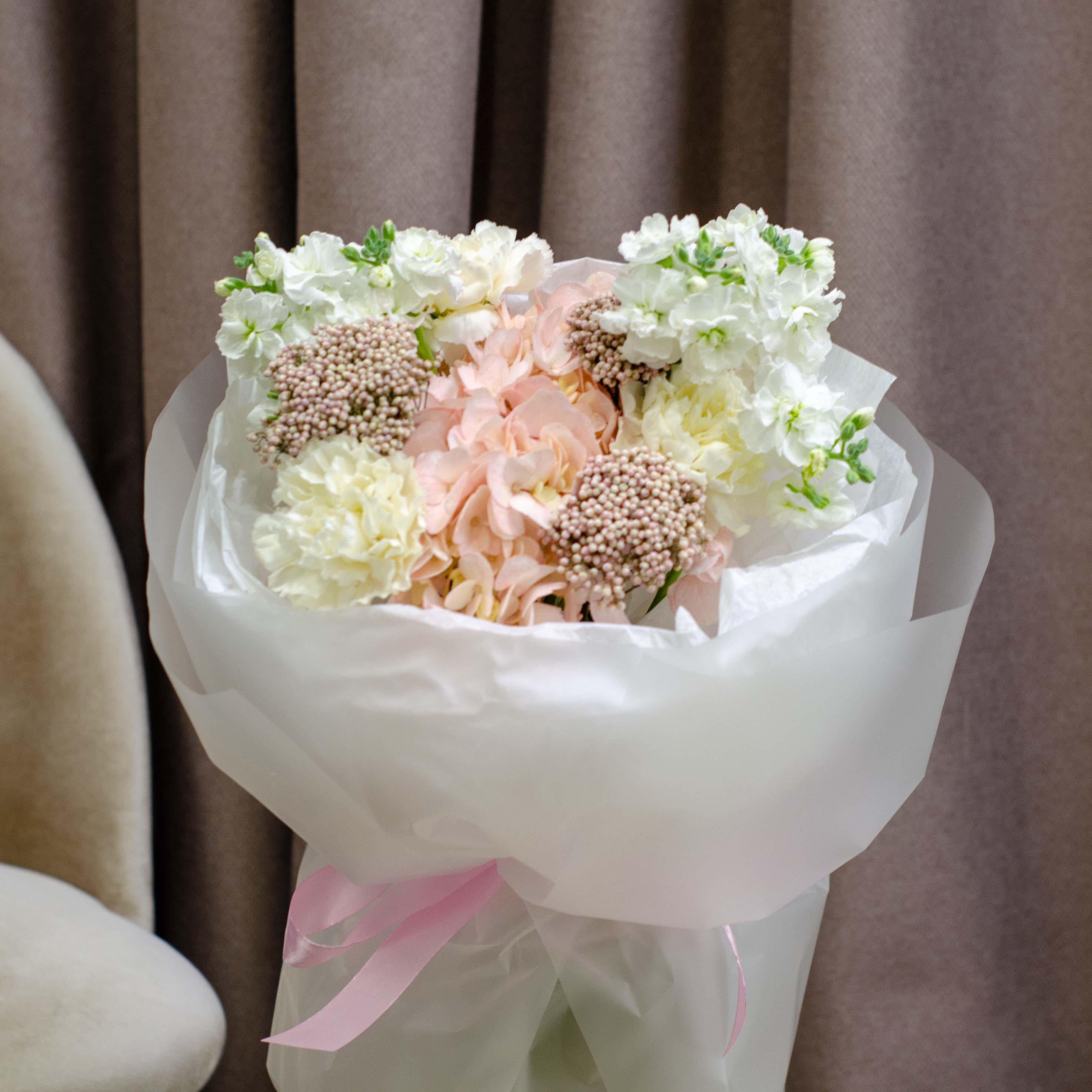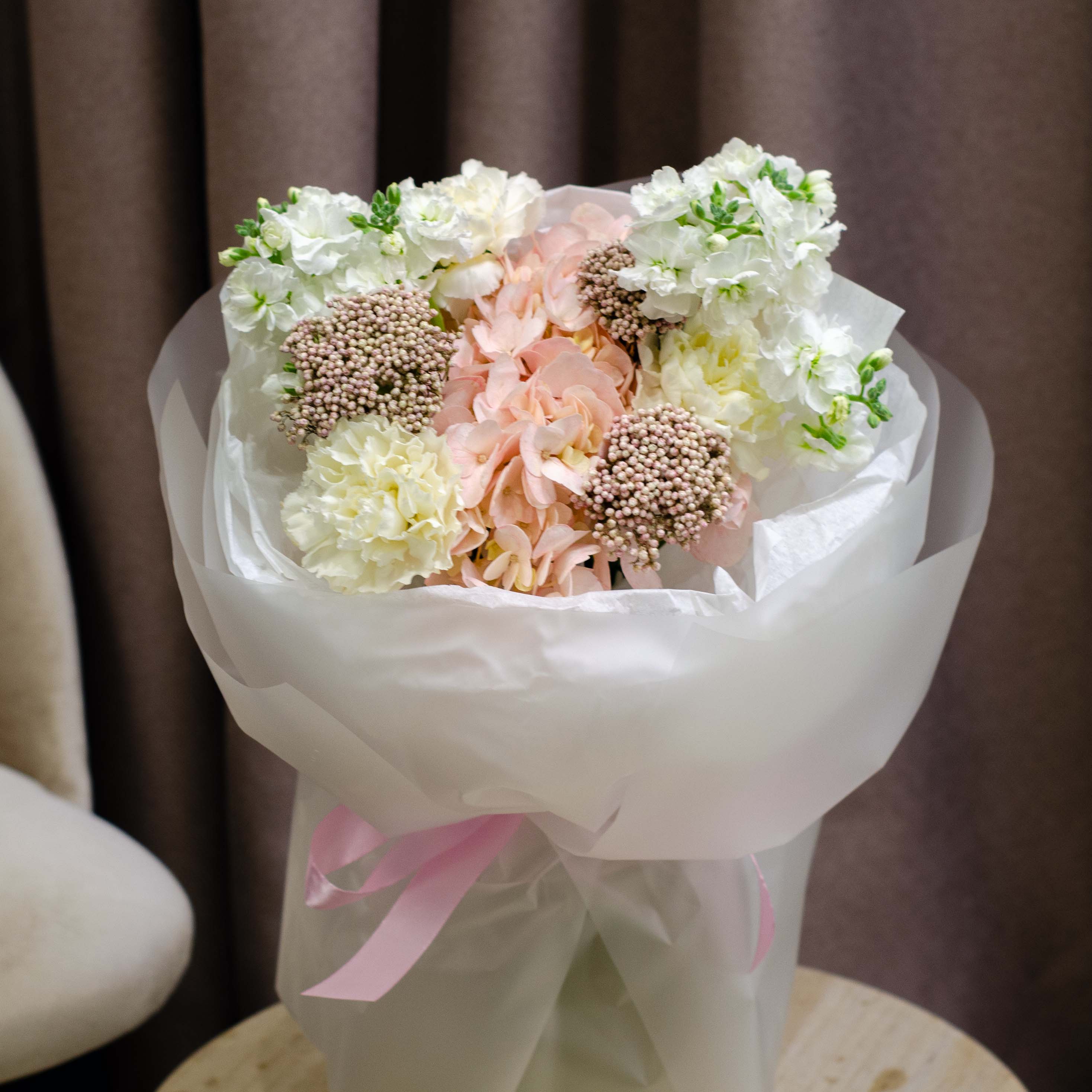 Состав: 3 гвоздики, 2 маттиолы, 3 озотамнуса, 1 гортензия и упаковка