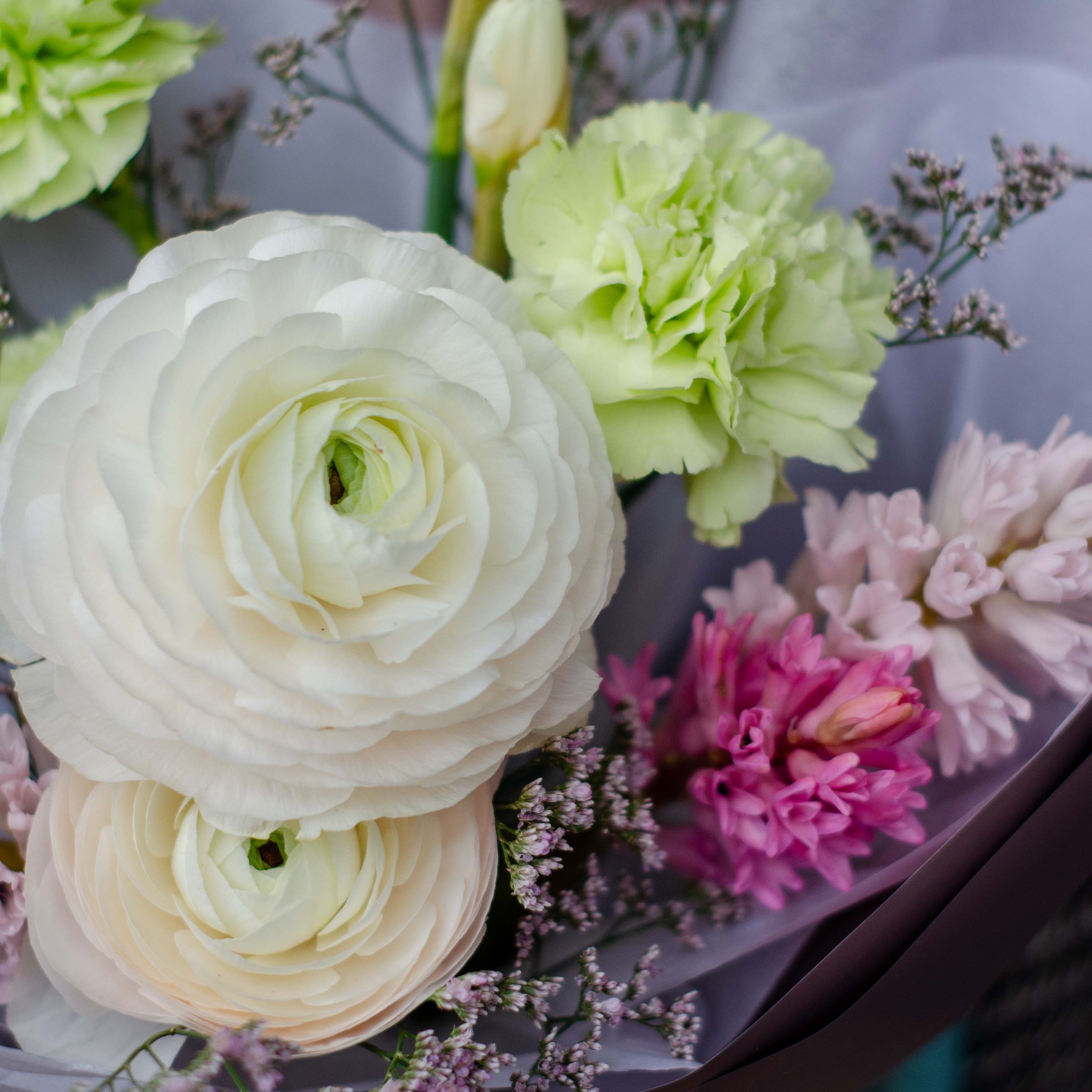 Состав: 3 нарцисса, 3 гиацинта, 2 ранункулюса, 3 гвоздики, 1 лимониум и упаковка