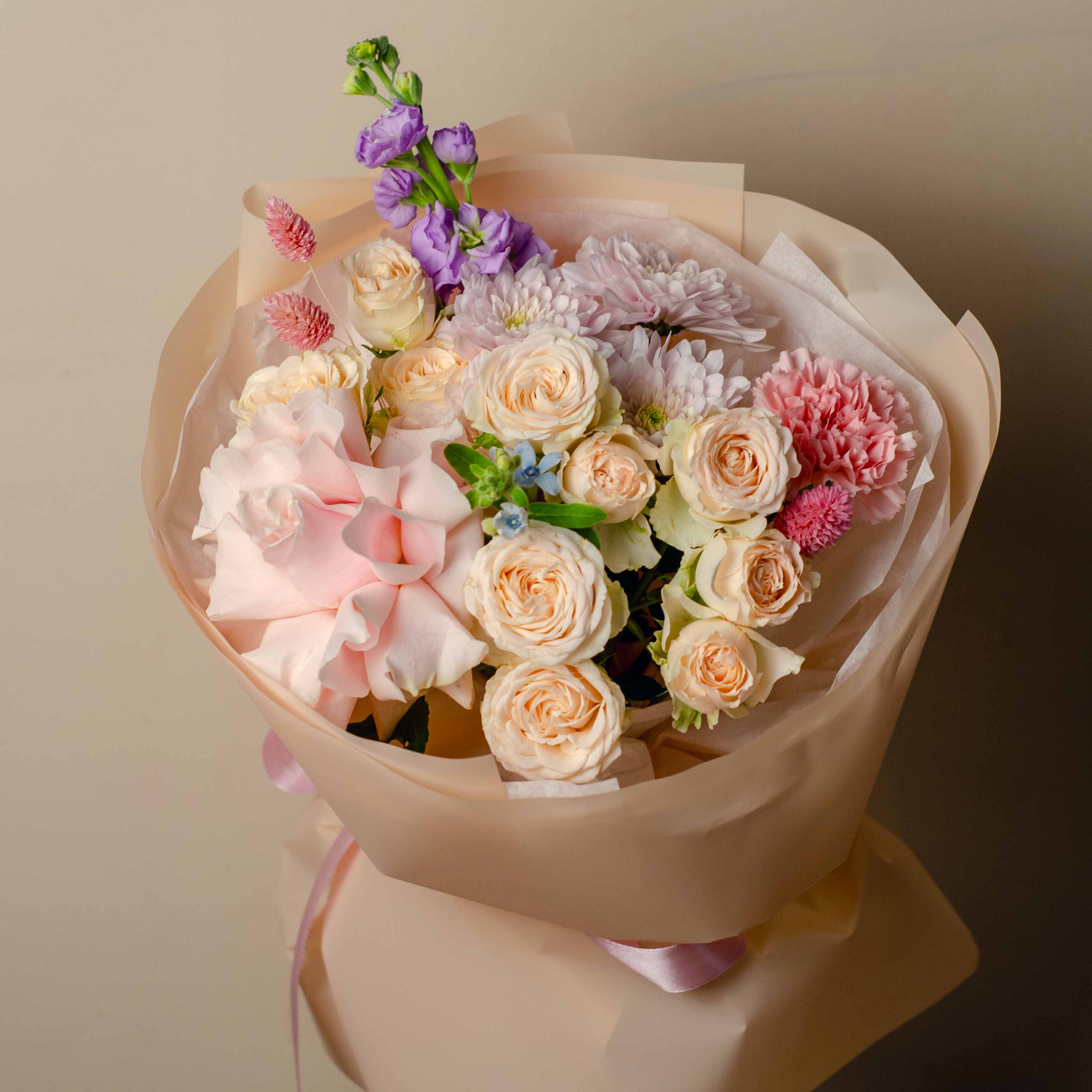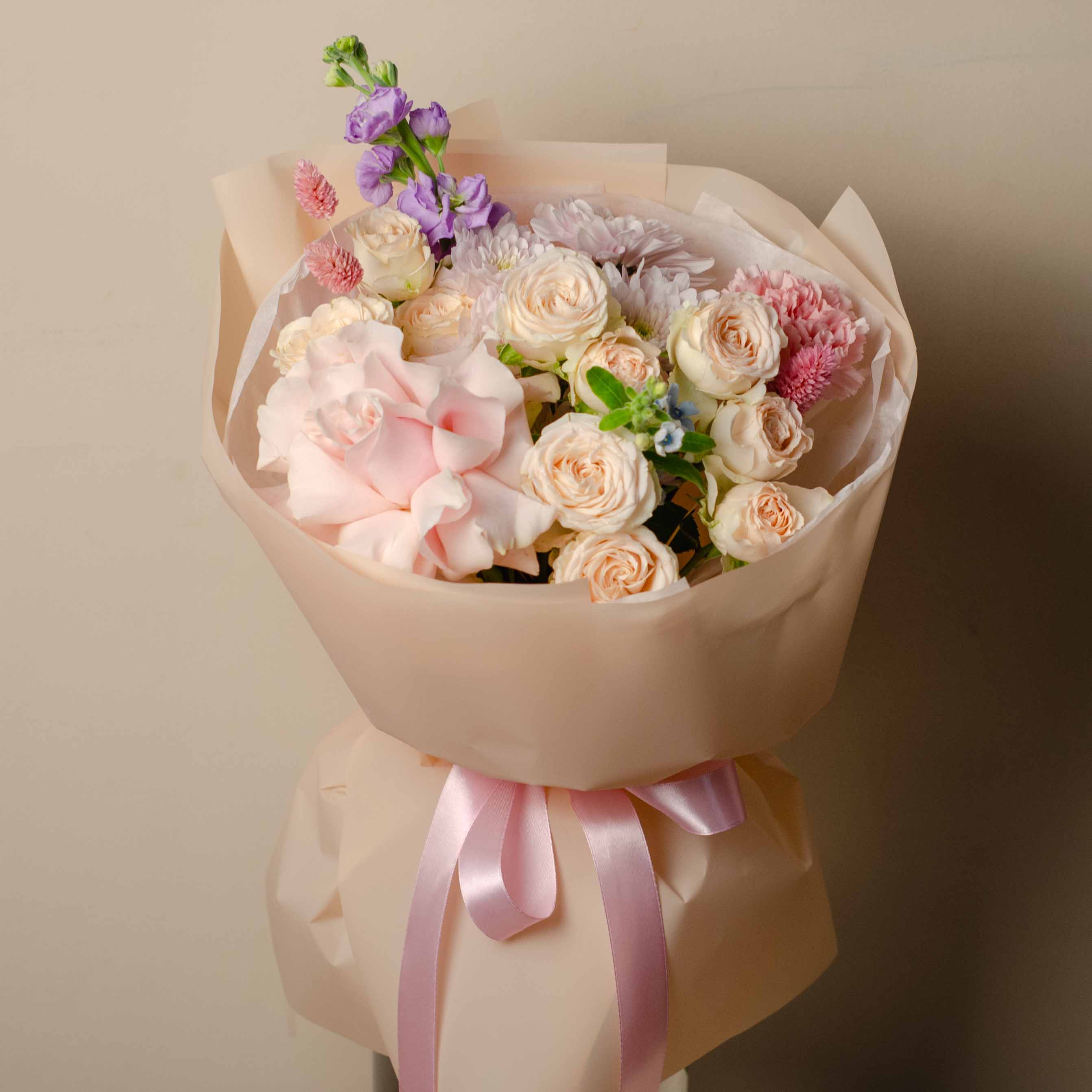 Состав: 1 французская роза, 2 кустовые розы, 1 маттиола, 1 гвоздика, 1 оксипеталум, 1 хризантема, фалярис и упаковка