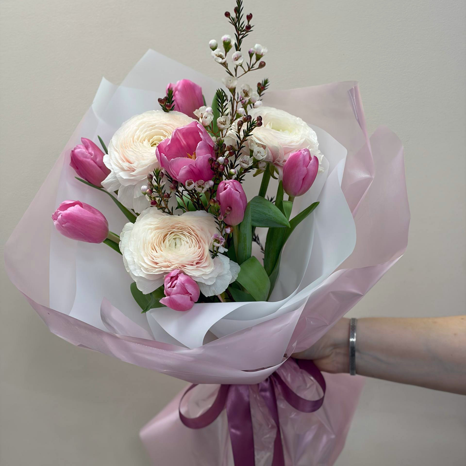 Состав: 7 тюльпанов, 3 ранункулюса, хамелациум и упаковка