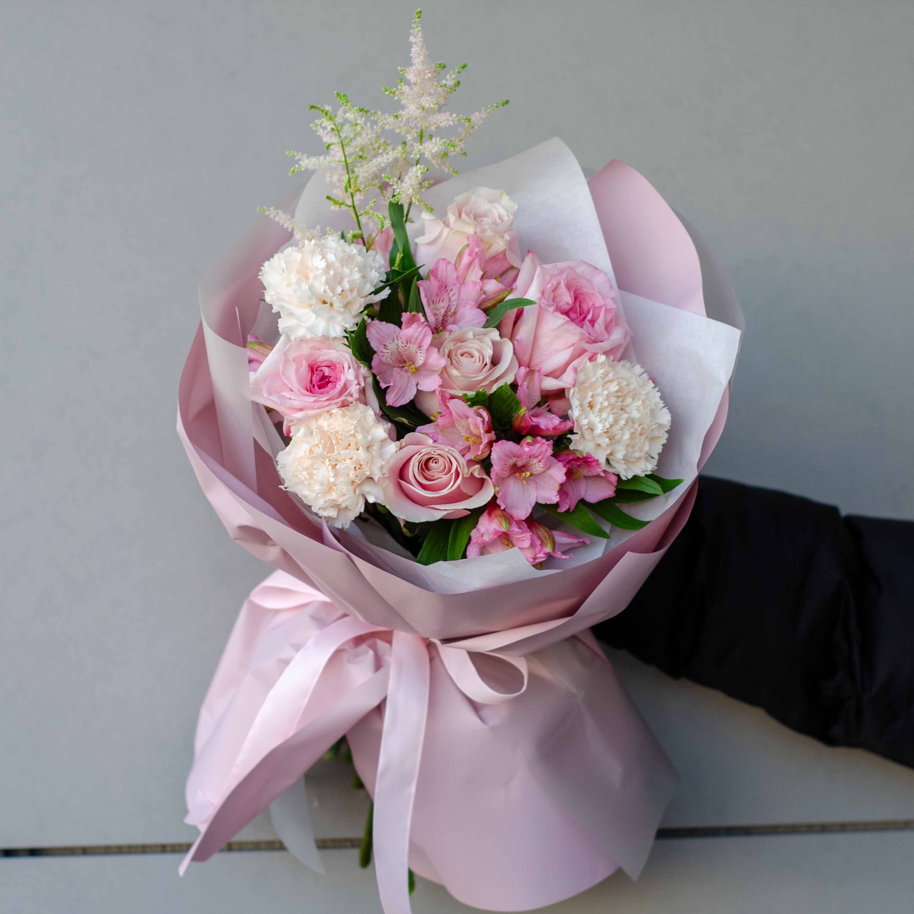 Состав: 2 розы Пинк Охара, 3 Пинк Мондиаль, 2 альстромерии, 2 астильба, 3 гвоздики и упаковка