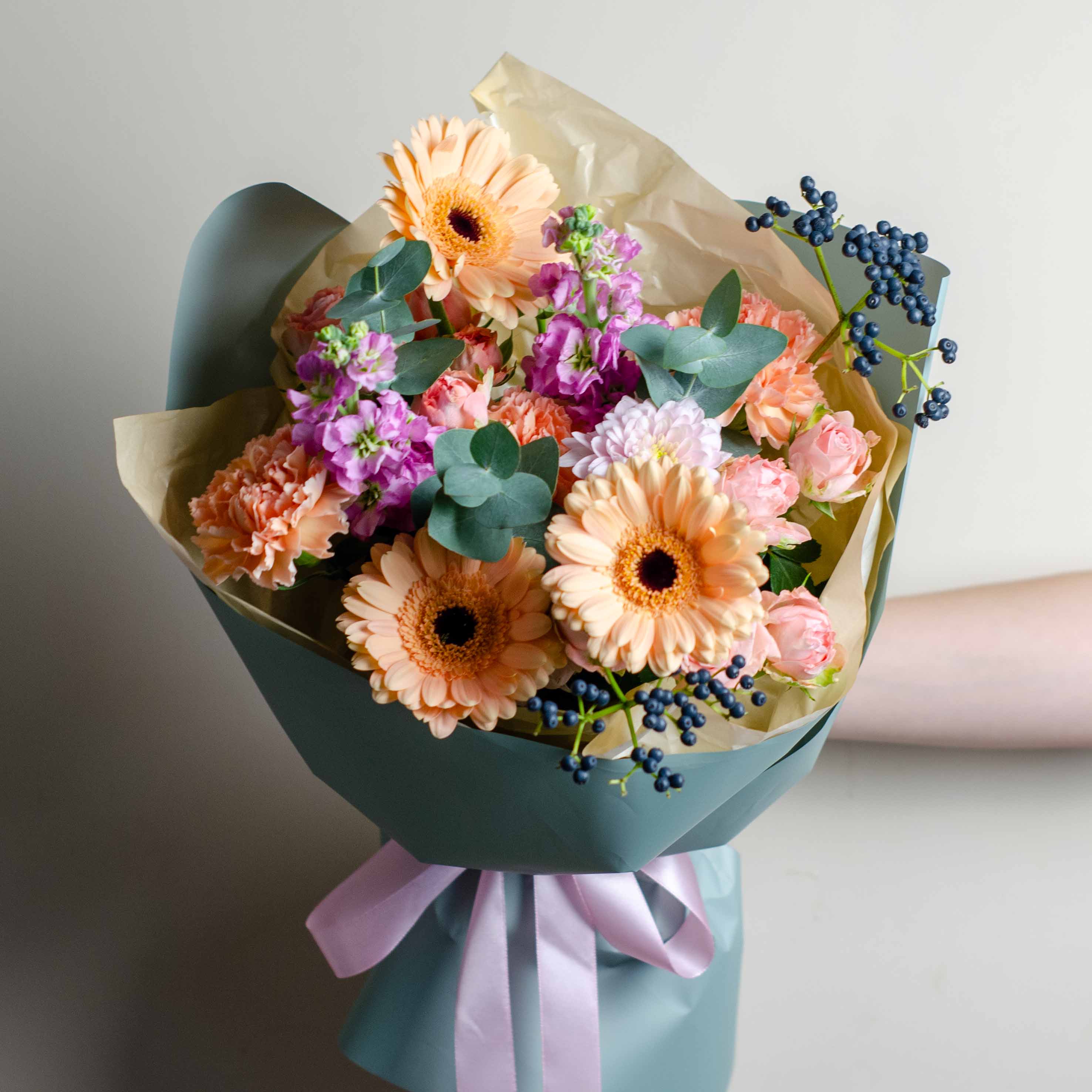 Состав: 1 хризантема Пастелла, 3 мини-герберы, 2 кустовые розы Бомбастиик, 3 гвоздики, 2 маттиолы, 1 вибурнум, эвкалипт и упаковка
