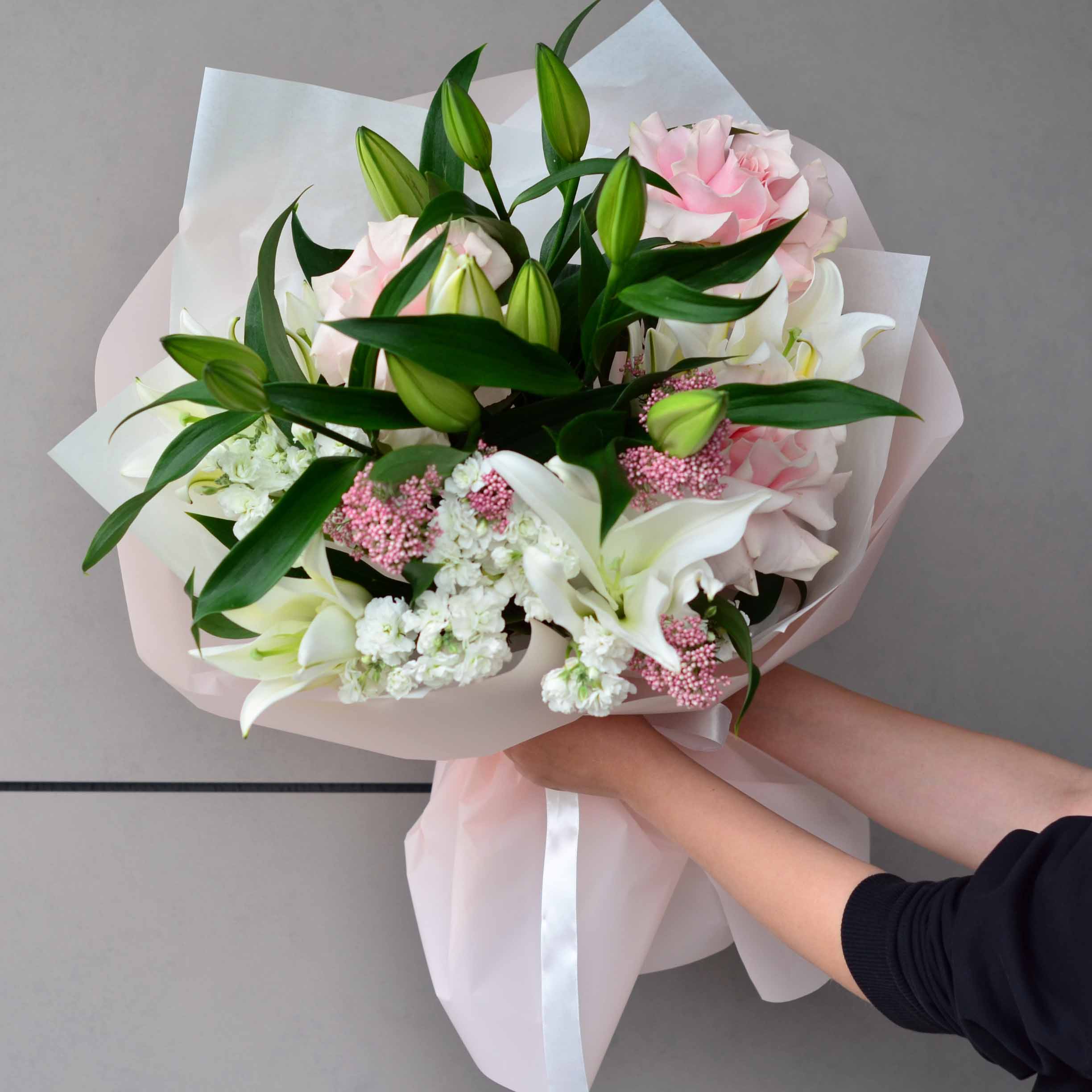 Состав: 3 французские розы, 3 лилии, 1 озотамнус, 2 маттиолы и упаковка.