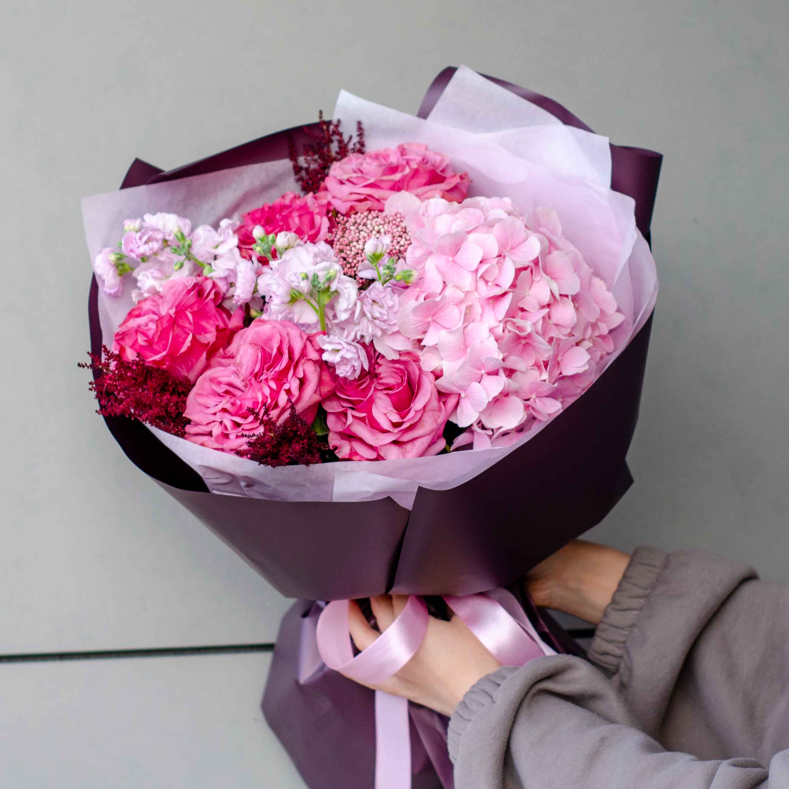 Состав: 5 пионовидных роз, 2 маттиолы, 1 озотамнус, 1 гортензия, 3 астильбы и упаковка.
