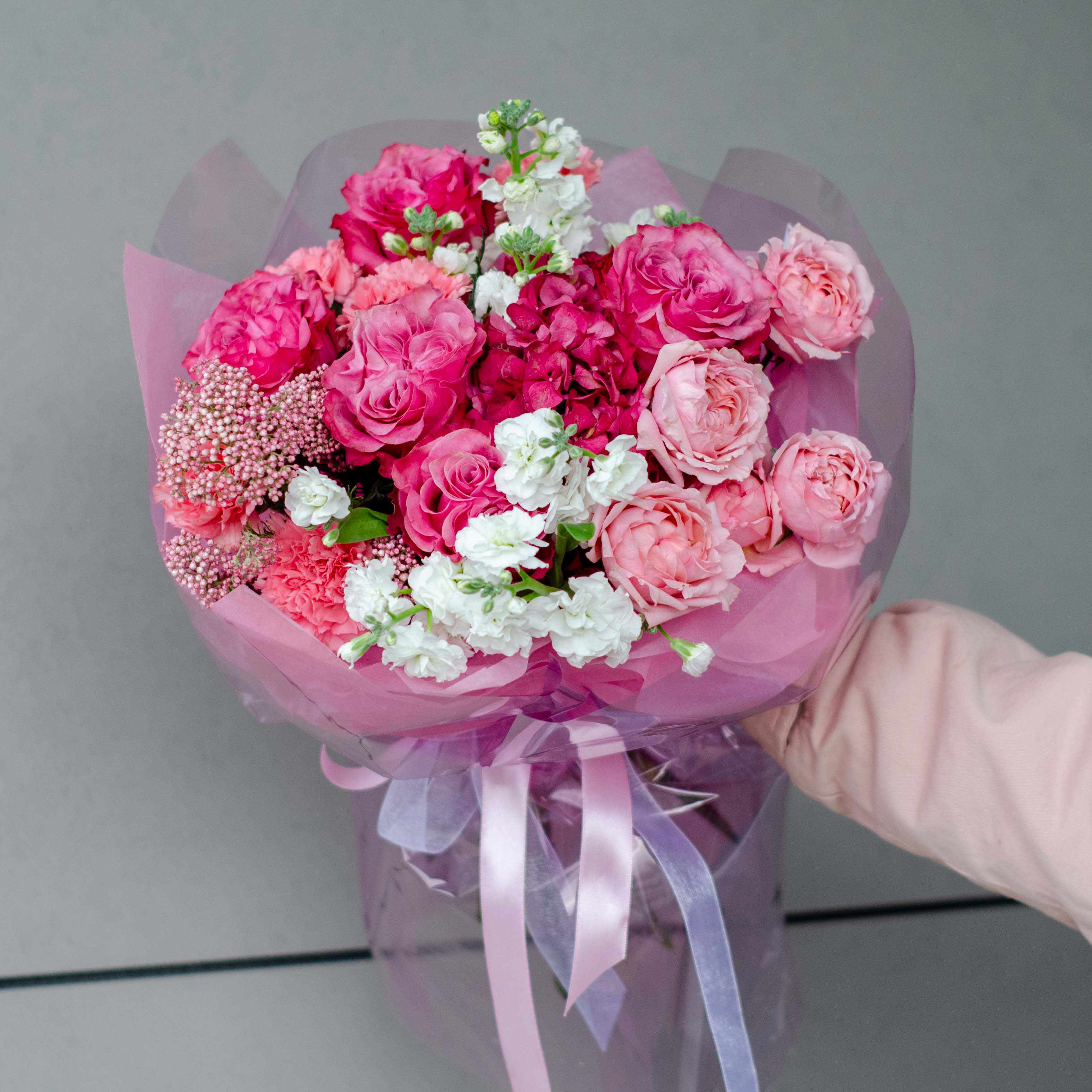 Состав: 5 роз Кантри Блюз, 5 гвоздик, 1 джульетта кустовая, 2 маттиолы, 1 озотамнус, 1 гортензия и упаковка.