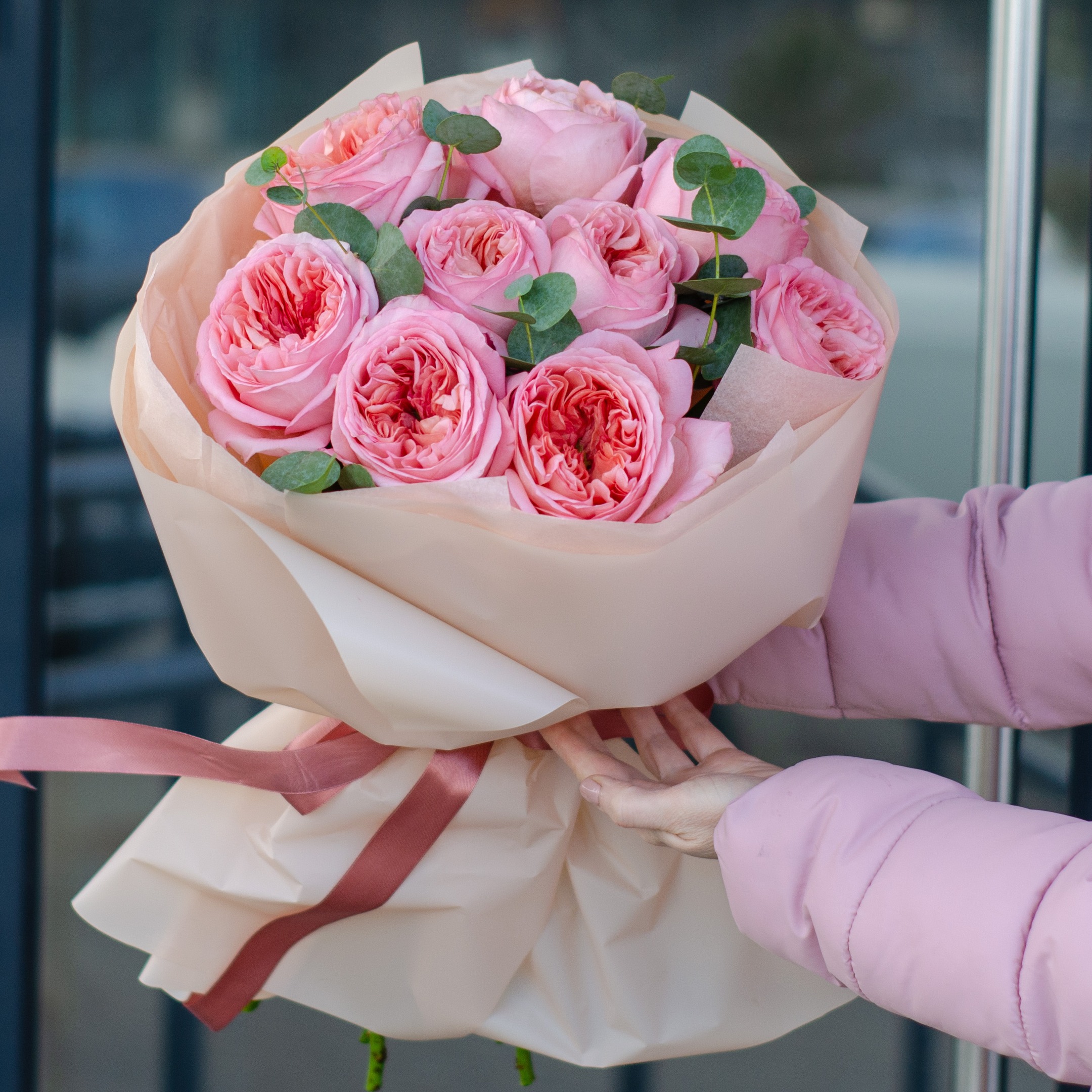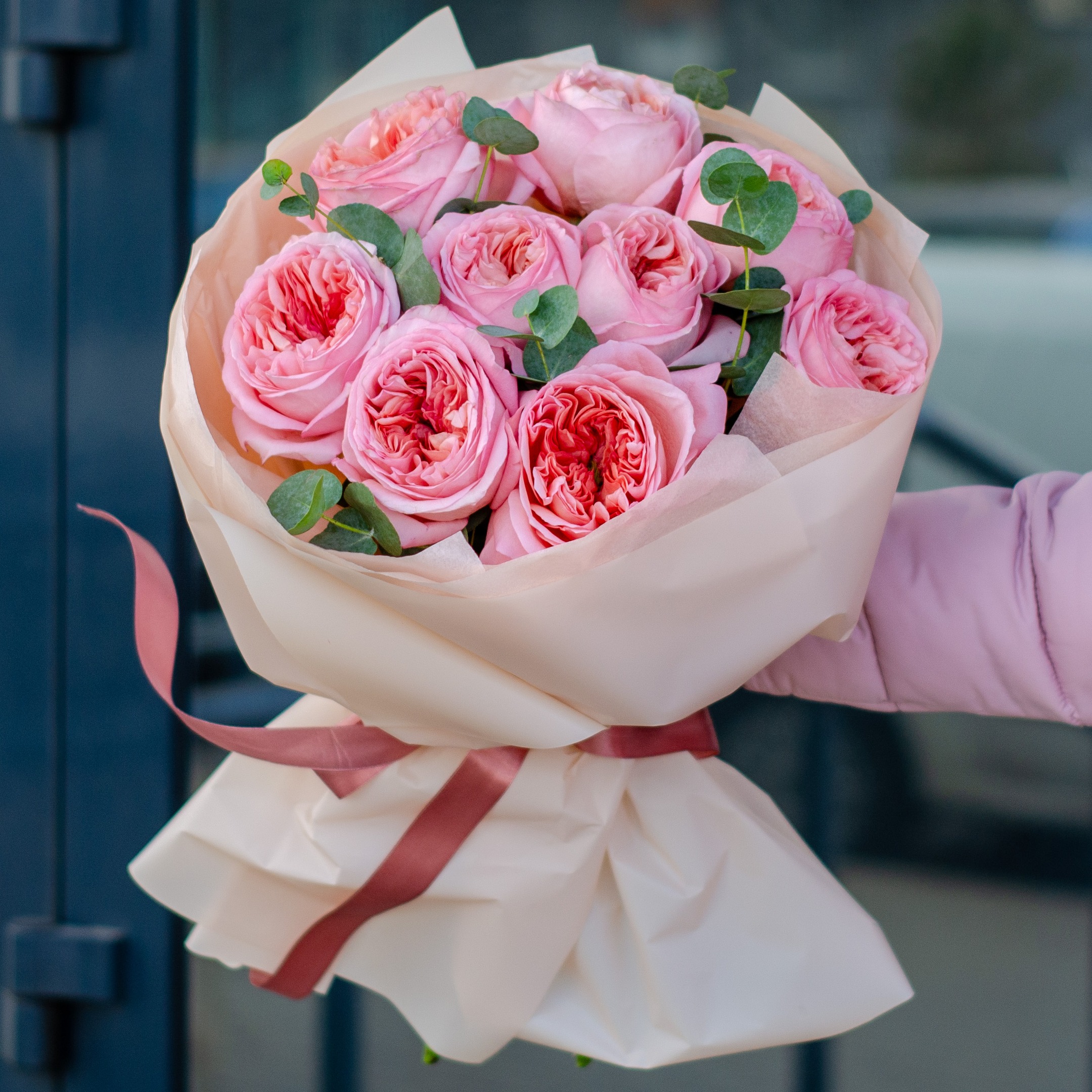 Состав: 9 роз Пинк Экспрешн, эвкалипт и упаковка