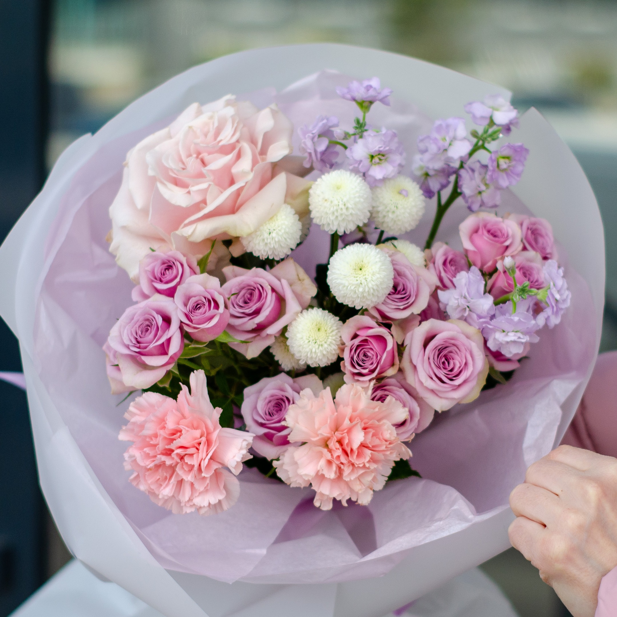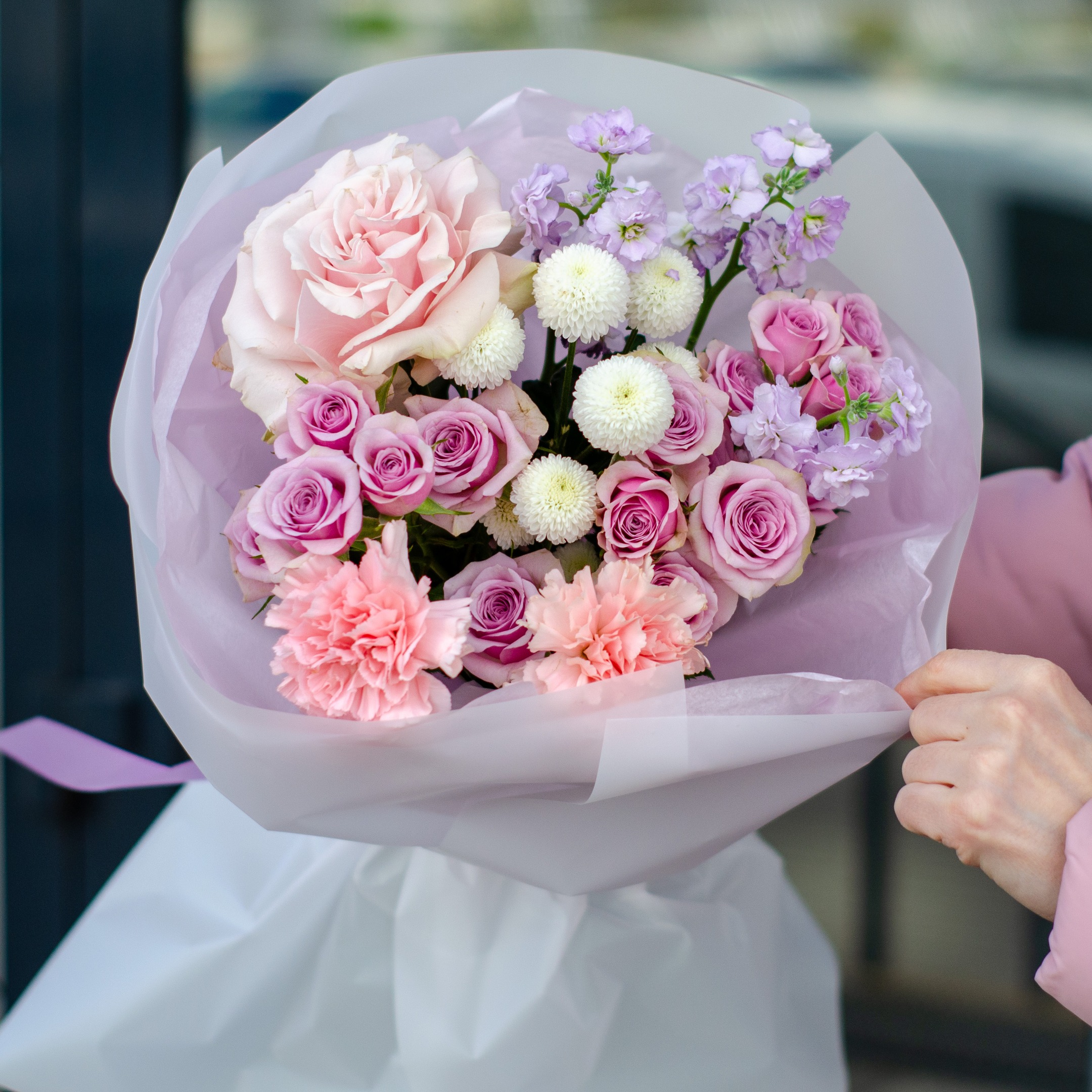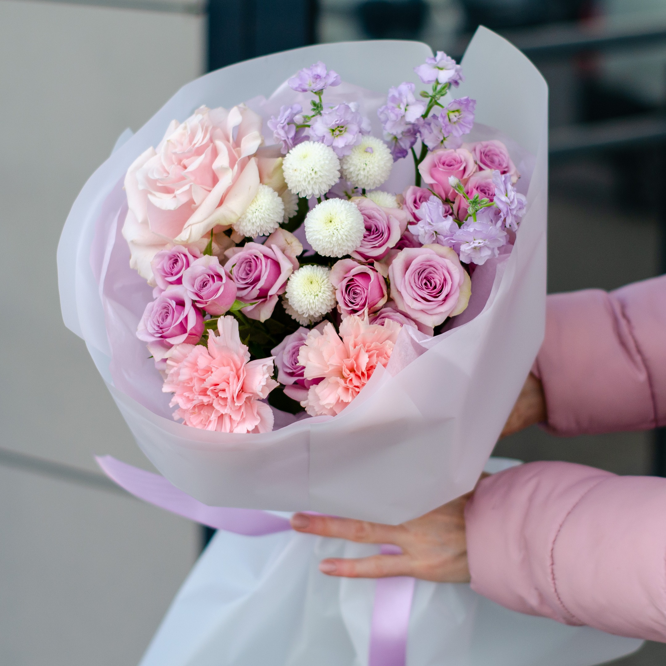 Состав: 1 французская роза, 1 маттиола кустовая, 3 кустовые розы, 2 гвоздики, 1 хризантема и упаковка