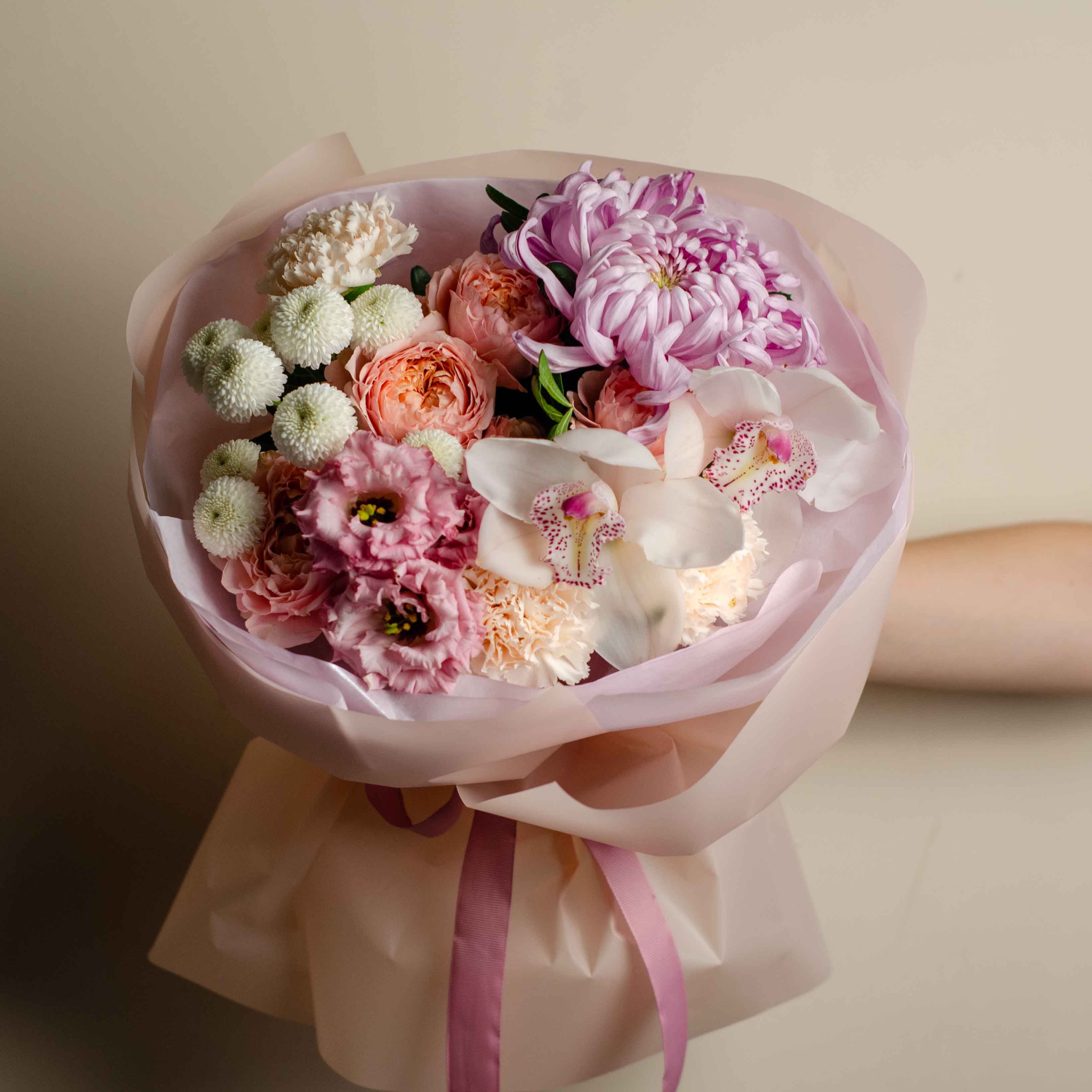 Состав: 1 хризантема Виена Пинк, 1 кустовая хризантема кокос, 1 кустовая роза Джульетта, 1 эустома Алиса, 2 цимбидиума белых, 3 гвоздики, фисташка и упаковка