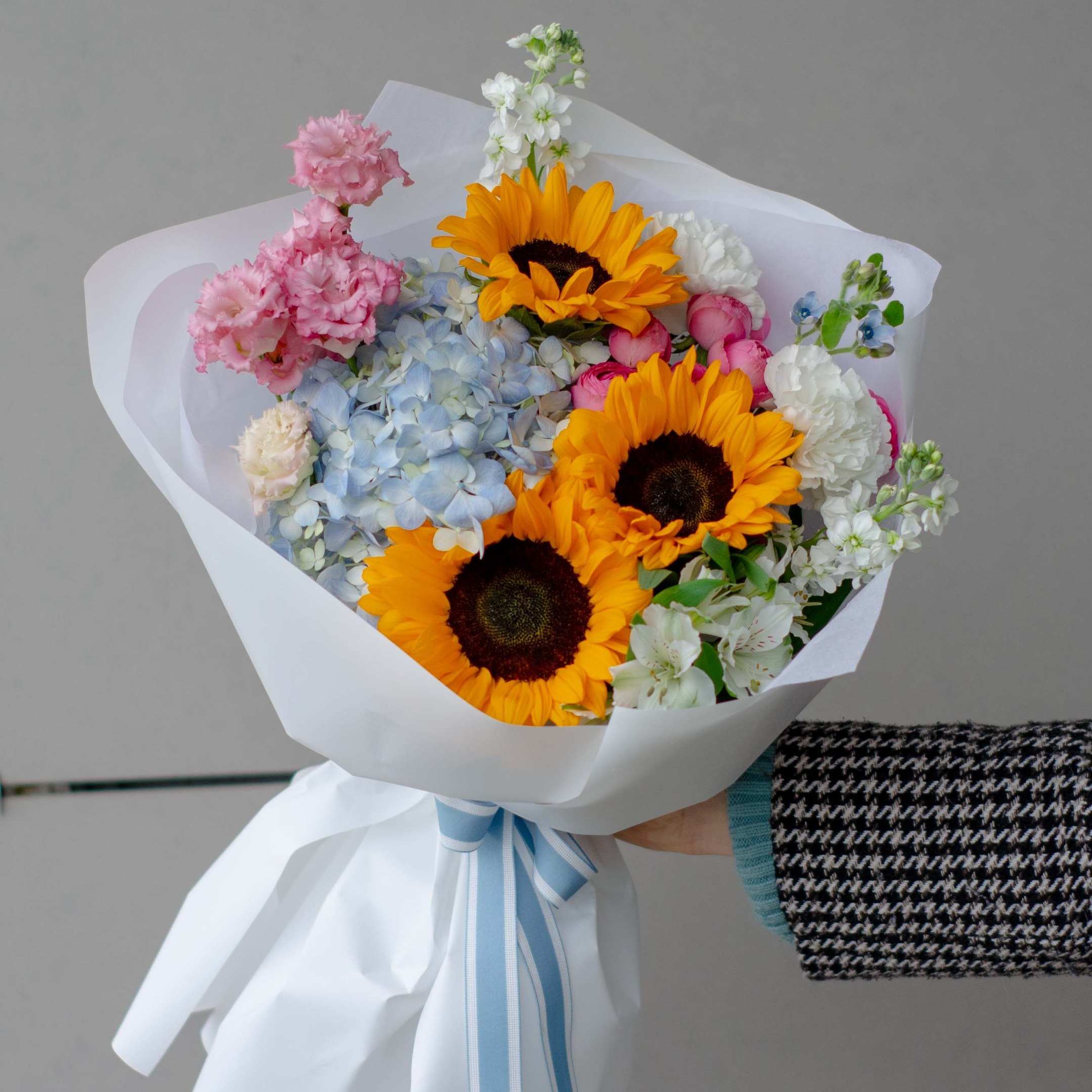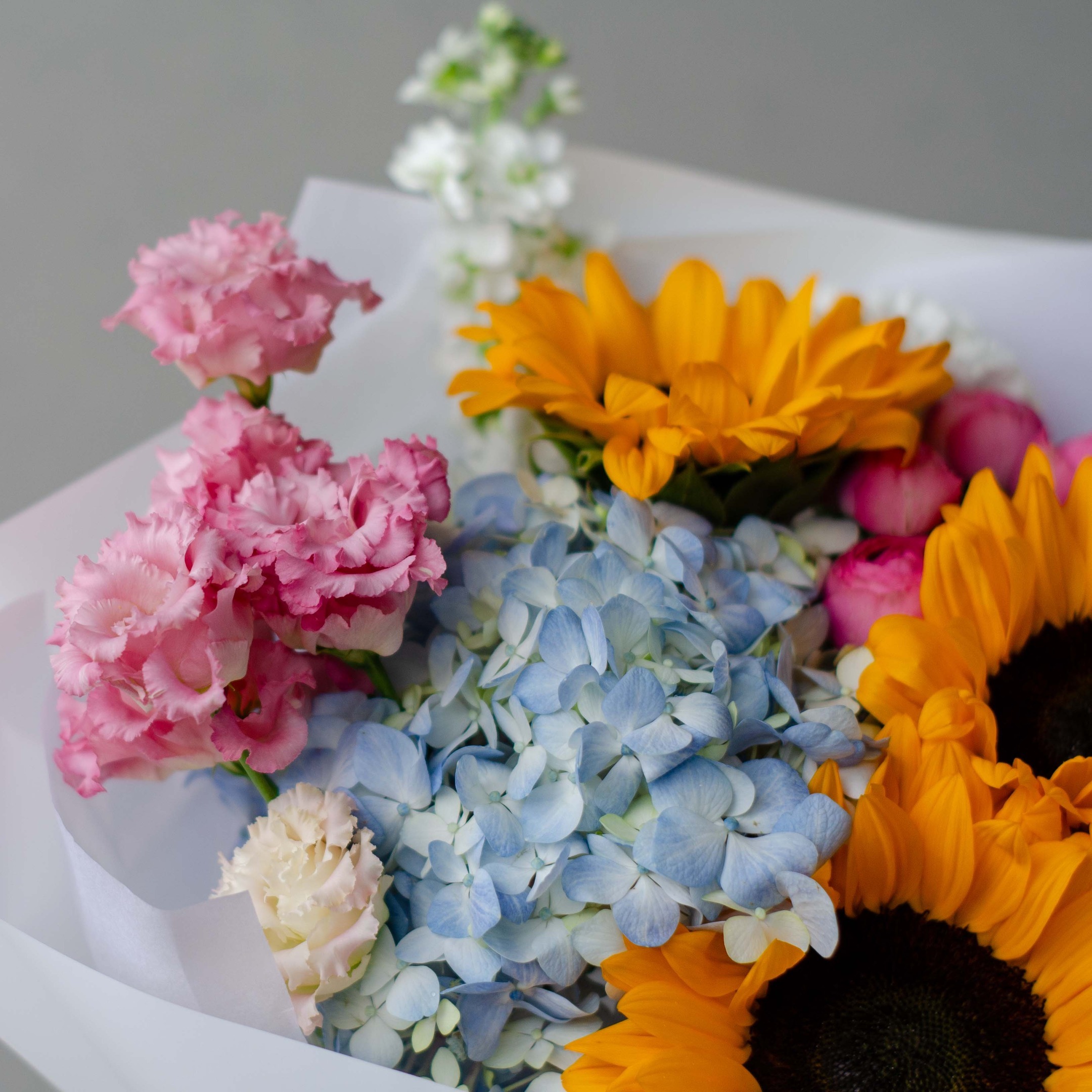Состав: 3 подсолнуха, 1 гортензия, 1 оксипеталум, 2 жизель, 1 эустома розовая Алиса, 2 маттиолы, 2 гвоздики, 1 альстромерии и упаковка.