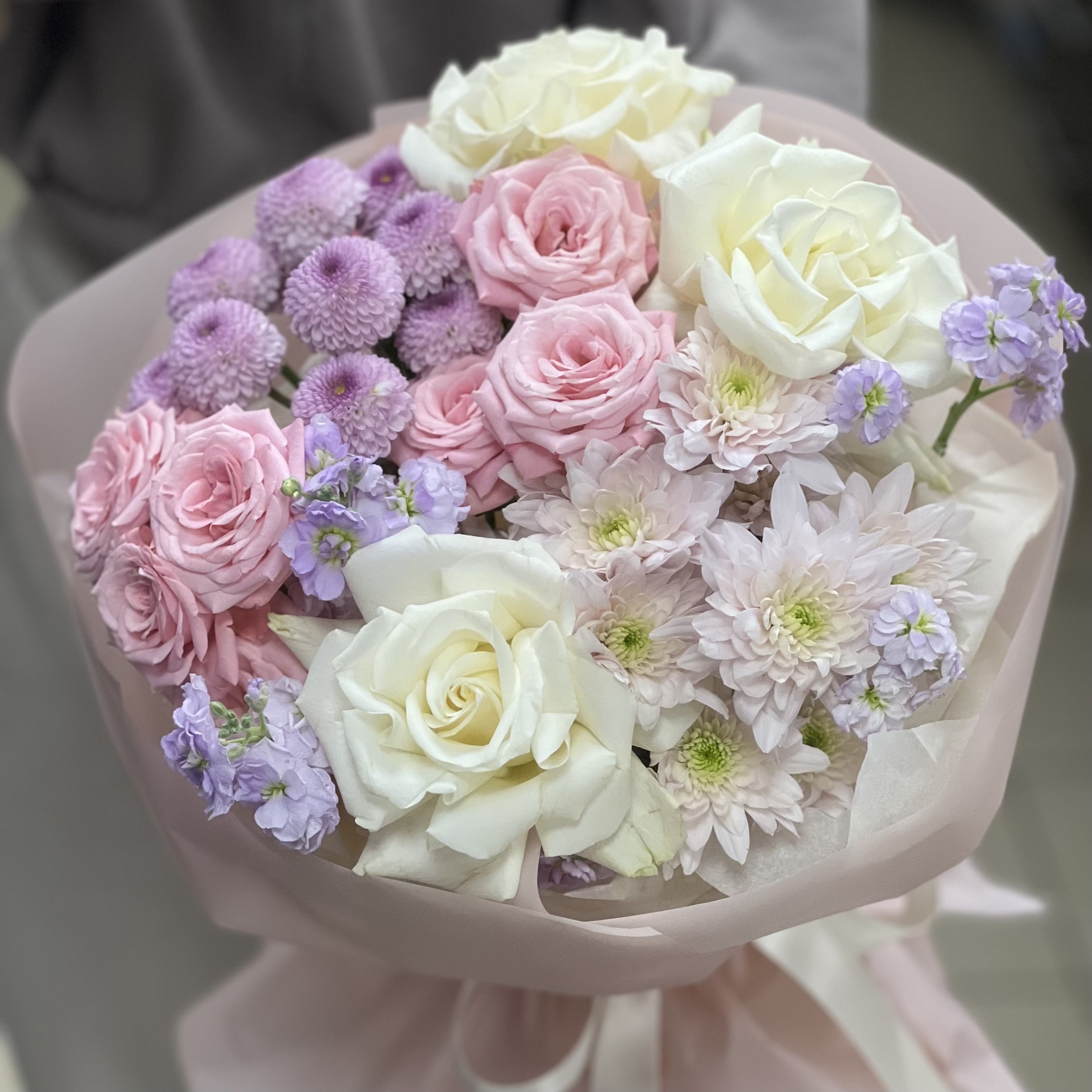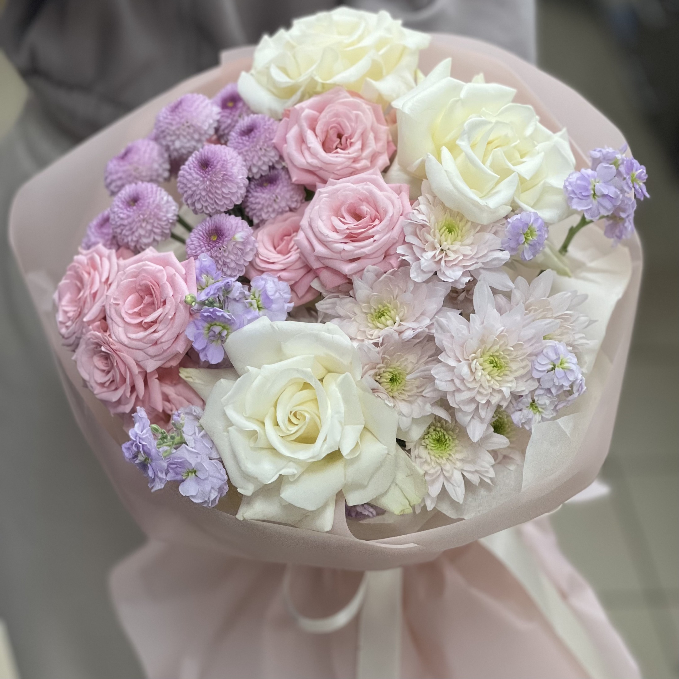 Состав: 2 хризантемы, 3 французские розы, 2 кустовые розы, 2 маттиолы и упаковка