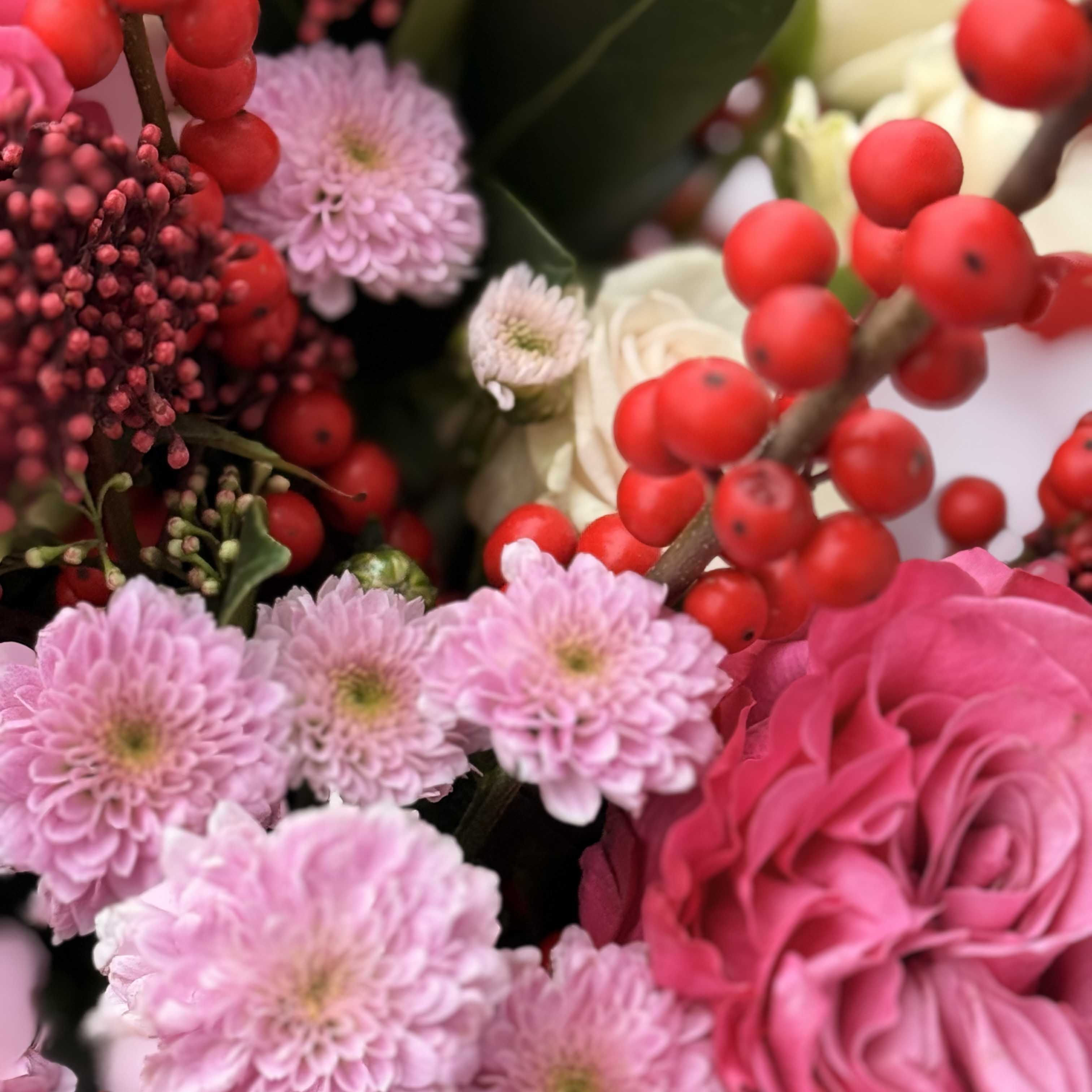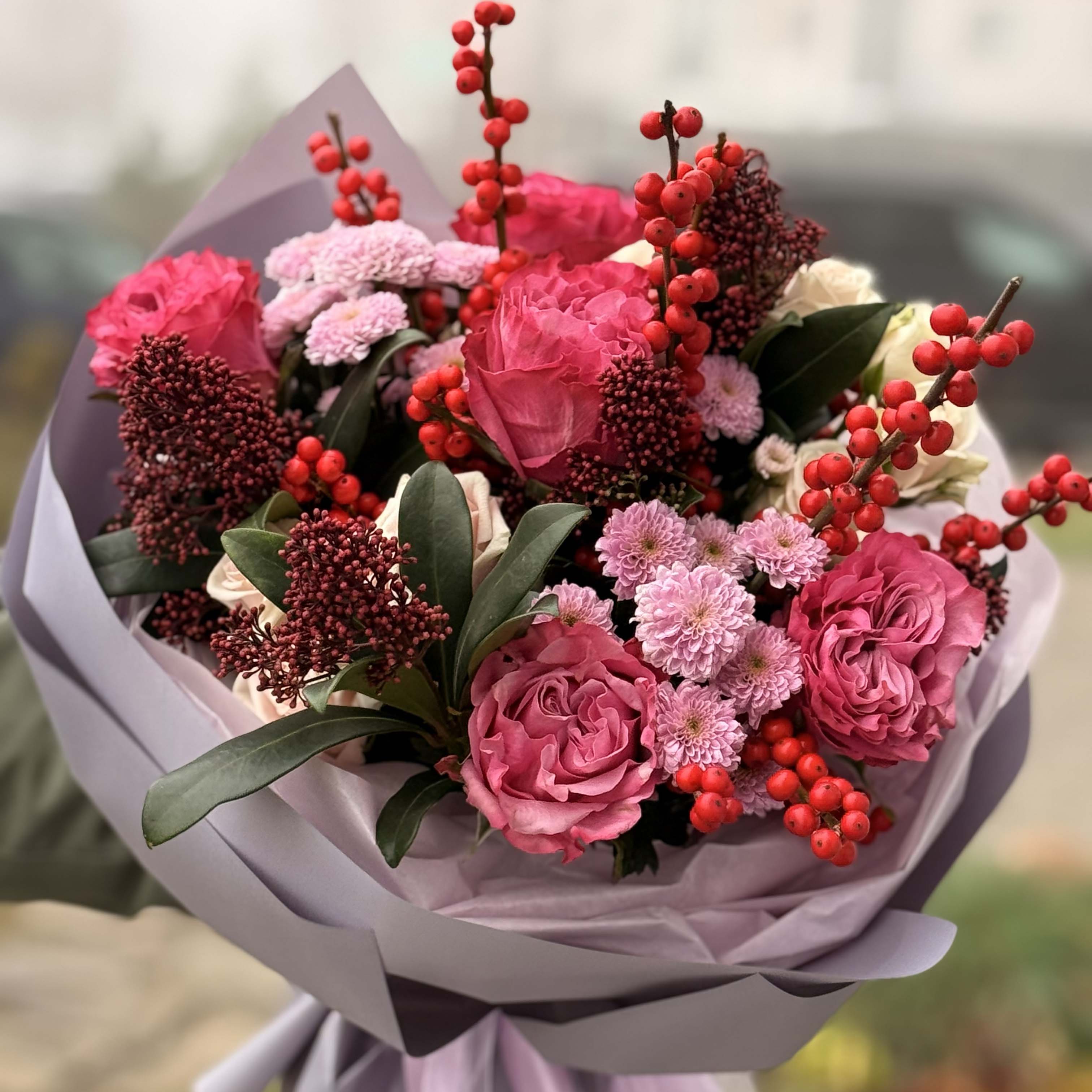 Состав: 5 роз кантри блюз, 2 илекса, 3 хризантемы сантини, 1 скимия, 3 роял порселины и упаковка