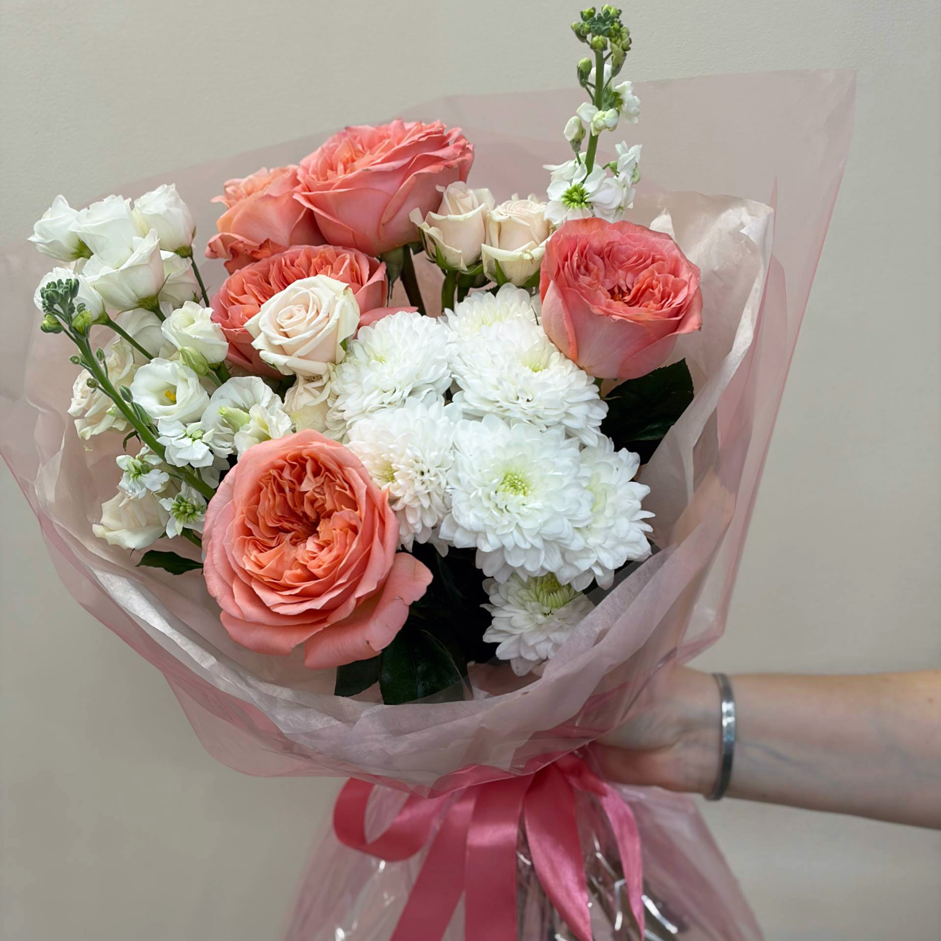 Состав: 5 пионовидных роз, 1 хризантема, 2 кустовые розы, 1 эустома, 2 маттиолы и упаковка