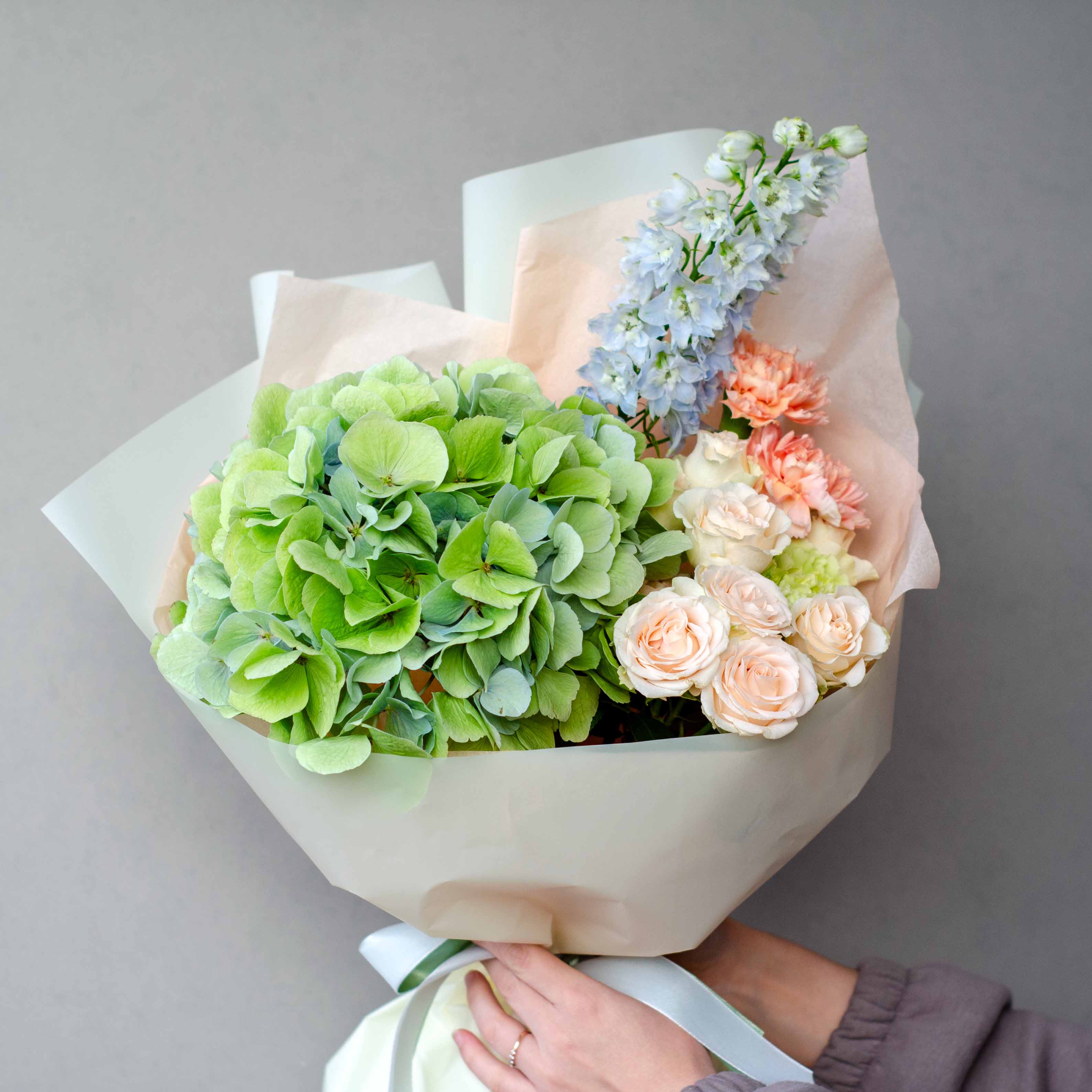 Состав: гортензия, 2 кустовые розы, 1 дельфиниум, 3 гвоздики упаковка.