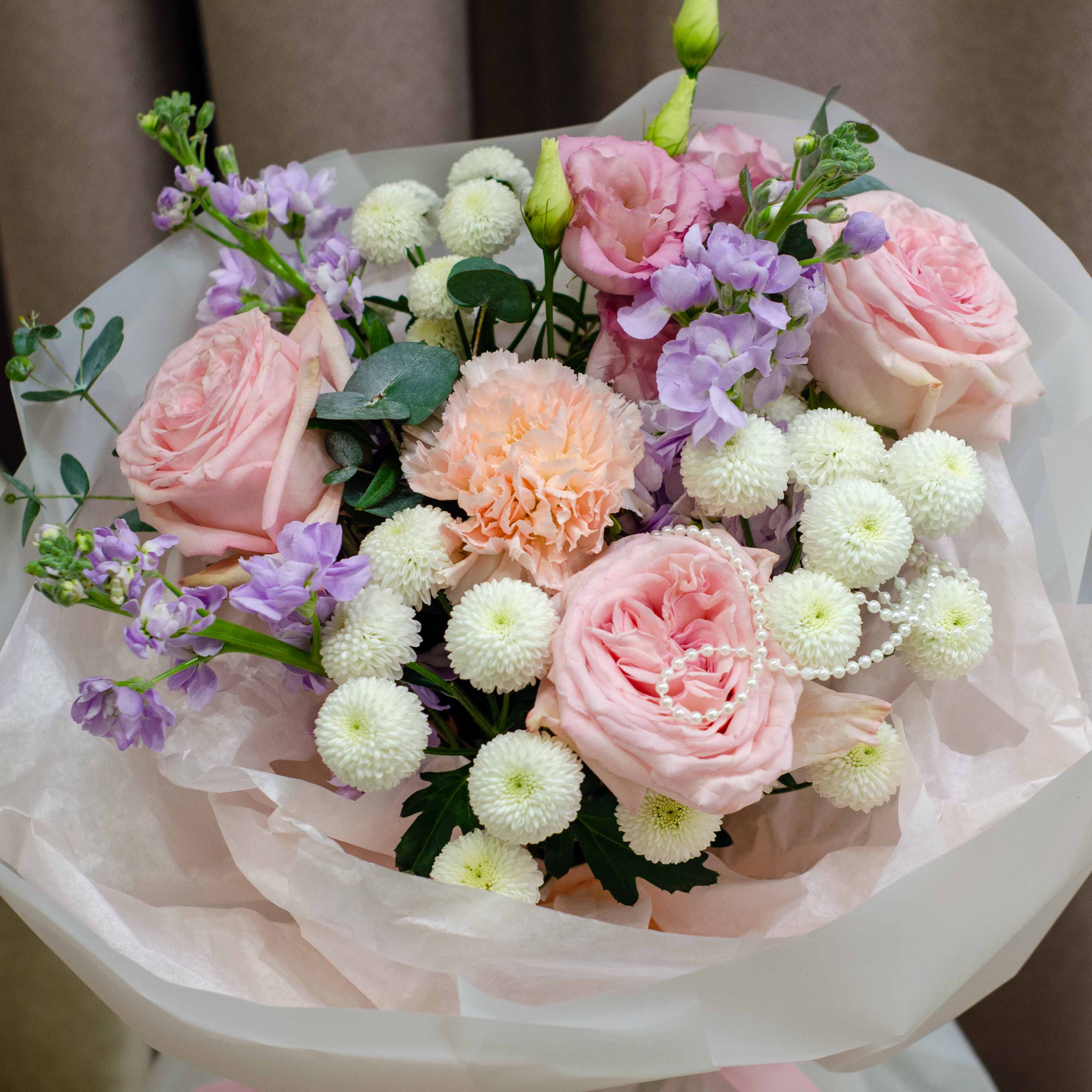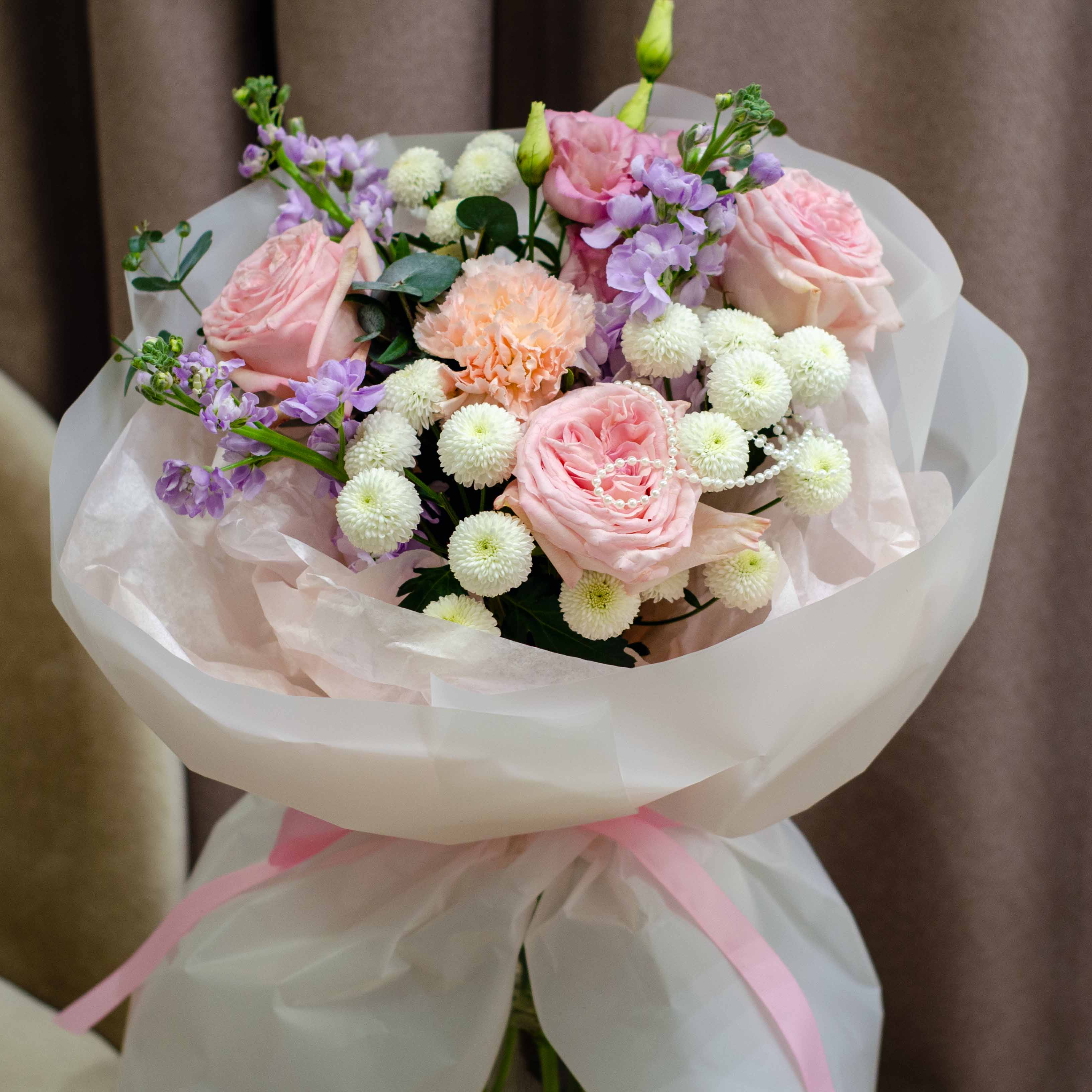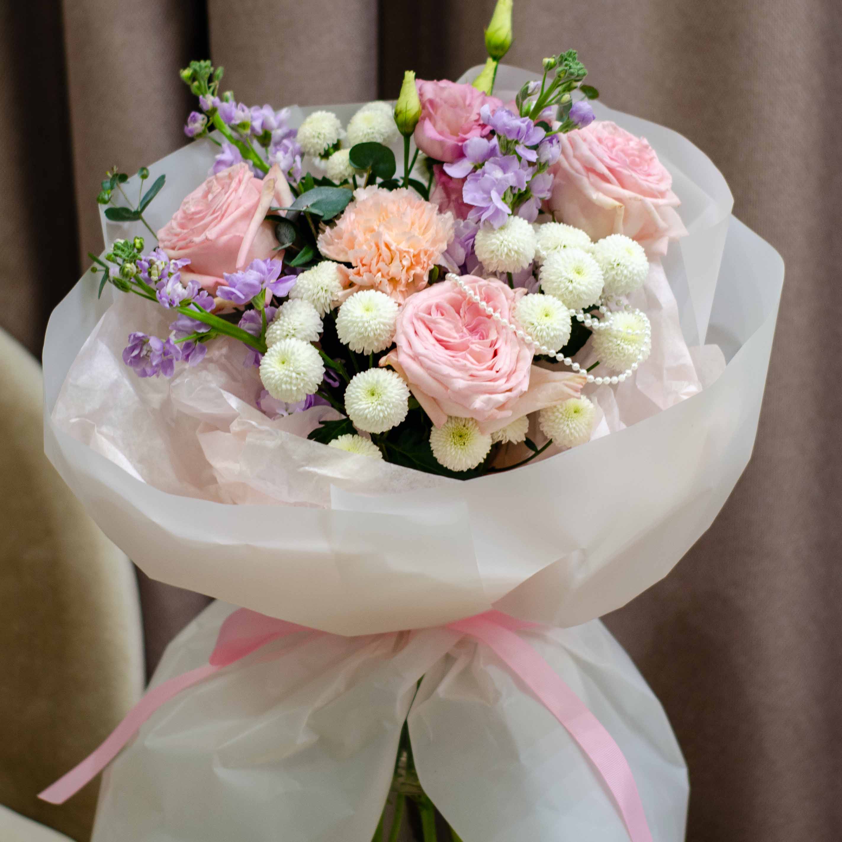 Состав: 3 розы Пинк Охара, 1 эустома, 3 хризантемы,1 гвоздика, эвкалипт, 3 маттиолы и упаковка