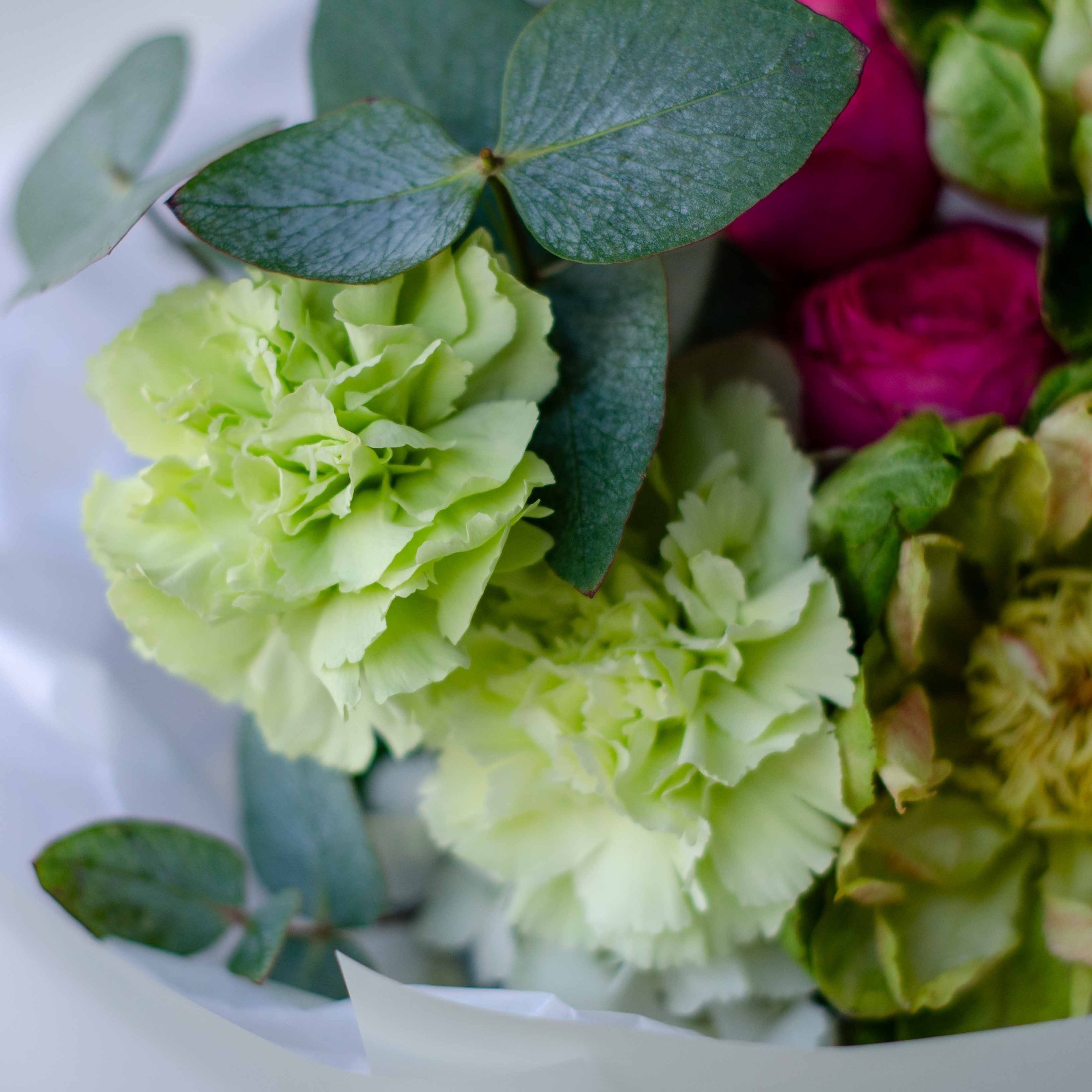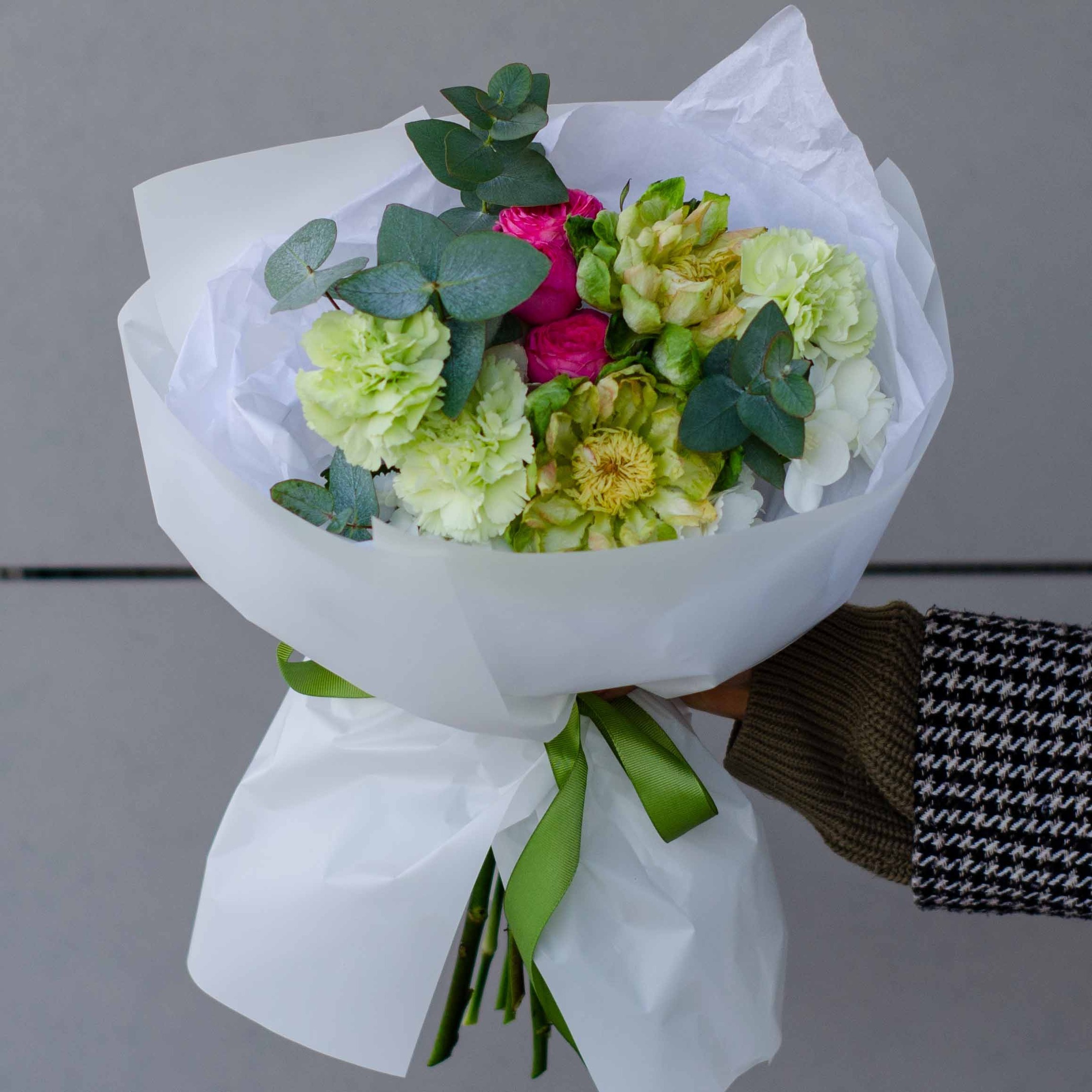 Гортензия, 3 гвоздики, 2 розы Вегги, кустовая Жизель, 1 фрезия, эвкалипт и упаковка