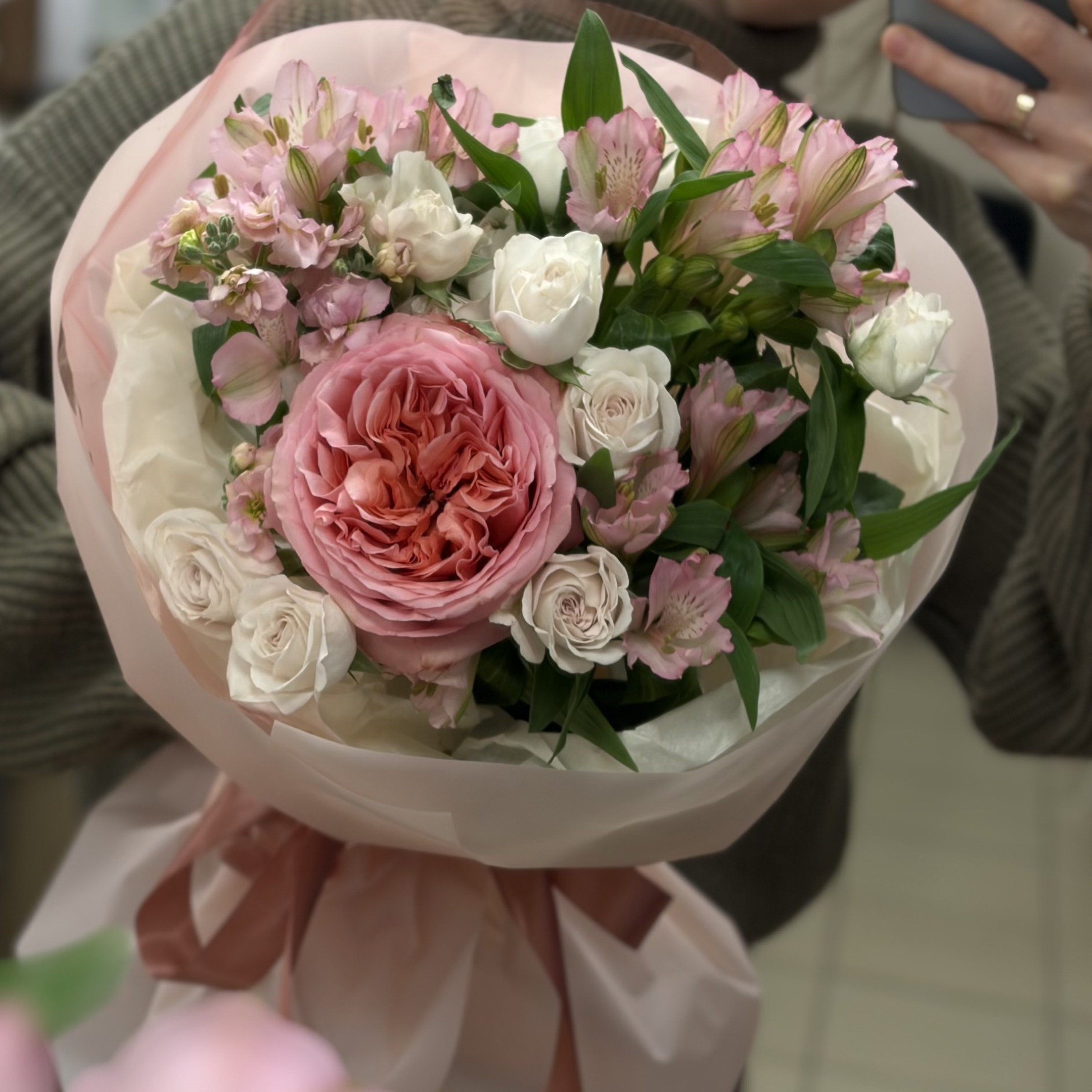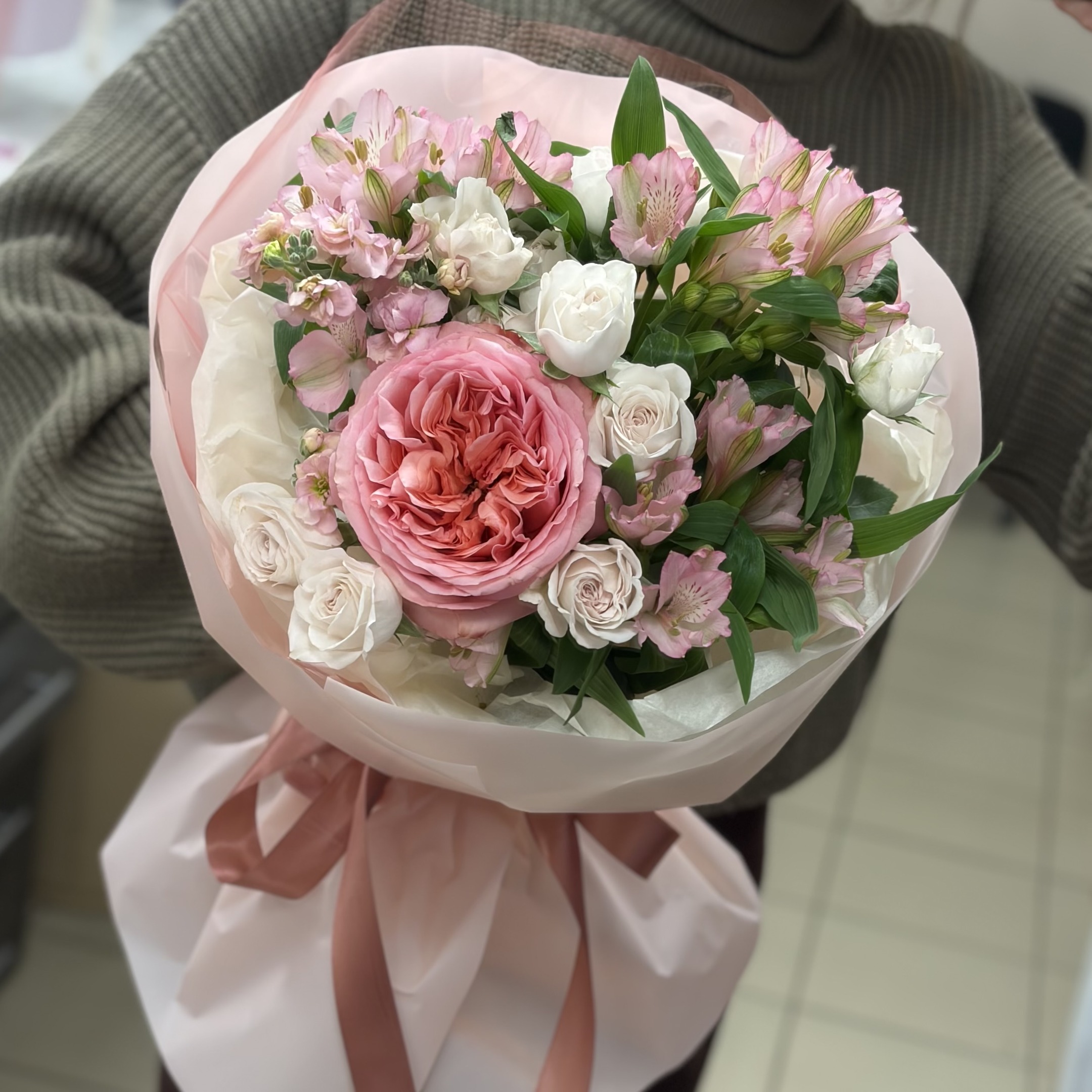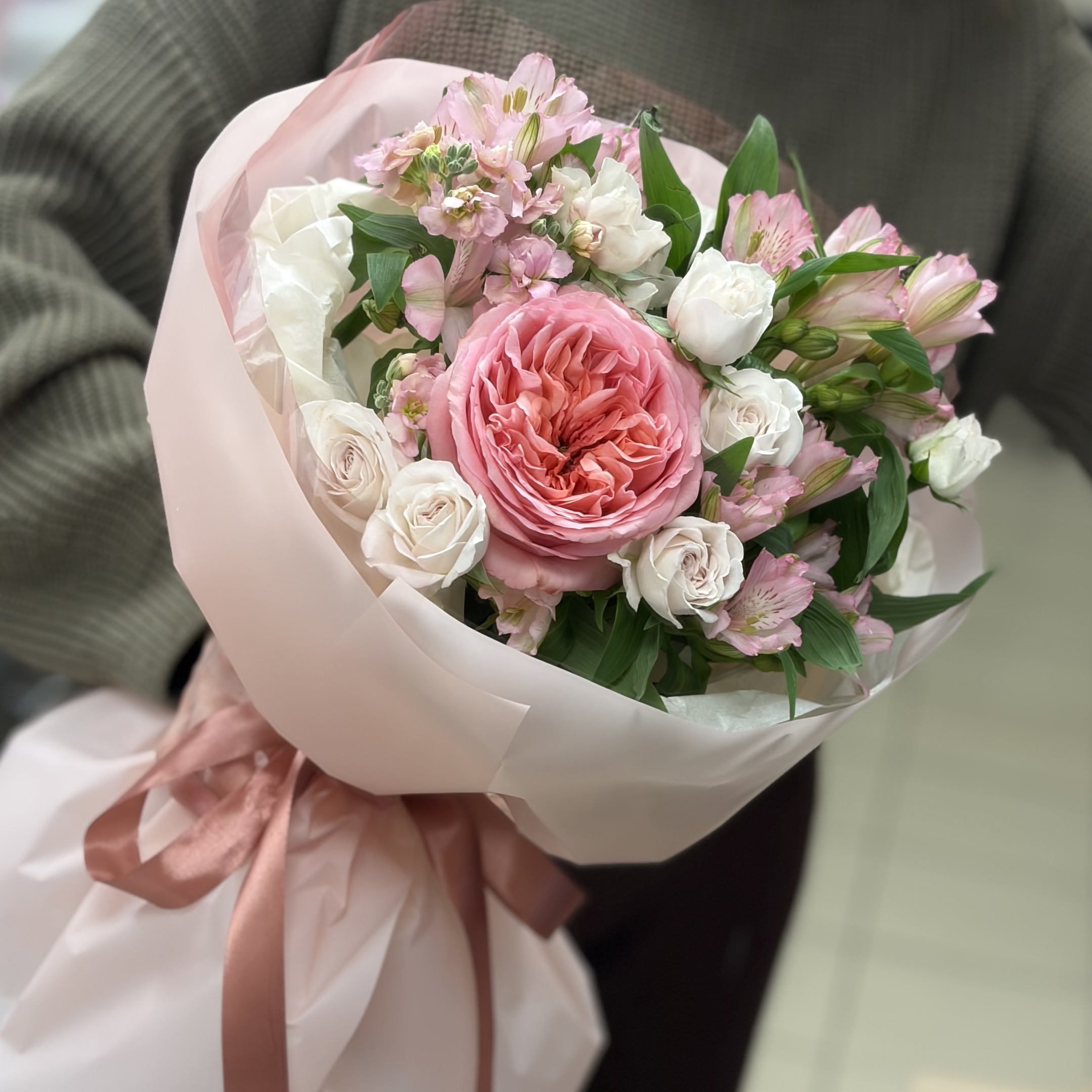Состав: 3 альстромерии, 1 Роза пионовидная, 3 кустовые розы, 1 маттиола и упаковка