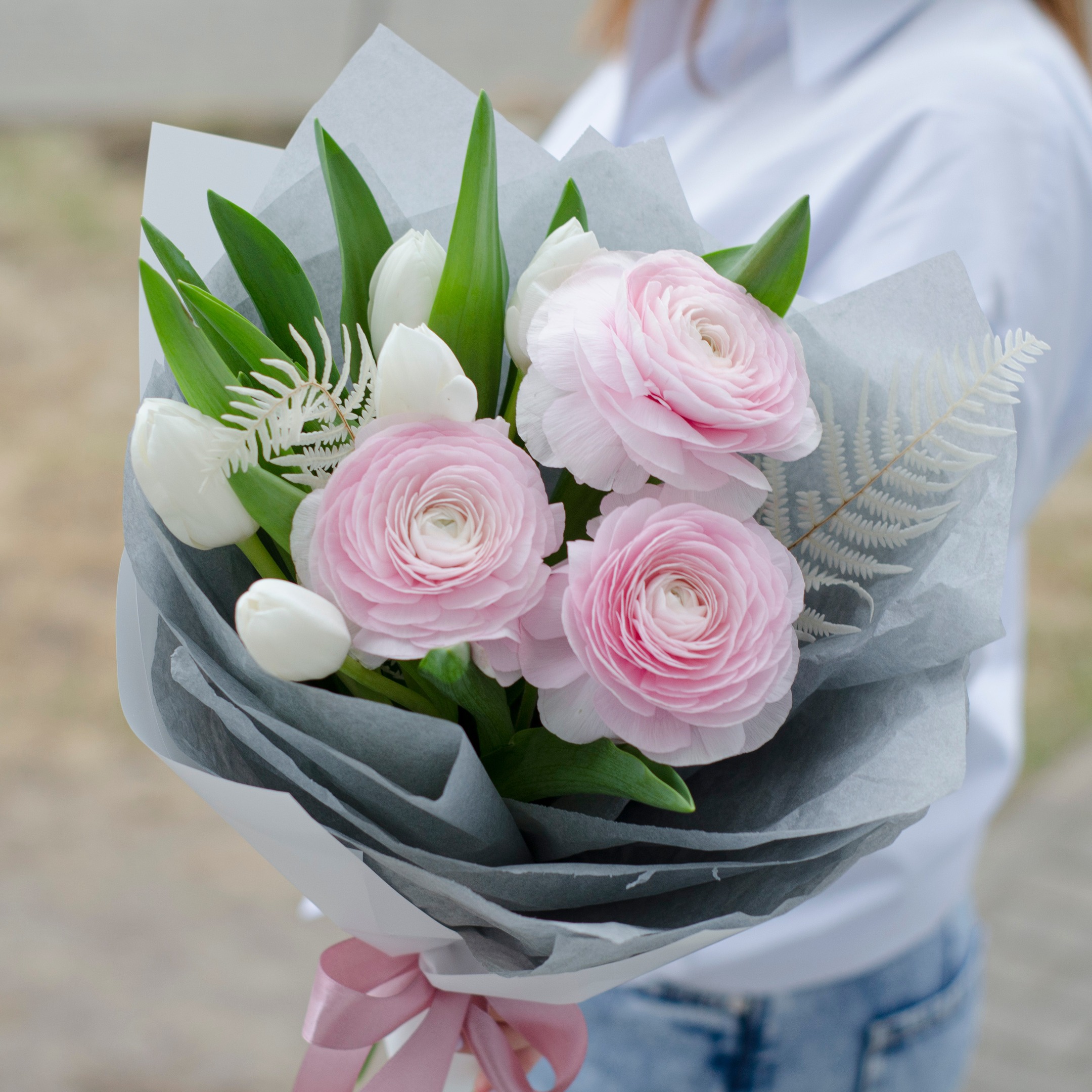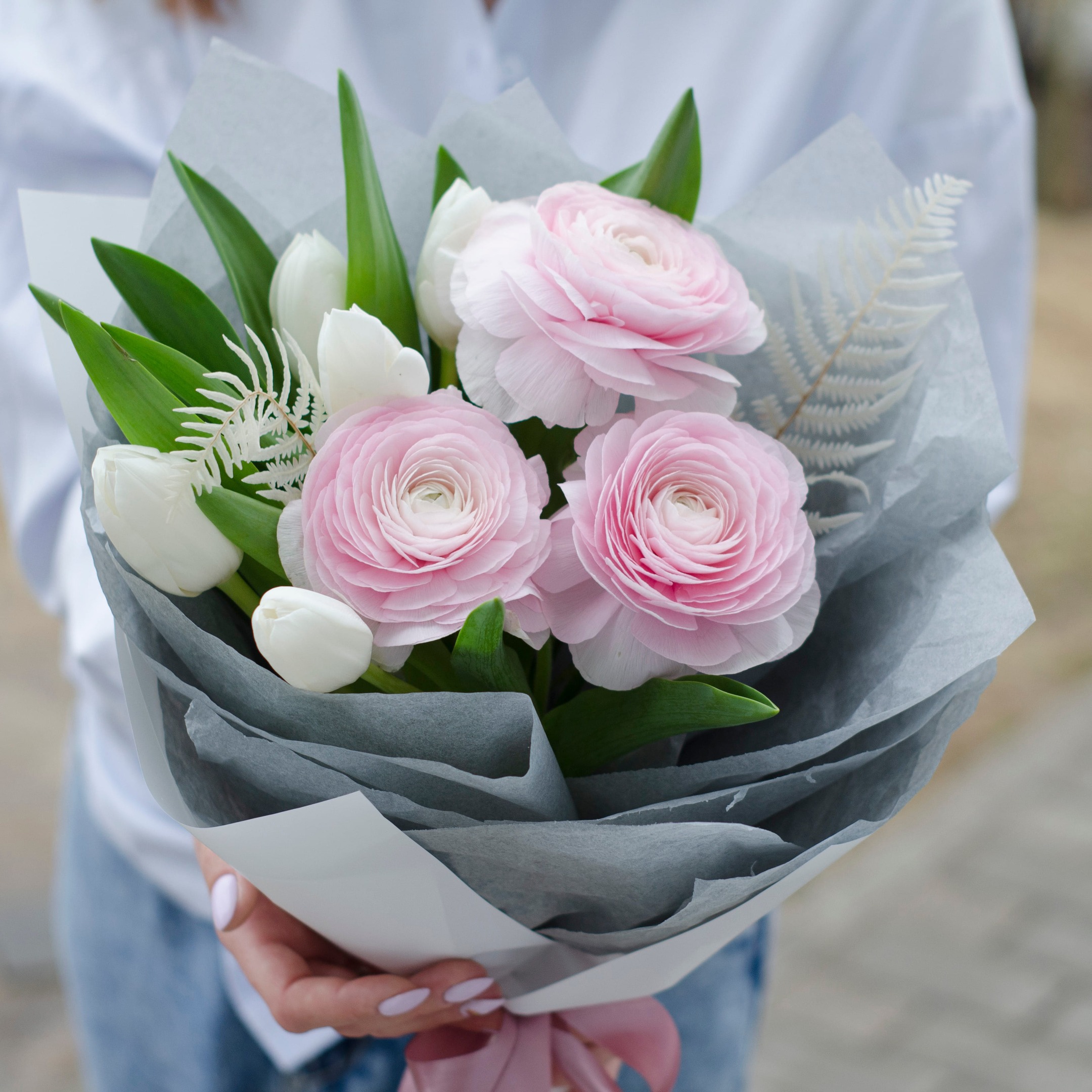 Состав: 3 ранункулюса, 5 тюльпанов, сухоцветы, упаковка