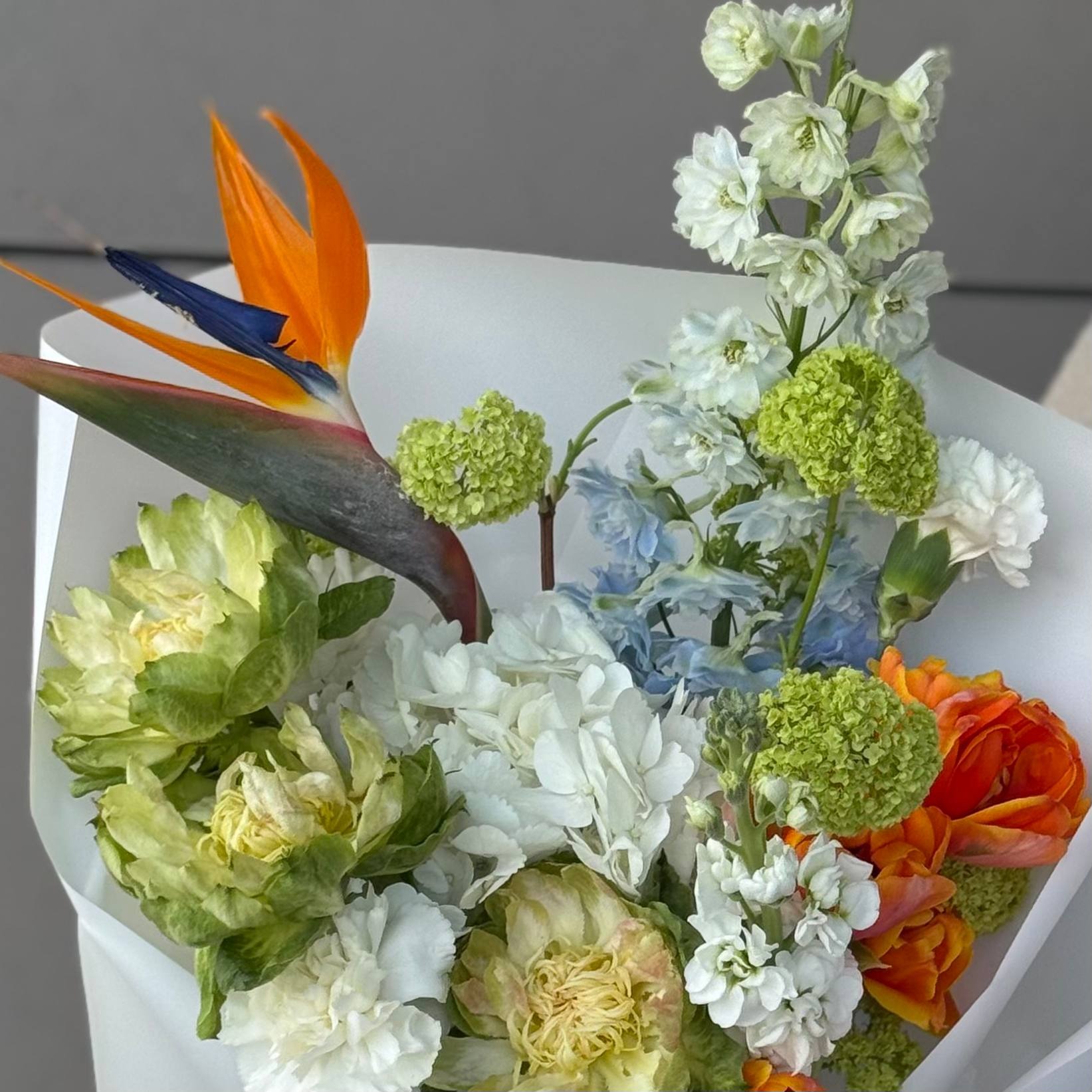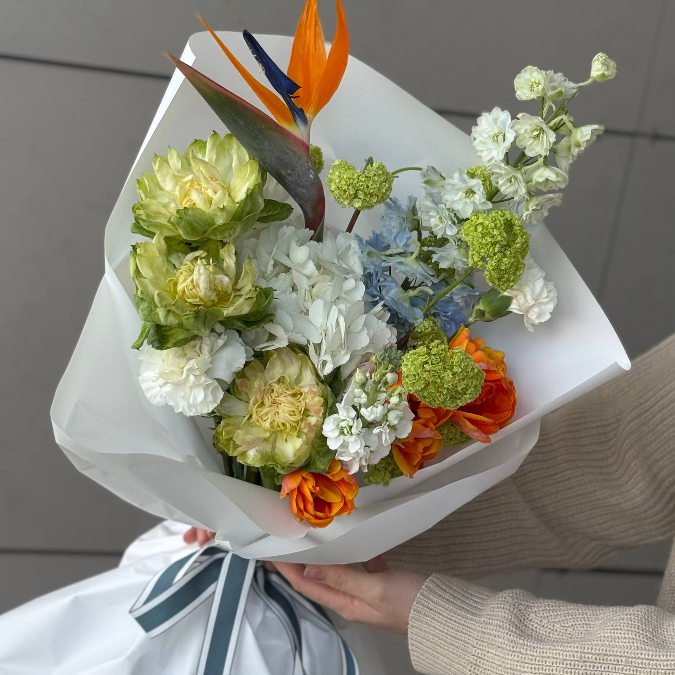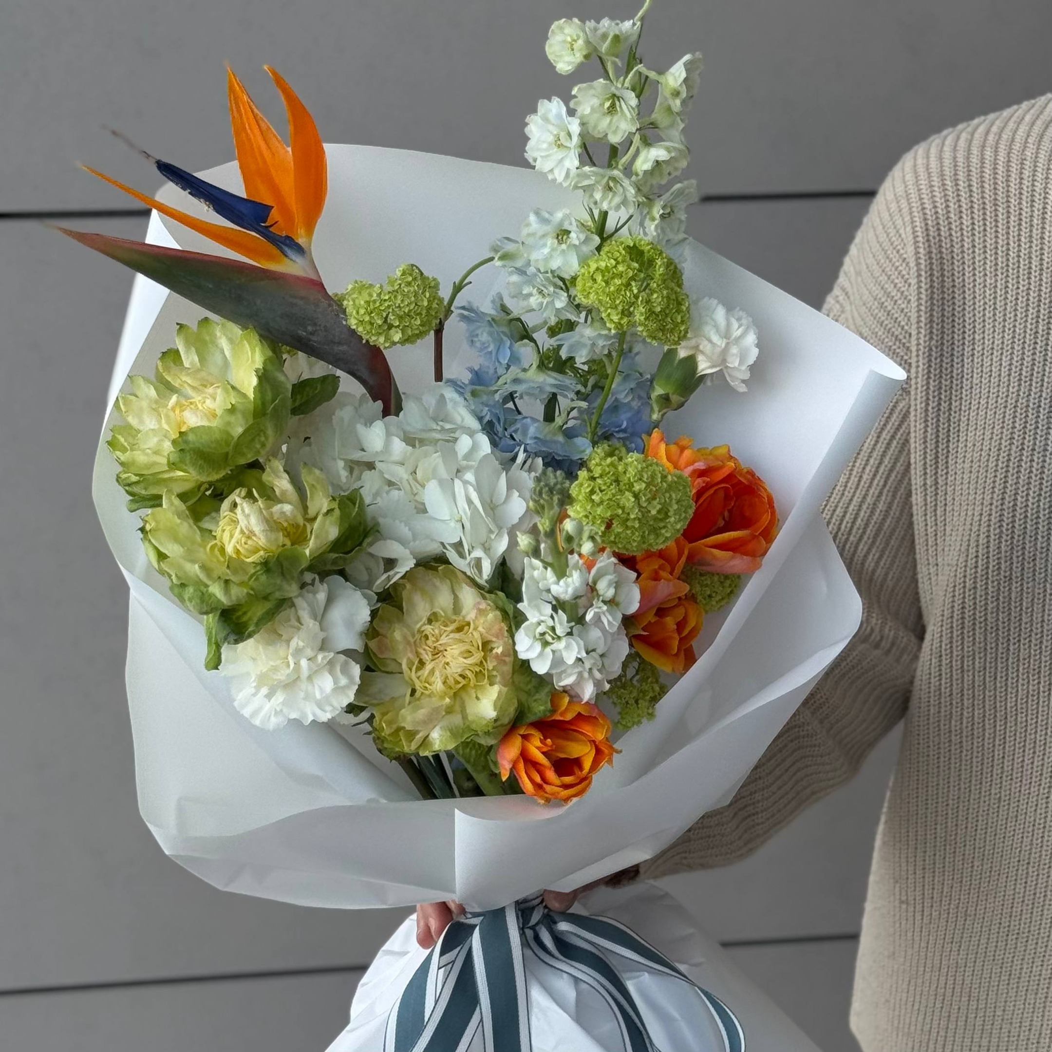 Состав: Стрелиция, Дельфиниум, 3 розы Вегги, 1 маттиола, 3 гвоздики, гортензия, 2 вибурнума, 3 тюльпана, упаковка