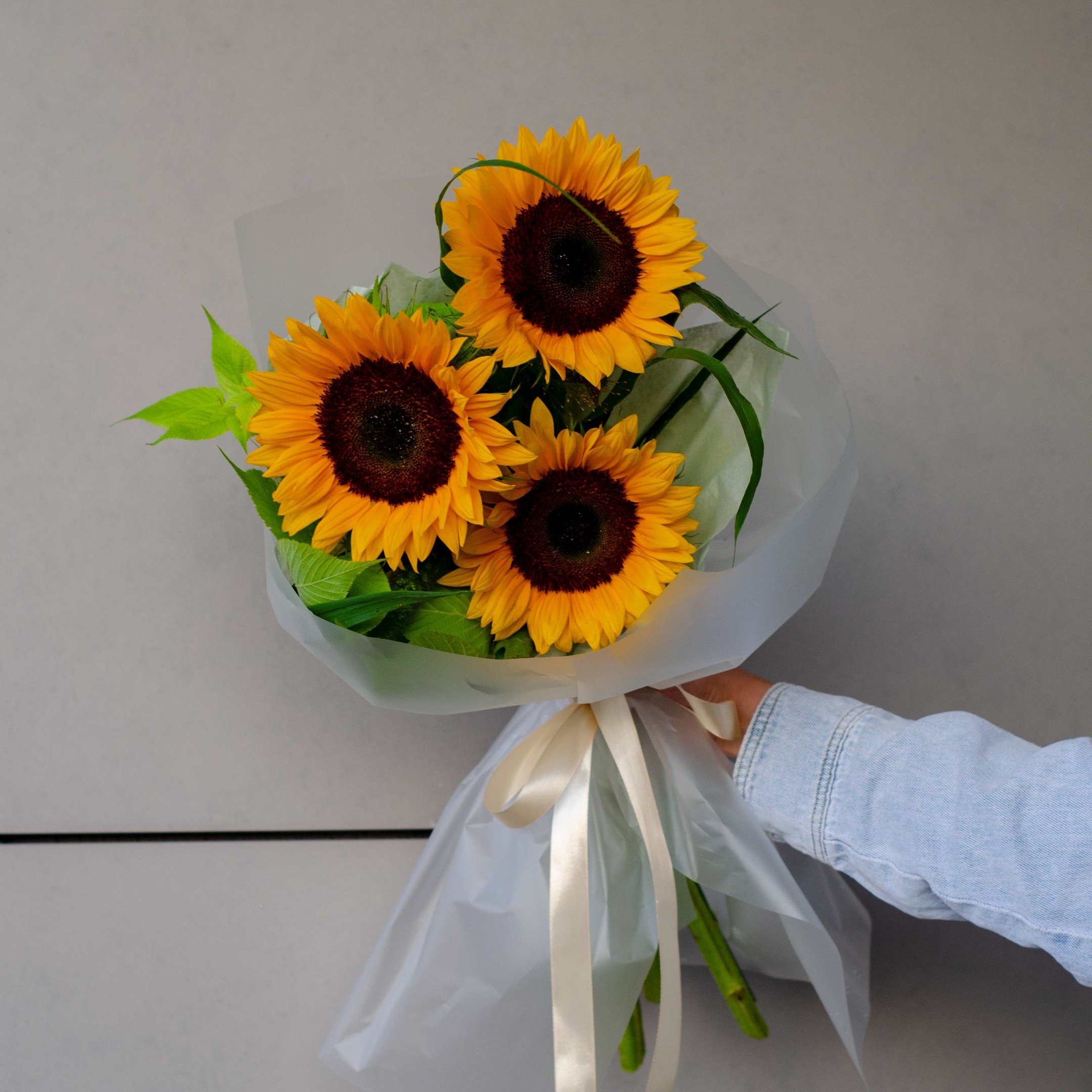 Состав: 3 подсолнуха, зелень, упаковка