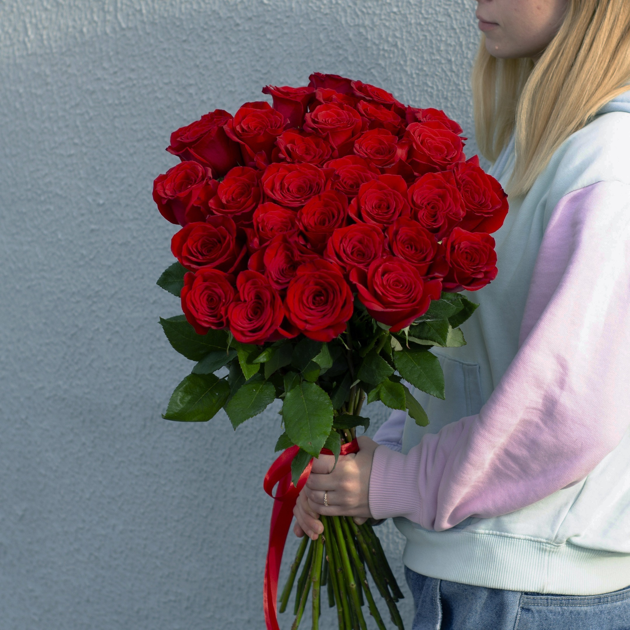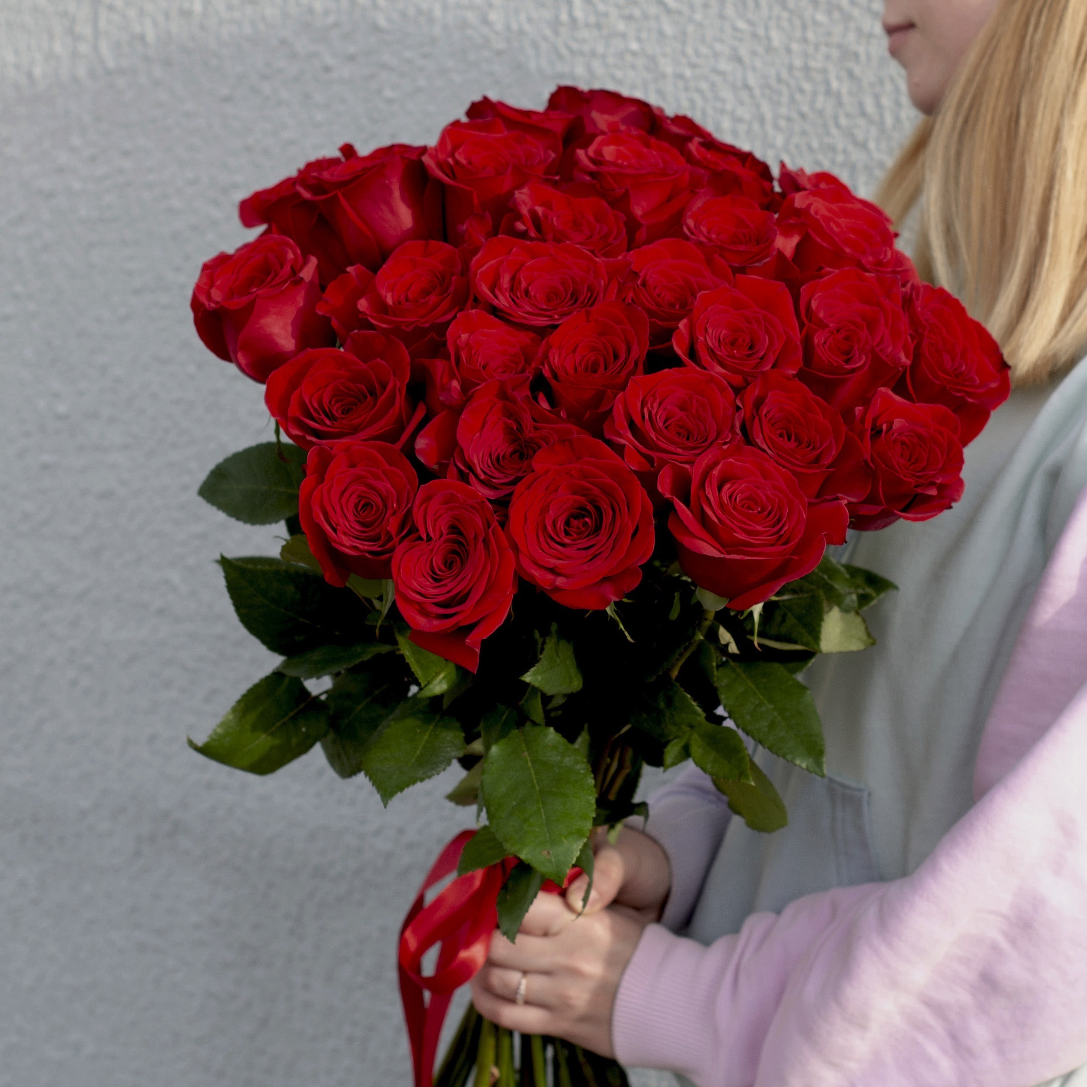 Букет из 31 красной розы перевязанный лентой