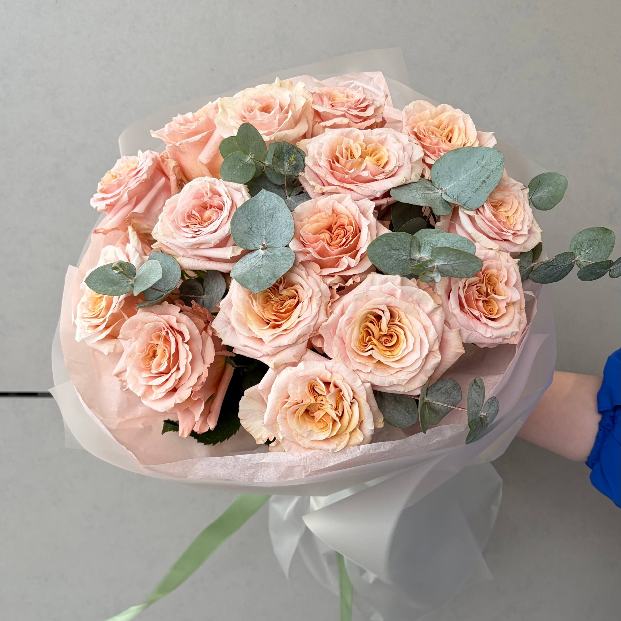 Состав: 15 роз Шиммер, 2 эвкалипта и упаковка